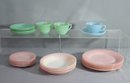Group Lot Of Pink, Blue, And Green Fire King Plates, Cups, Saucers