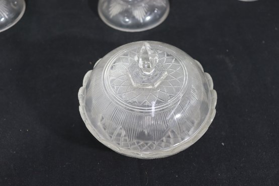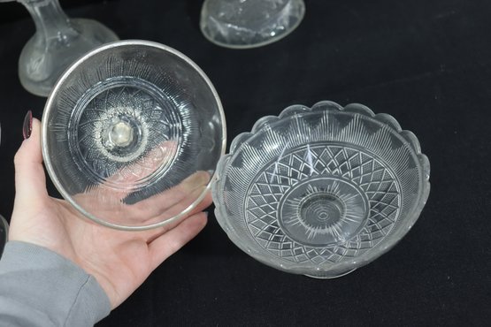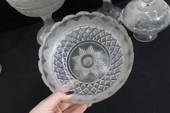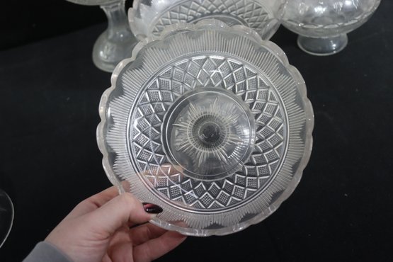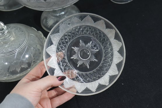 a group lot of pressed glass serving pieces, featuring a coordinated assortment of bowls, pedestal dishes, covered containers, and small plates. The pieces display classic pressed glass patterns with scalloped rims, geometric motifs, and decorative finials.
