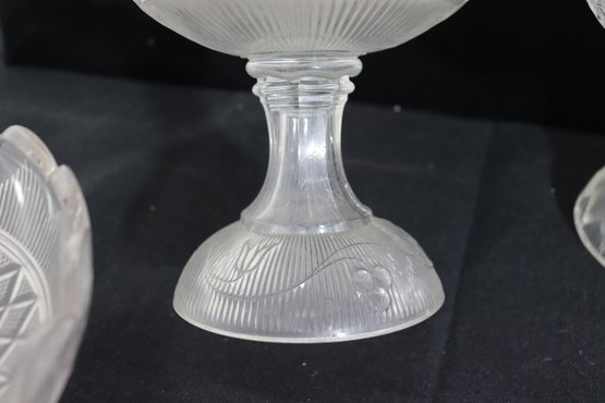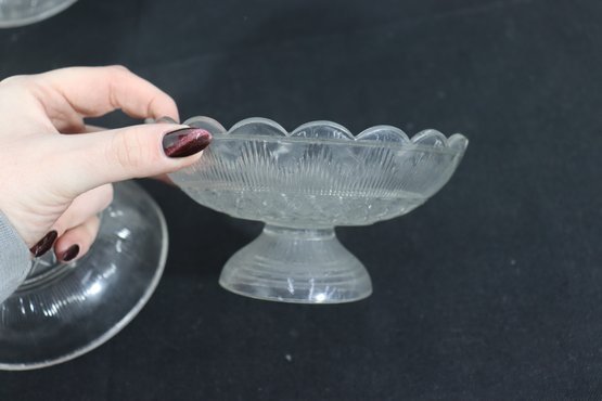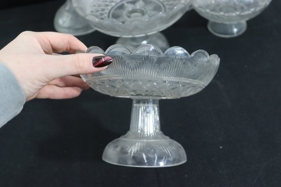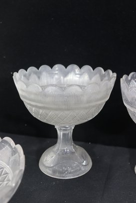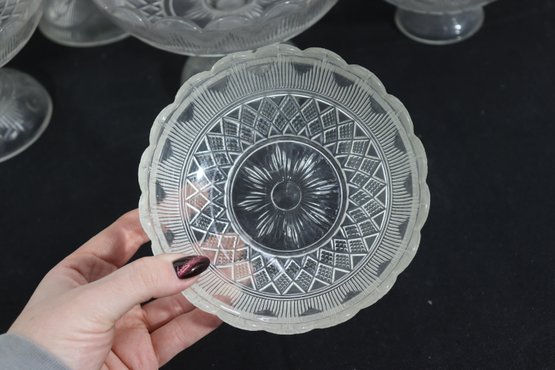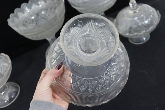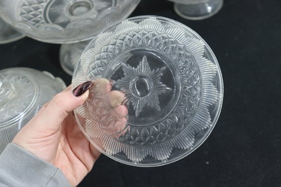 This matching-style group makes a lovely presentation for entertaining, dessert service, or decorative display, and is well suited for collectors or those looking to build a cohesive pressed glass set.