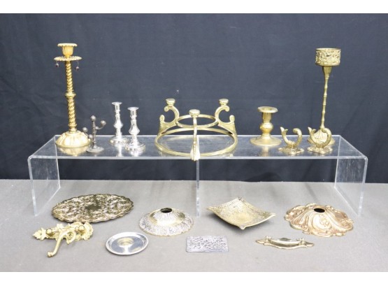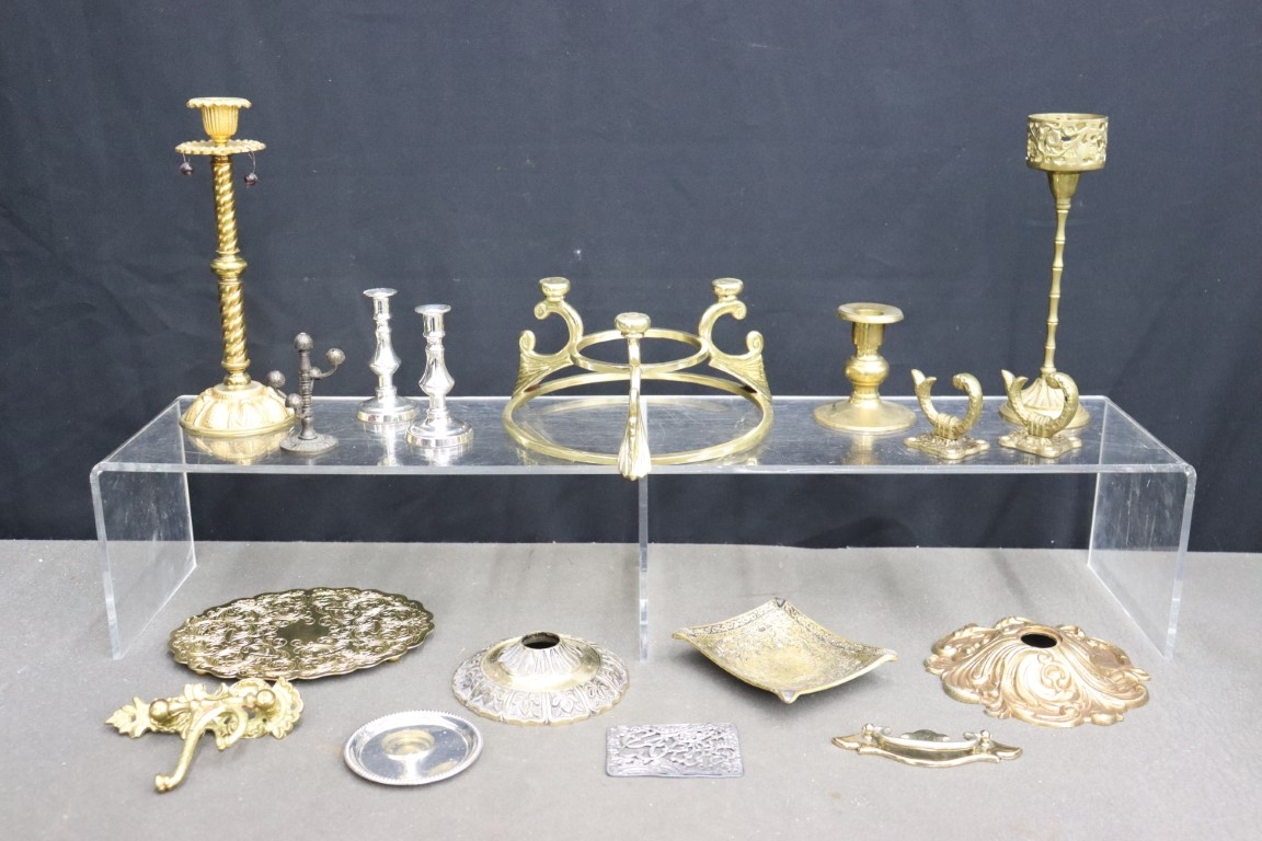 Group Lot Of Varies Brass And Metal Candlestick Holders, Pulls, Hooks, Plates And More