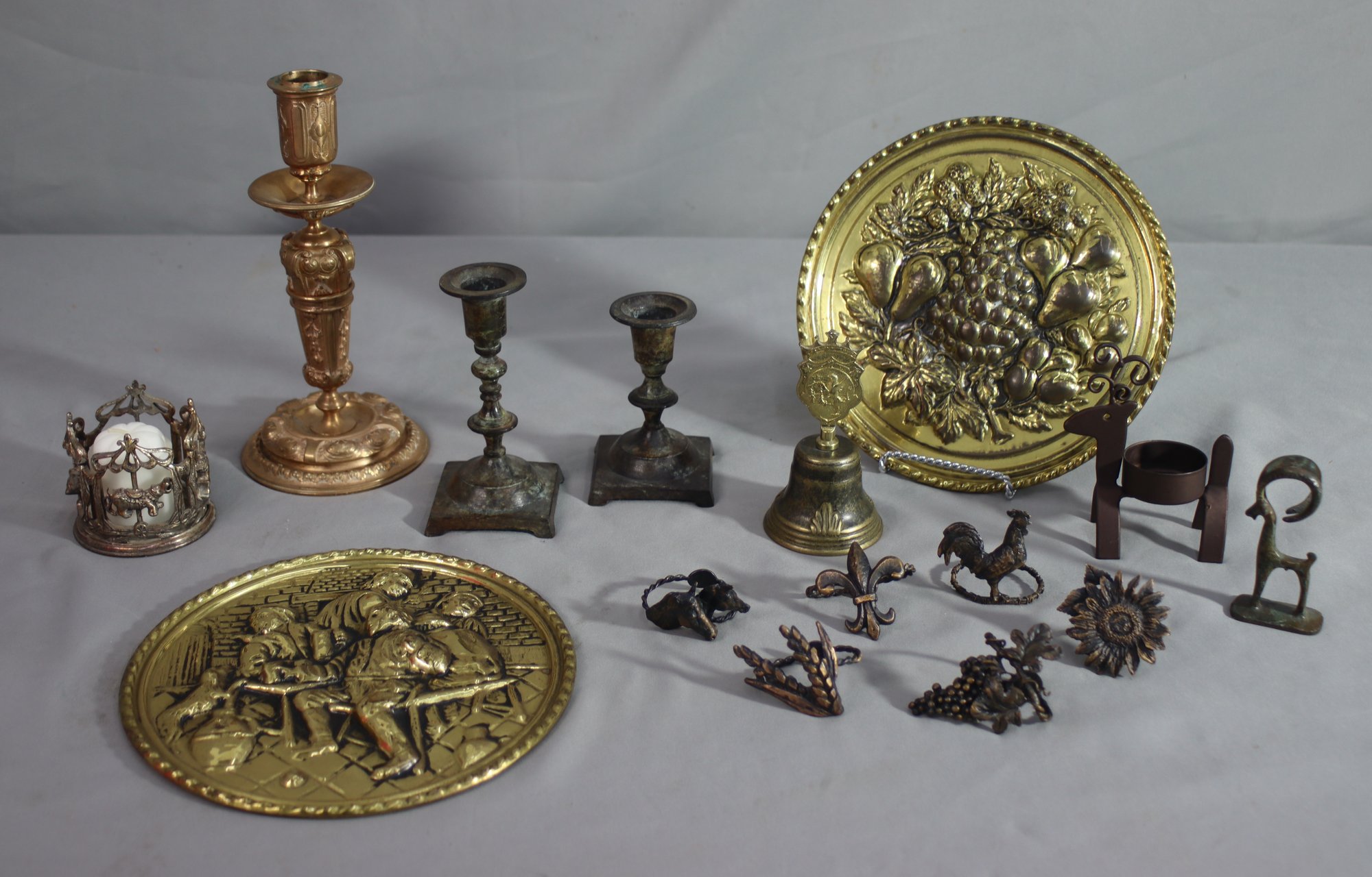 Group Lot Of Vintage Mixed Metal Candlesticks, Napkin Rings, And More
