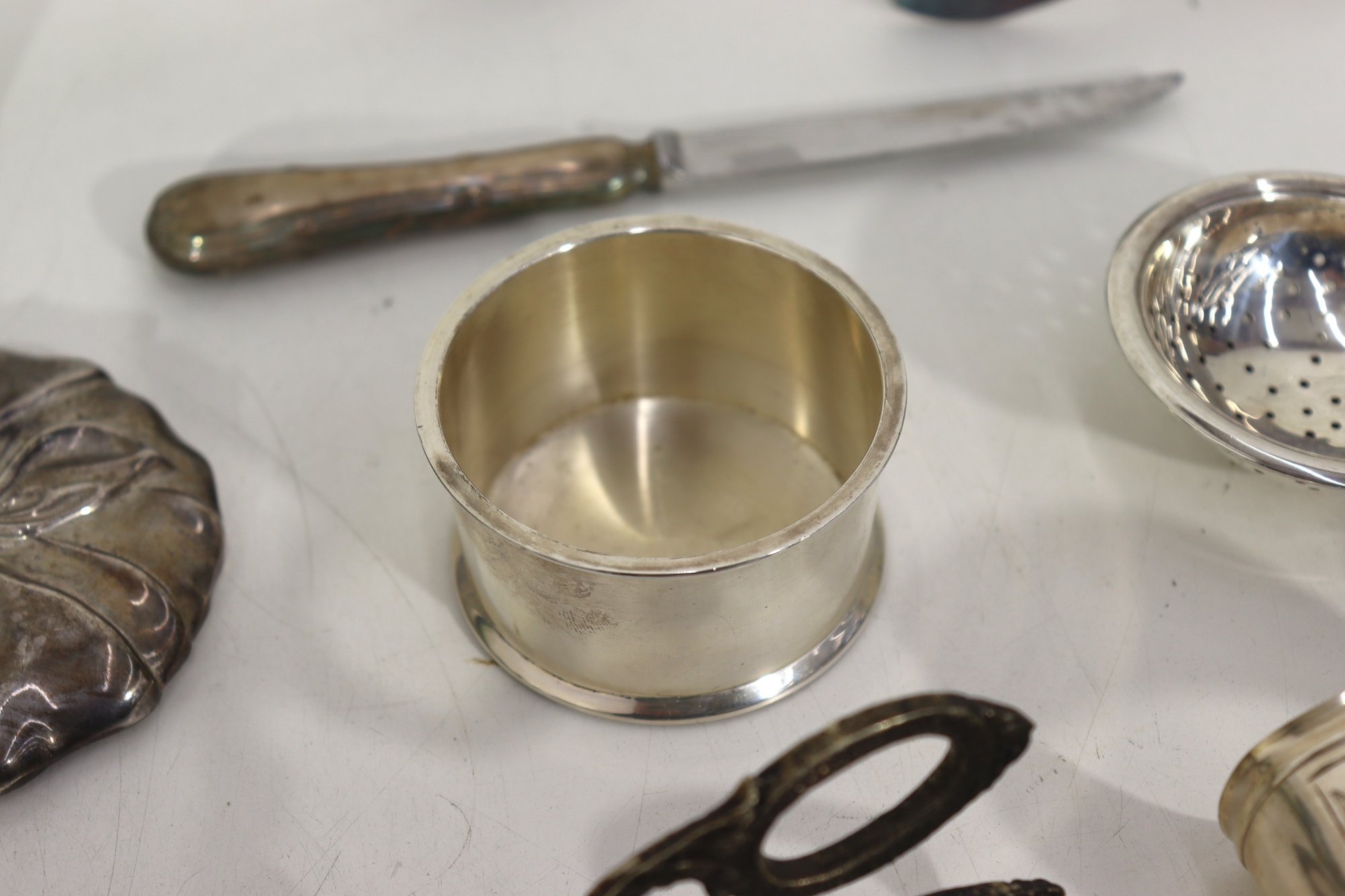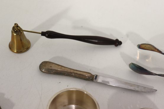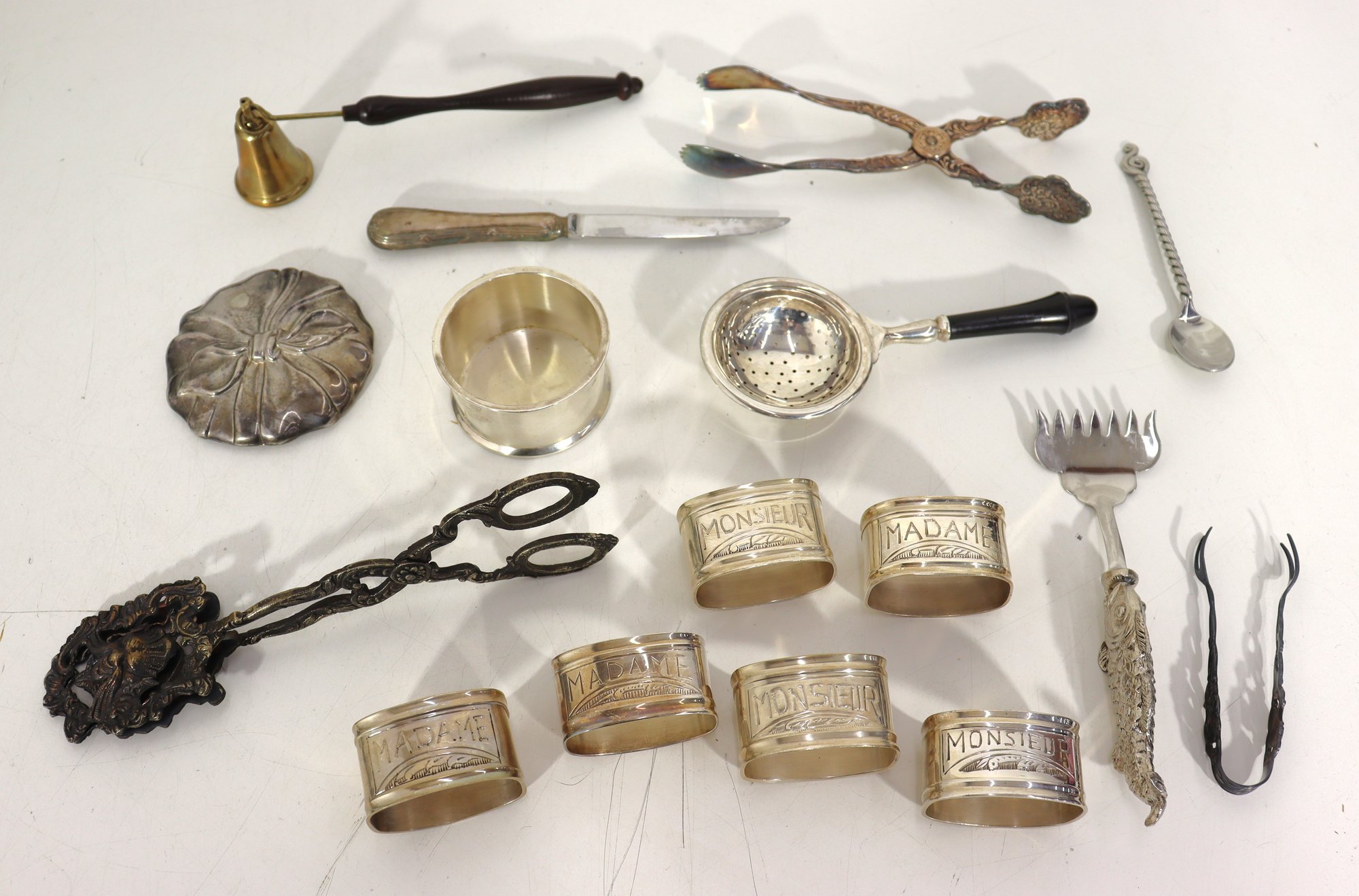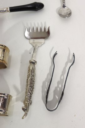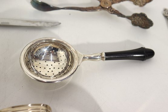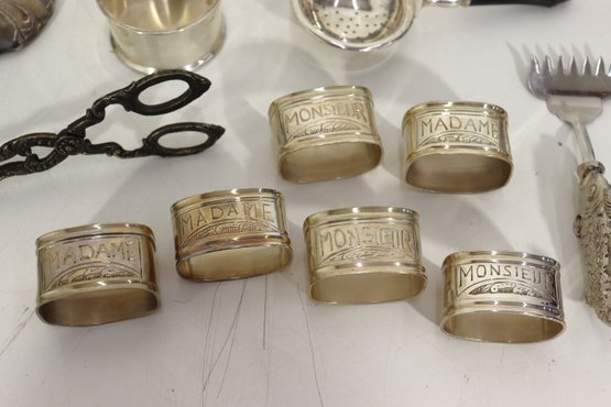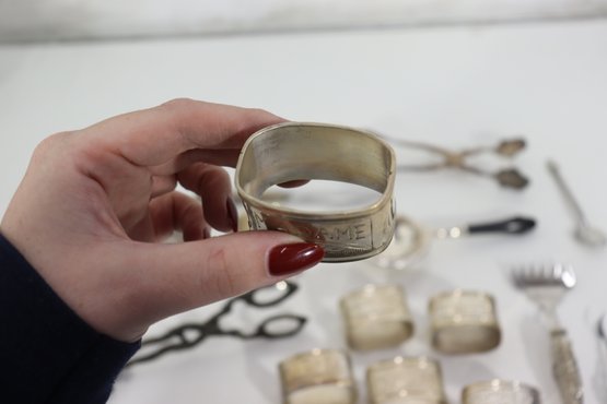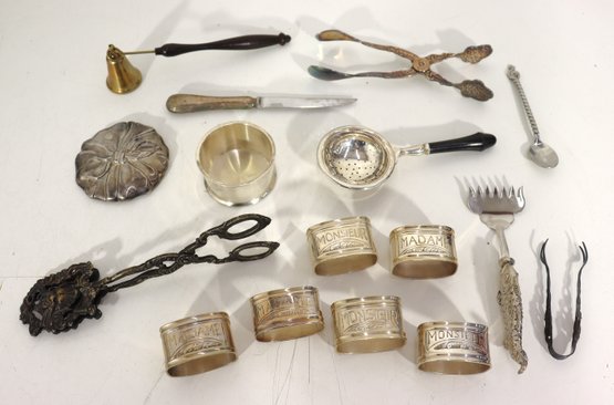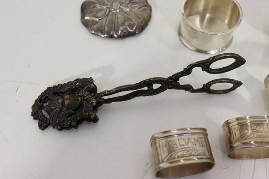 Group Lot Of Vintage Silverplate Tableware & Utensils Napkin Rings, Tongs, Tea Strainer & More