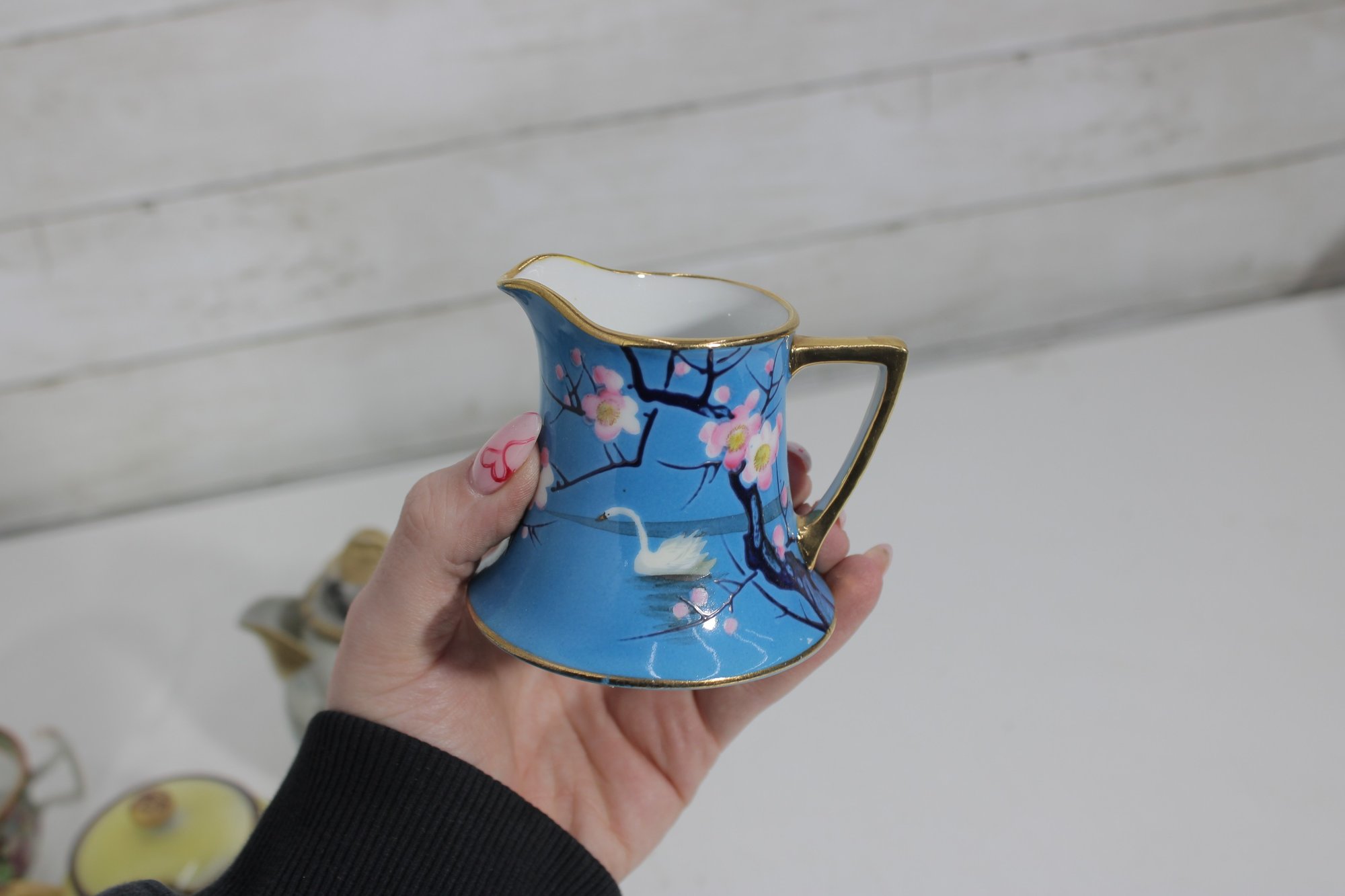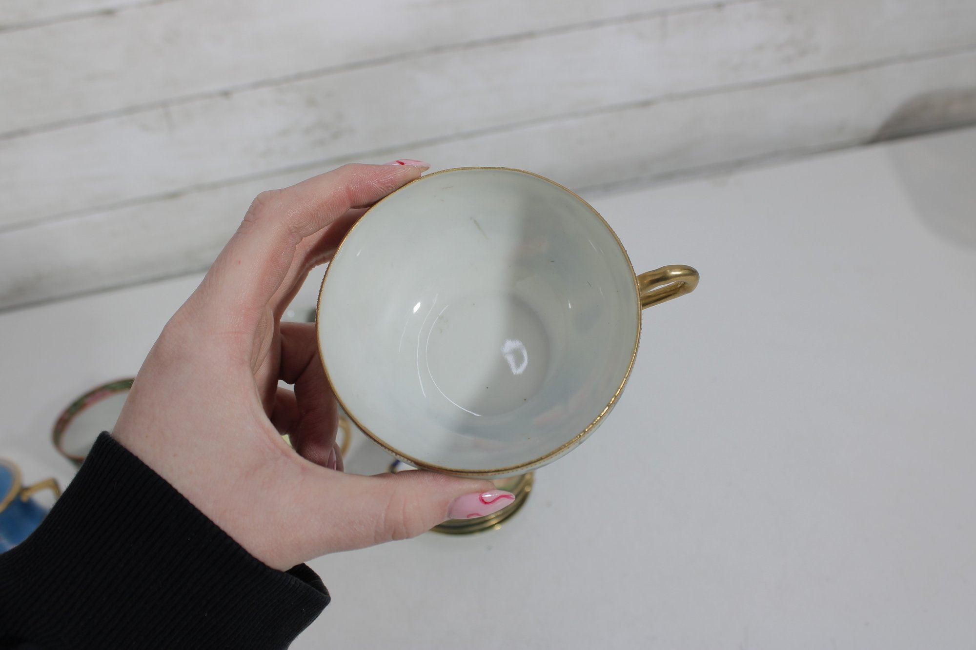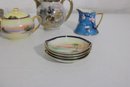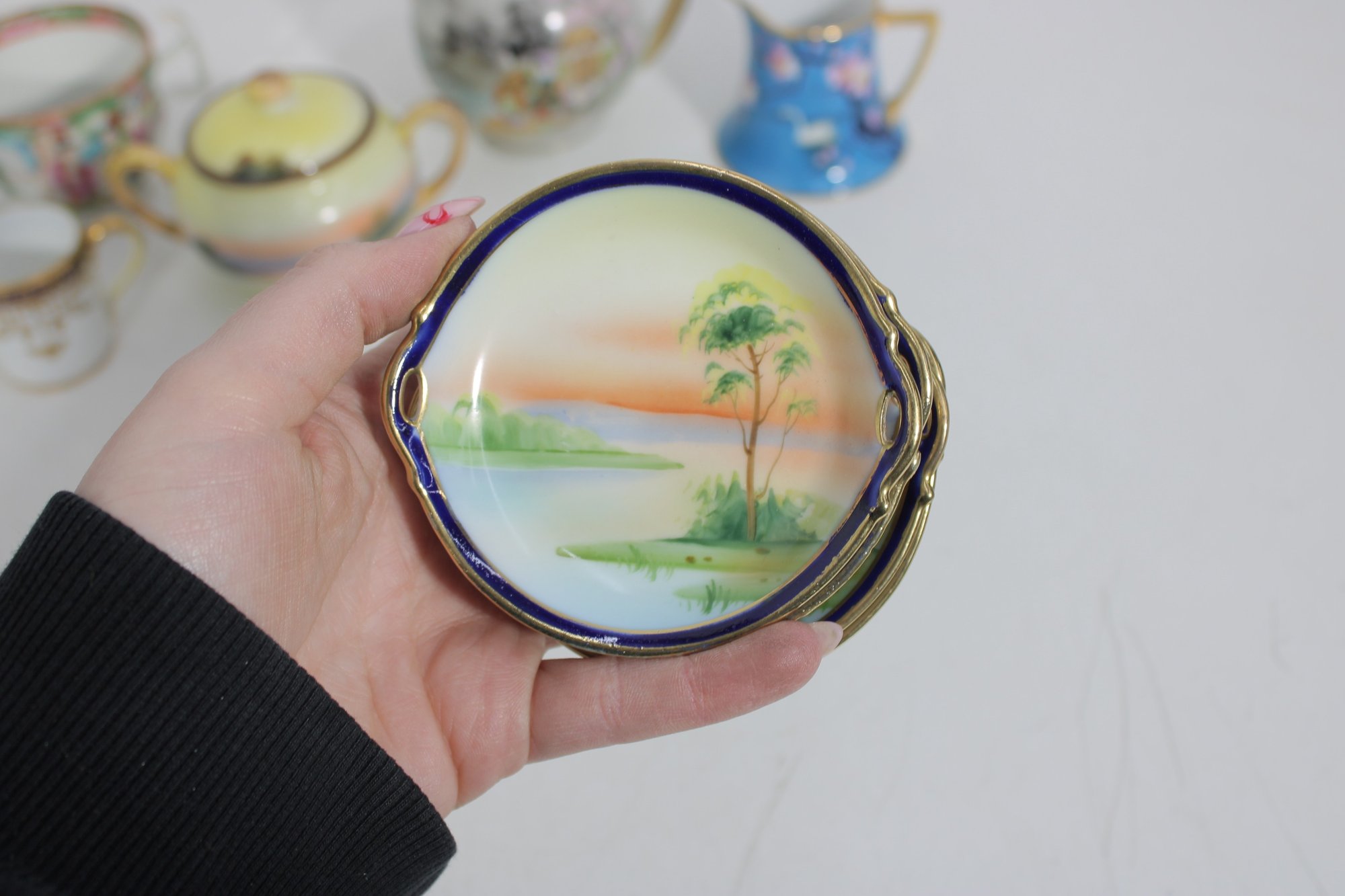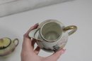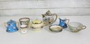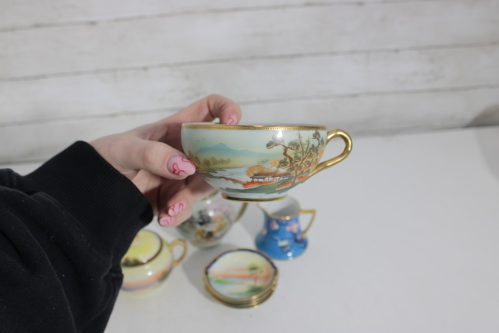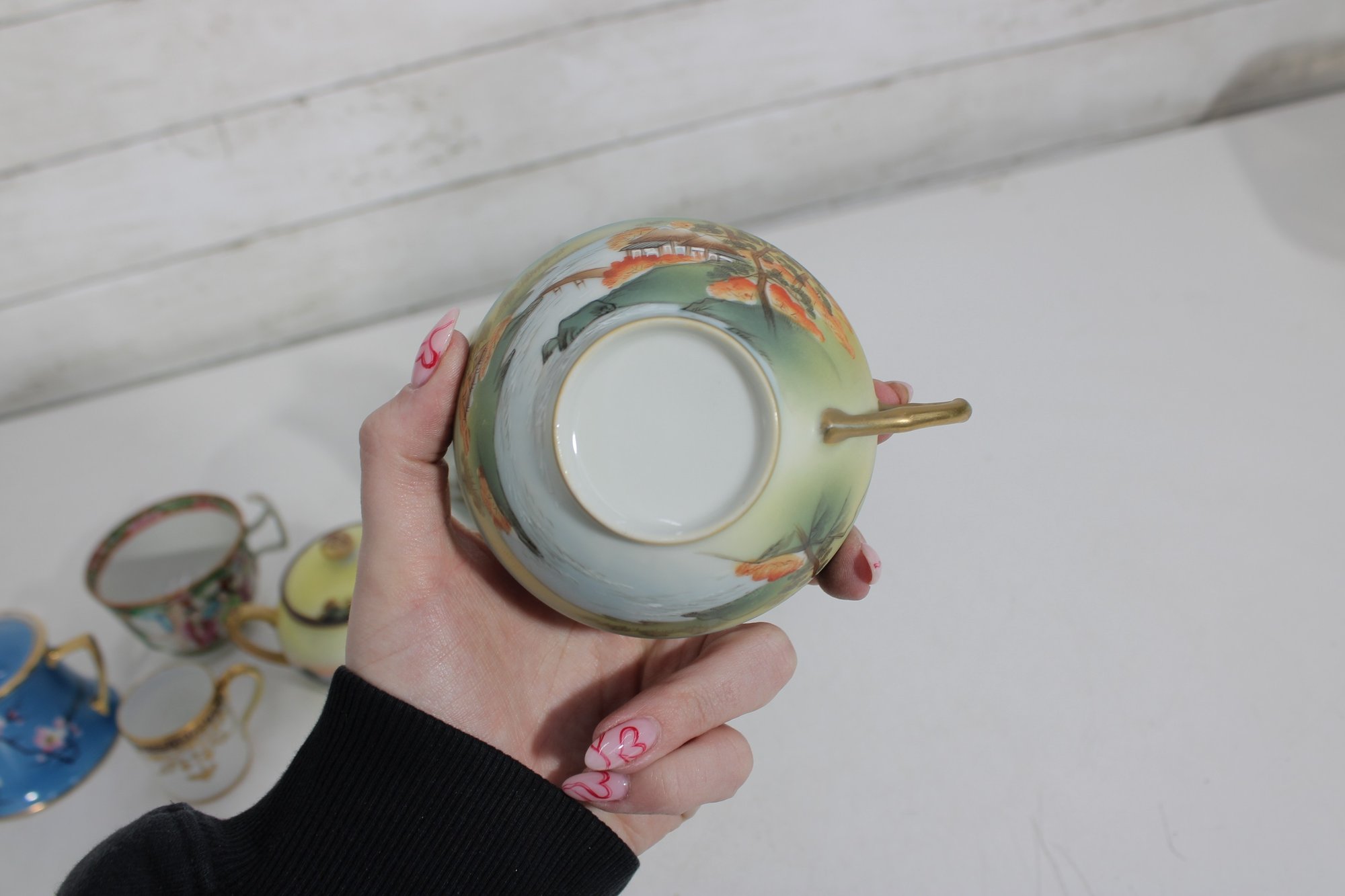 a mixed group lot of vintage porcelain and china tea wares, including teapots, tea cups, saucers, and small serving pieces in a variety of decorative patterns and colors. The assortment includes floral, figural, and hand-painted style designs with gilt and colored accents.