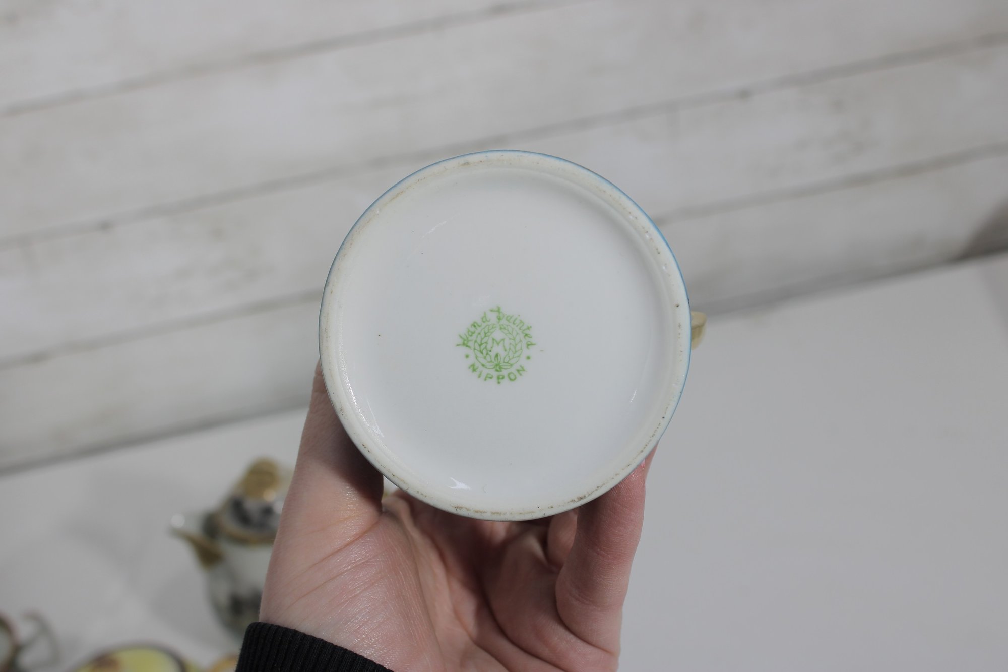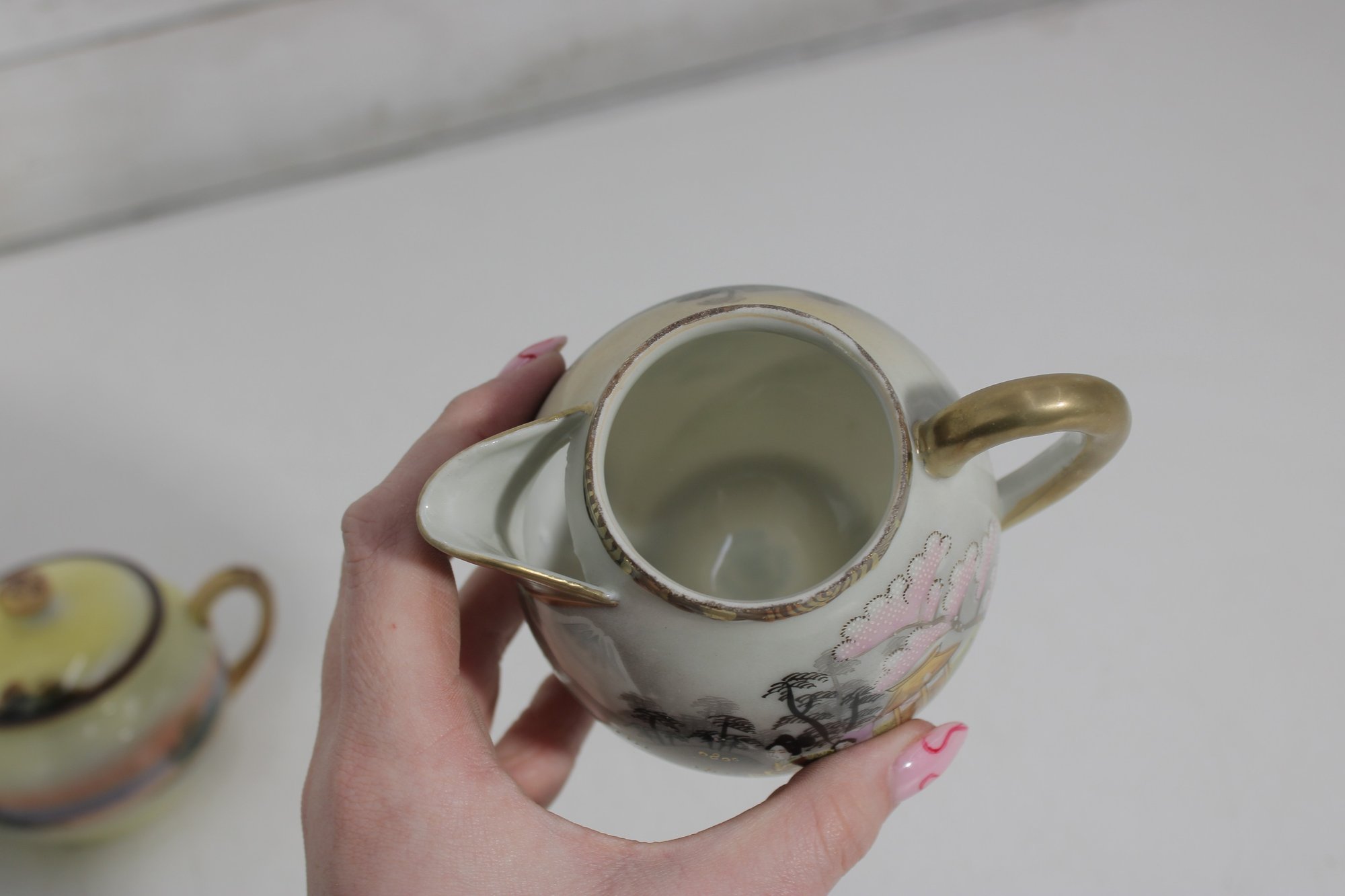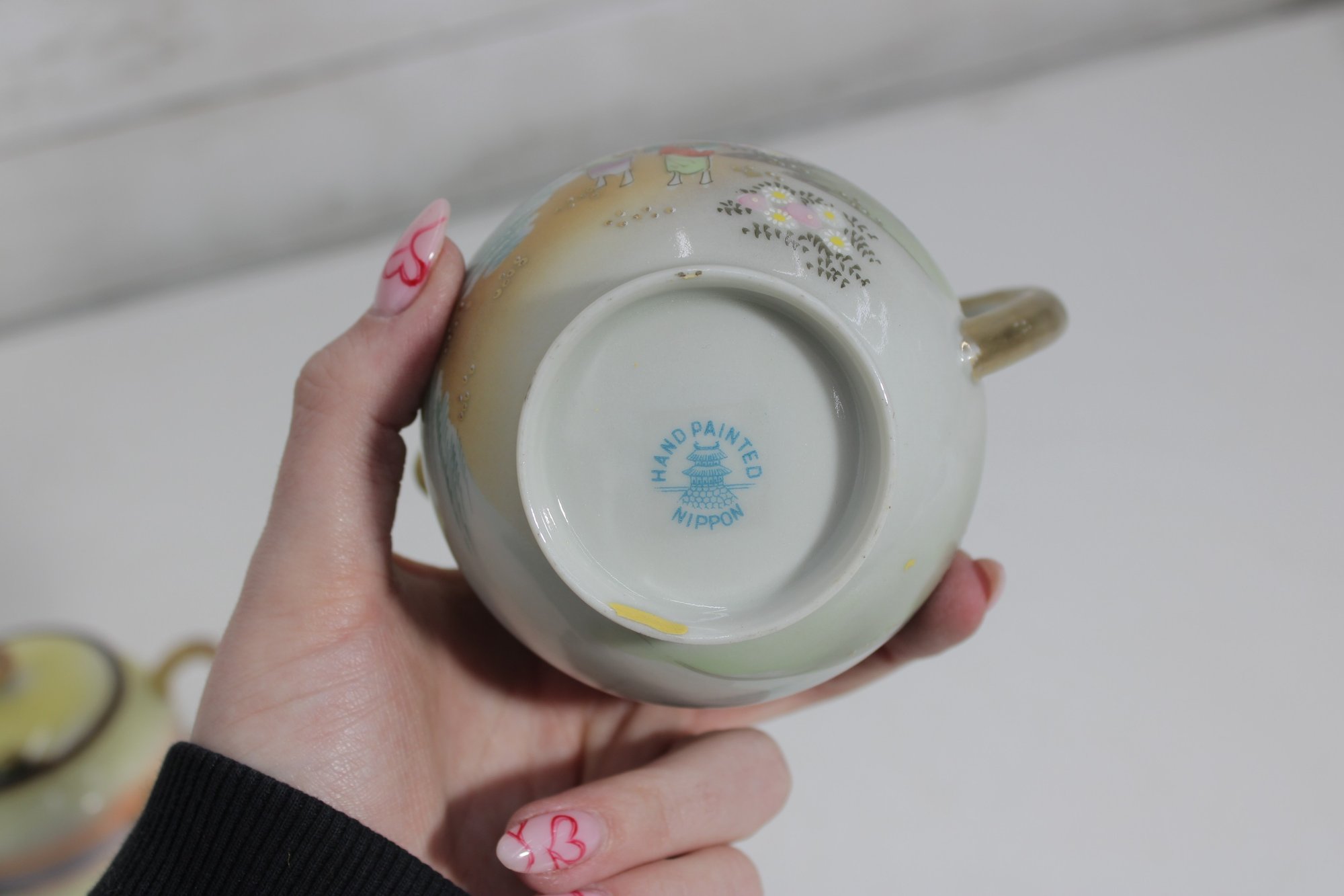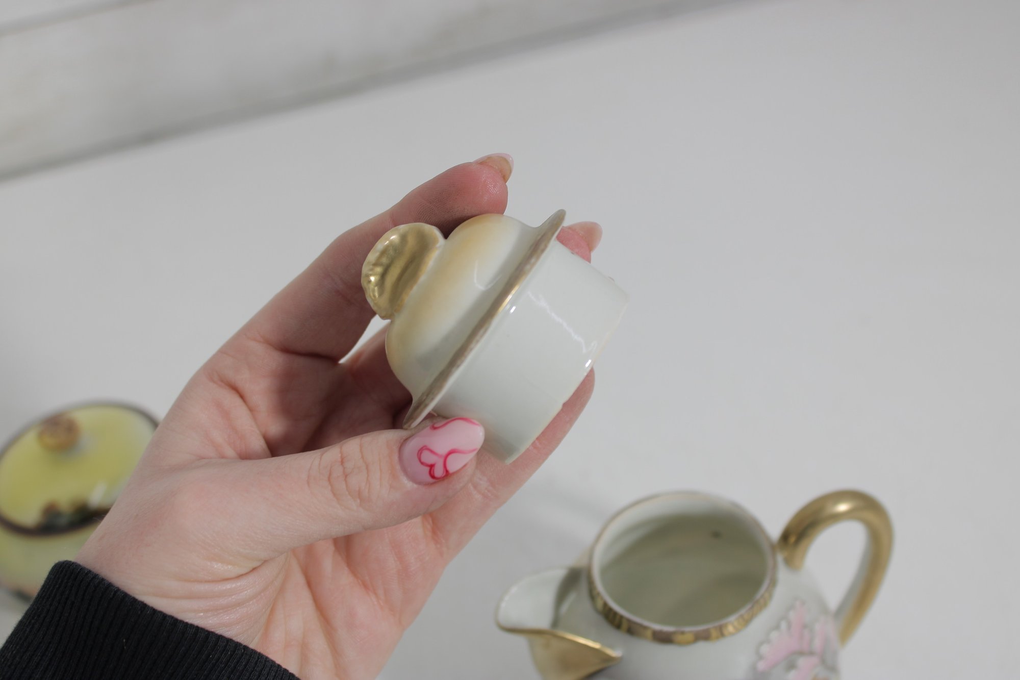 a mixed group lot of vintage porcelain and china tea wares, including teapots, tea cups, saucers, and small serving pieces in a variety of decorative patterns and colors. The assortment includes floral, figural, and hand-painted style designs with gilt and colored accents.
