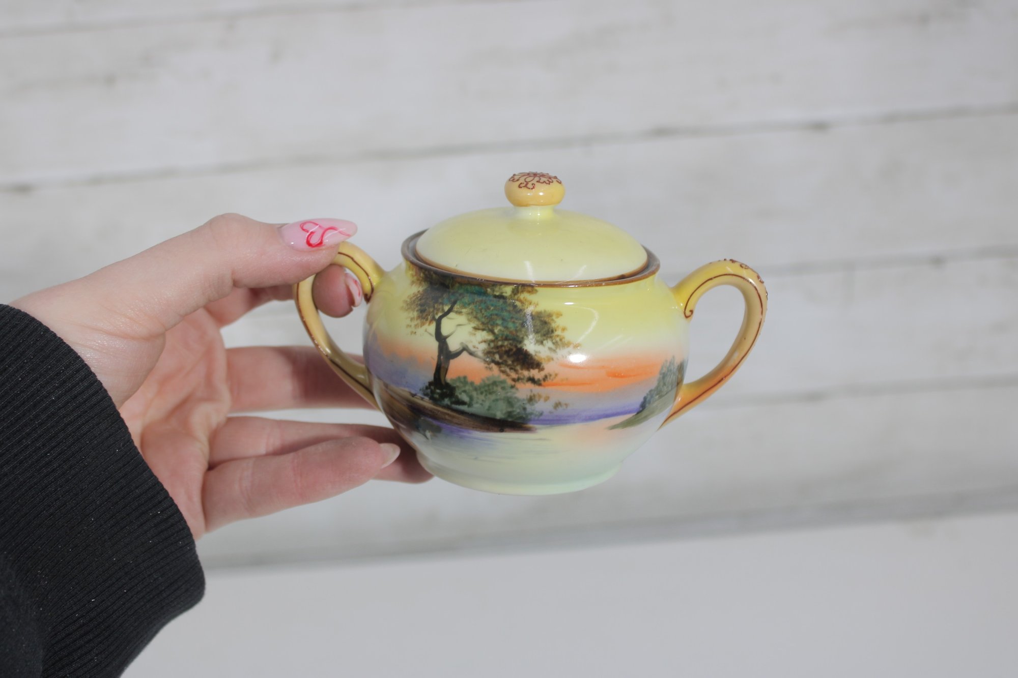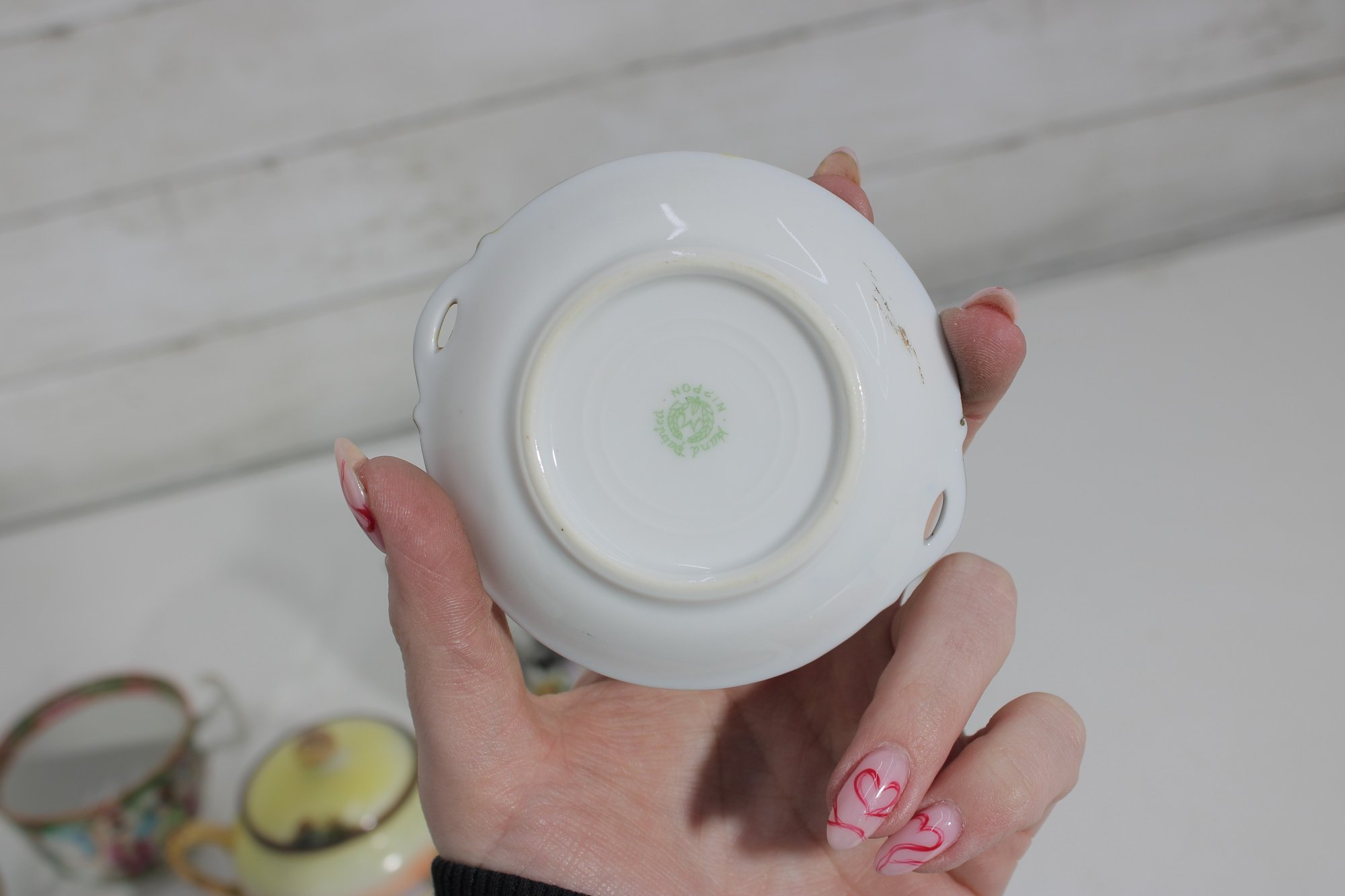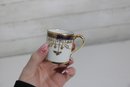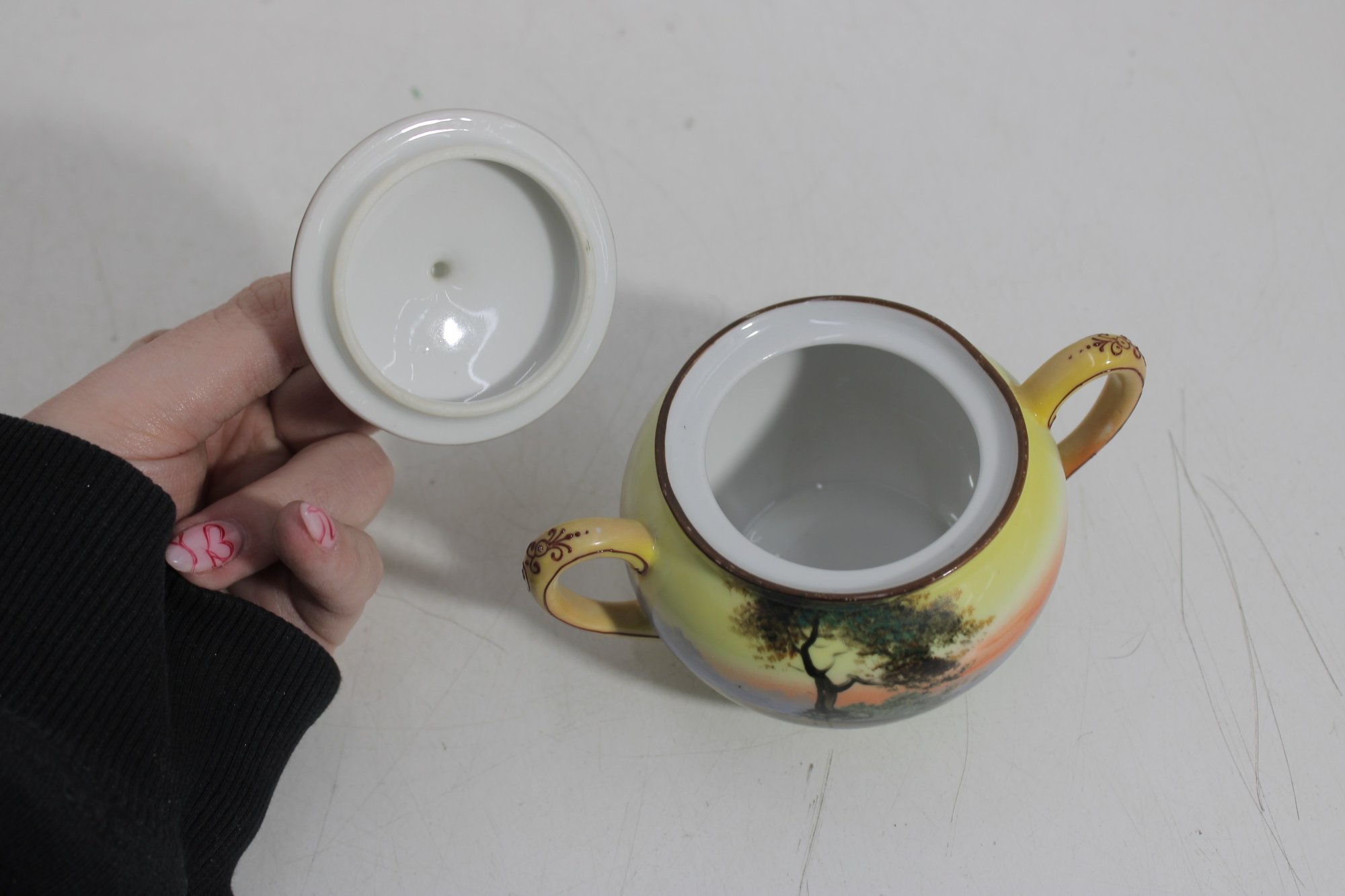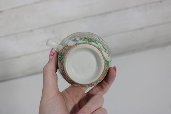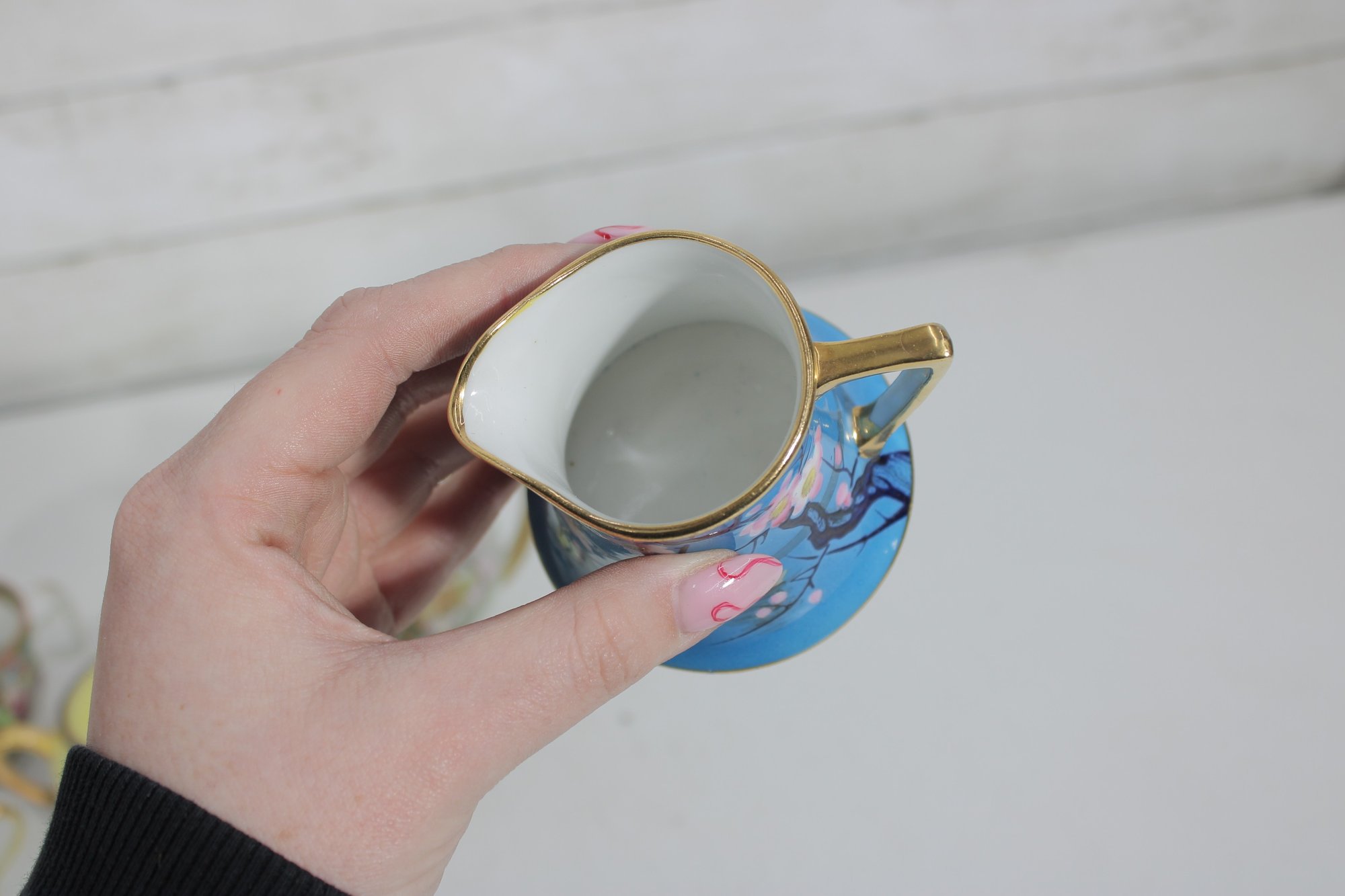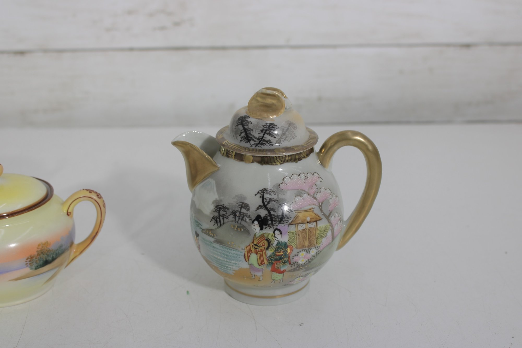 a mixed group lot of vintage porcelain and china tea wares, including teapots, tea cups, saucers, and small serving pieces in a variety of decorative patterns and colors. The assortment includes floral, figural, and hand-painted style designs with gilt and colored accents.
