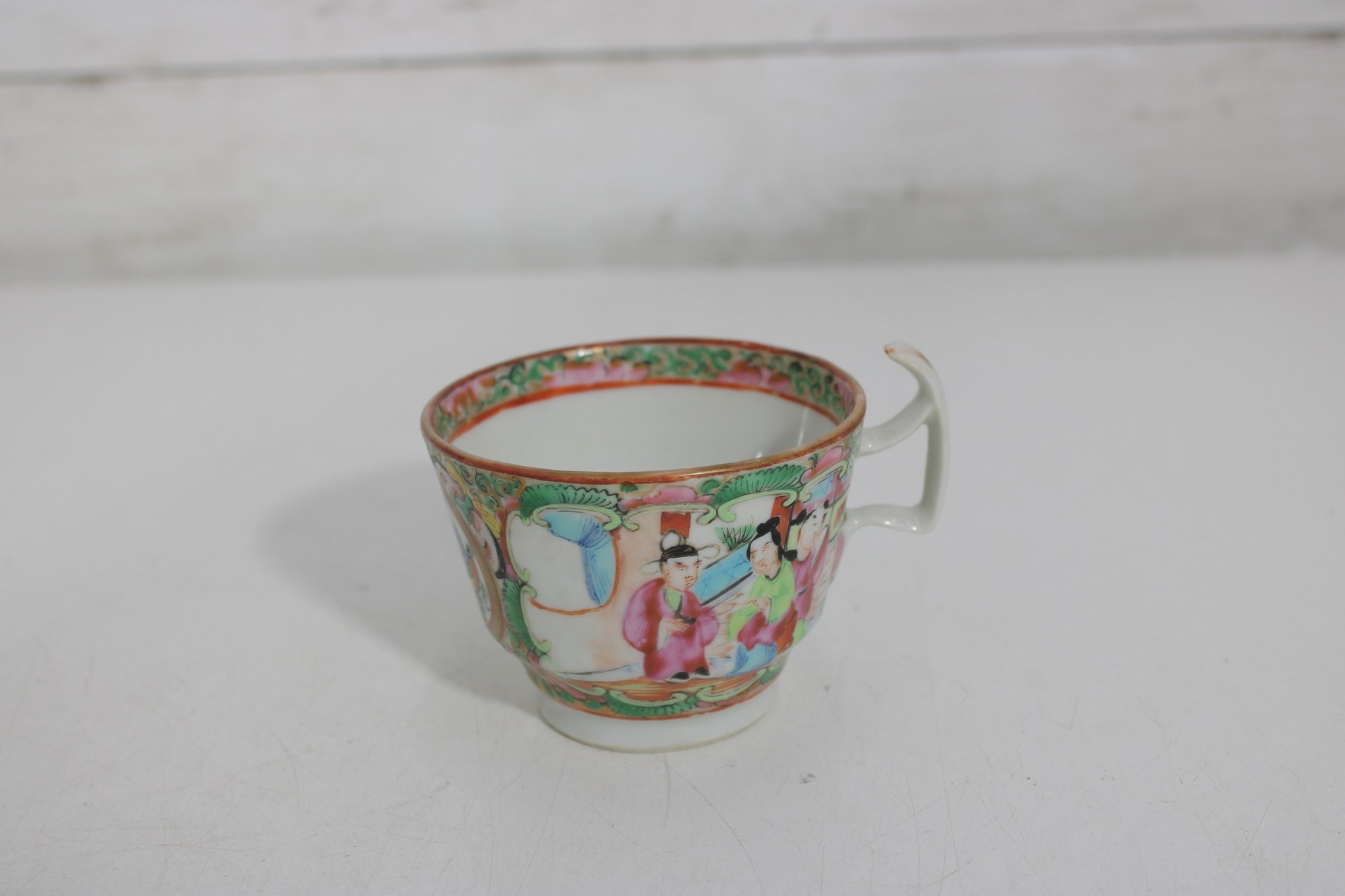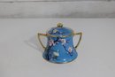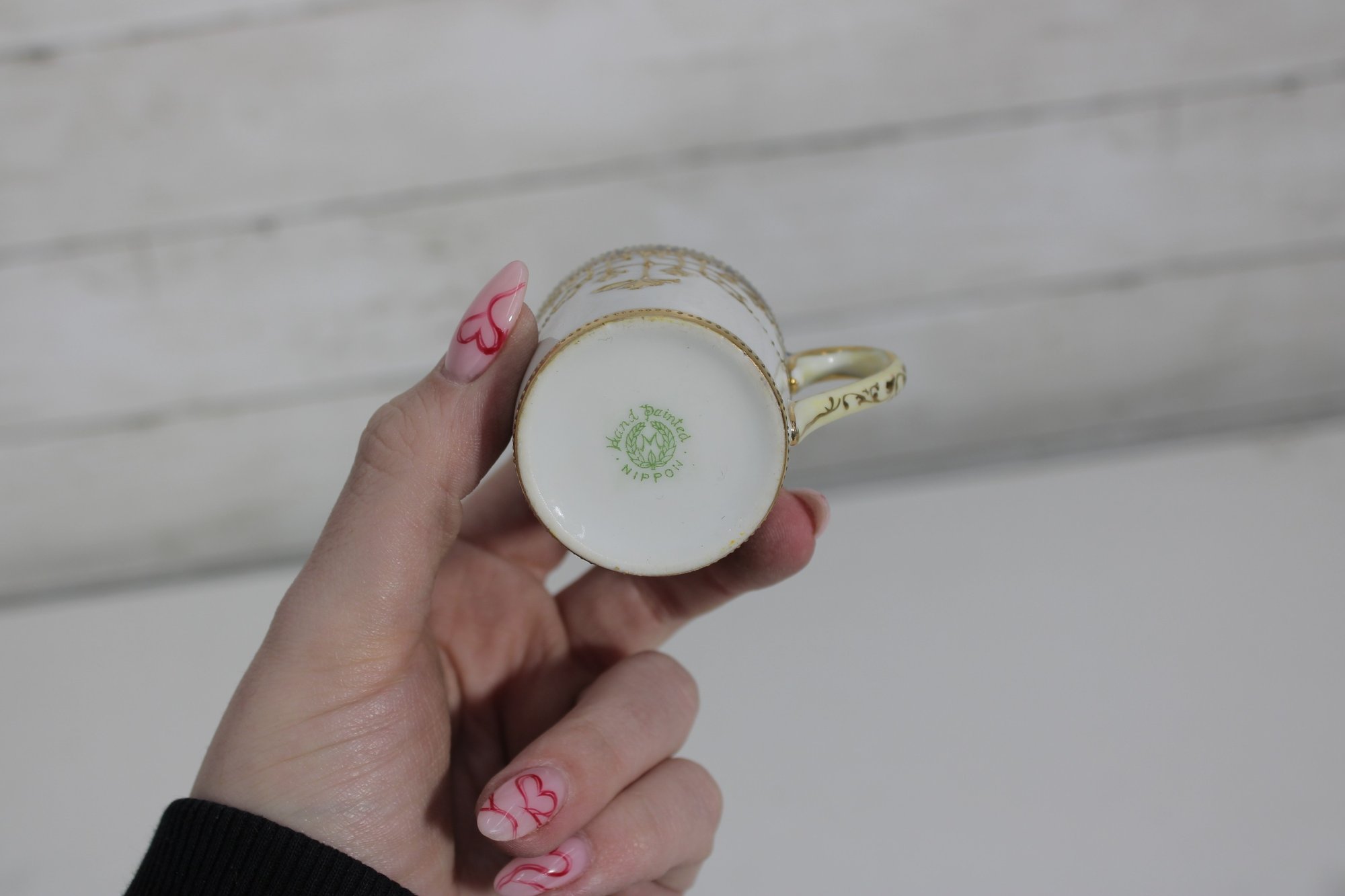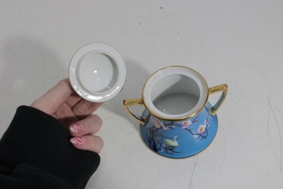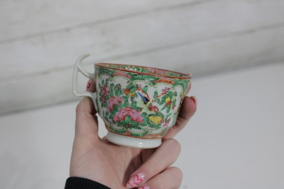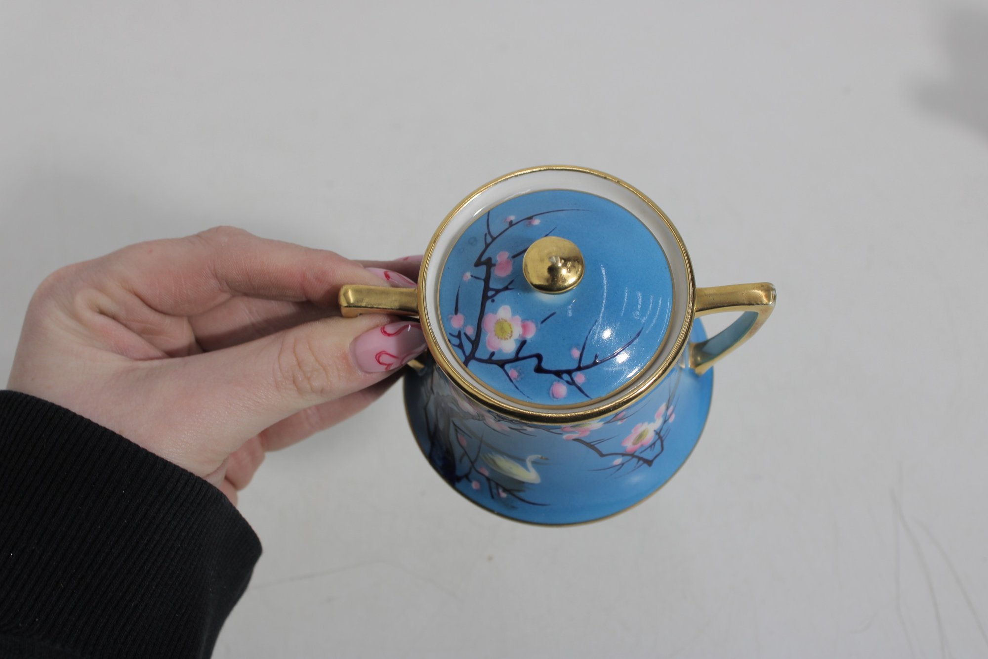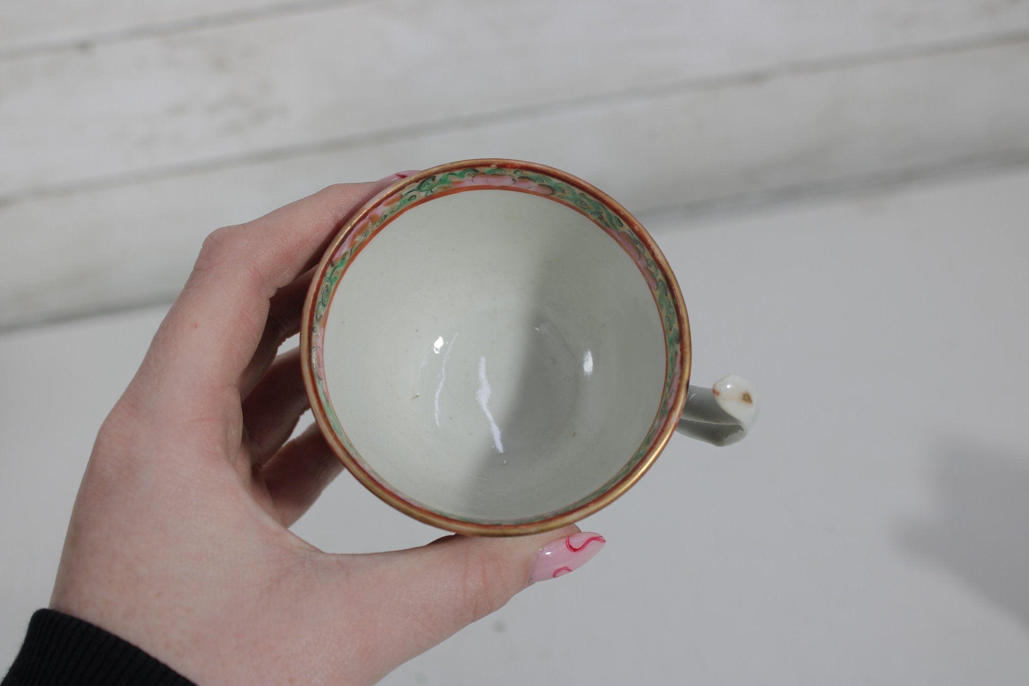a mixed group lot of vintage porcelain and china tea wares, including teapots, tea cups, saucers, and small serving pieces in a variety of decorative patterns and colors. The assortment includes floral, figural, and hand-painted style designs with gilt and colored accents.