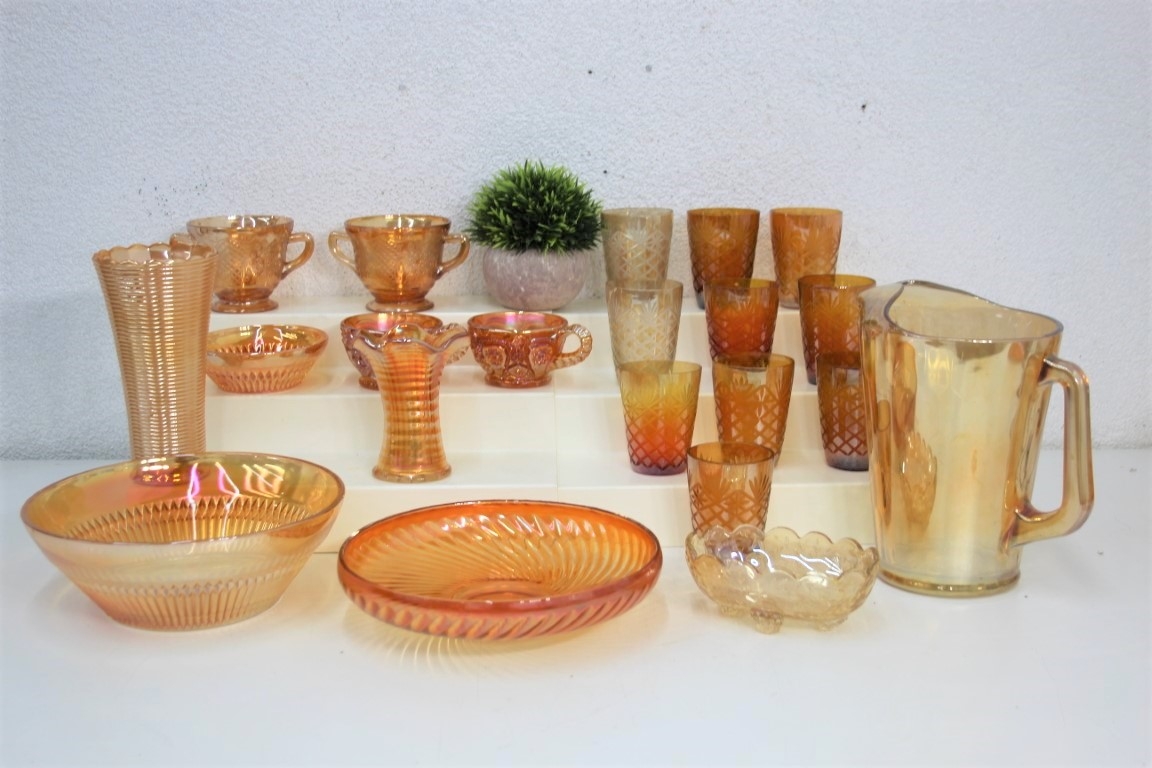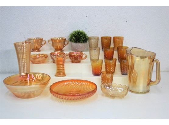 Grouping Of Marigold Iridescent Carnival Glass Vases, Bowls, Pitcher, Mugs And Cups