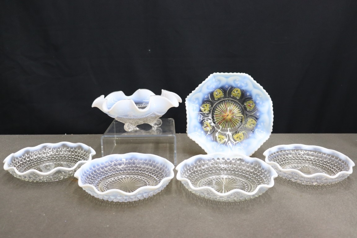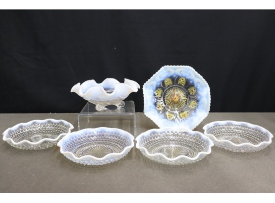Grouping Of Six Pieces Vintage Moonstone Opalescent White Hob Nail Ruffle Edge Dishes