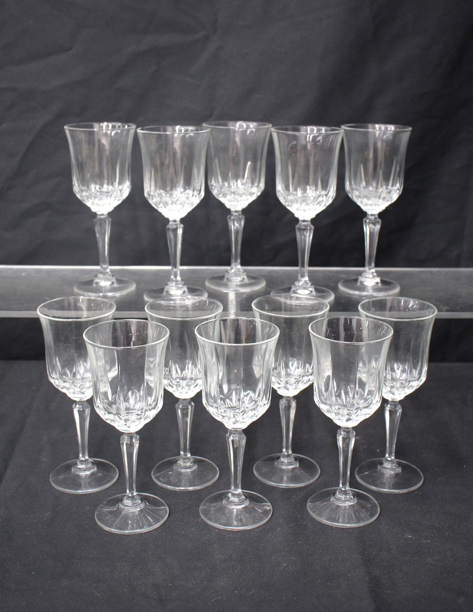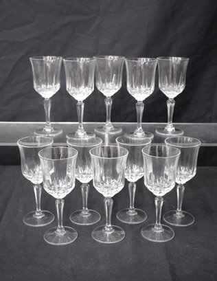 This set includes 12 glasses, each elegantly crafted to enhance the wine-drinking experience. The glasses are presented in their original packaging, indicating they are unused and well-maintained.Each glass is designed with a classic shape and delicate crystal cuts that catch and reflect light, promising to add a luxurious sparkle to your dining table. The boxes show slight signs of shelf wear but are intact, suggesting that the glasses have been stored with care