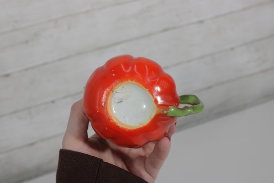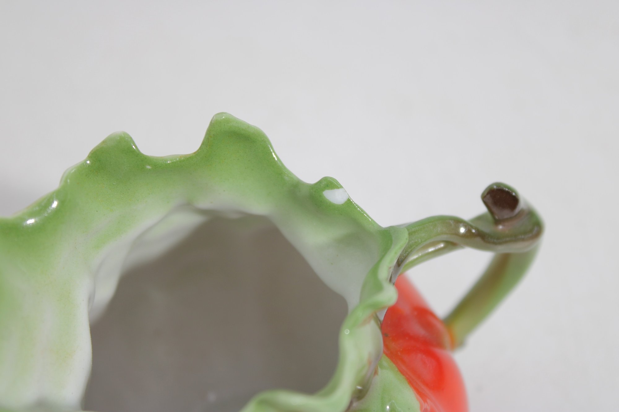 Royal Bayreuth figural pieces such as this tomato creamer are widely collected for their unique forms and decorative appeal, making it a great addition to a porcelain collection, kitchen display, or vintage novelty grouping.