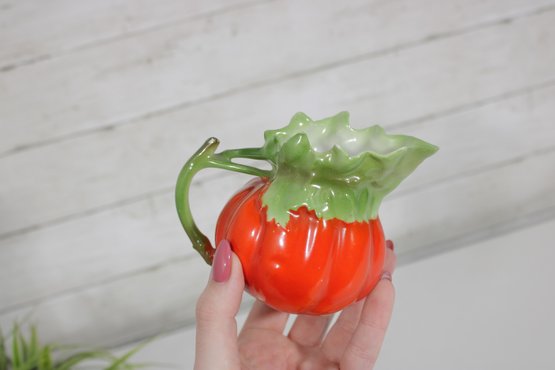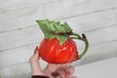 The pitcher features vibrant hand-painted colors, molded tomato ribbing, and a sculpted green leaf rim that forms the spout. The curved handle resembles a vine, adding to the realistic botanical design.
