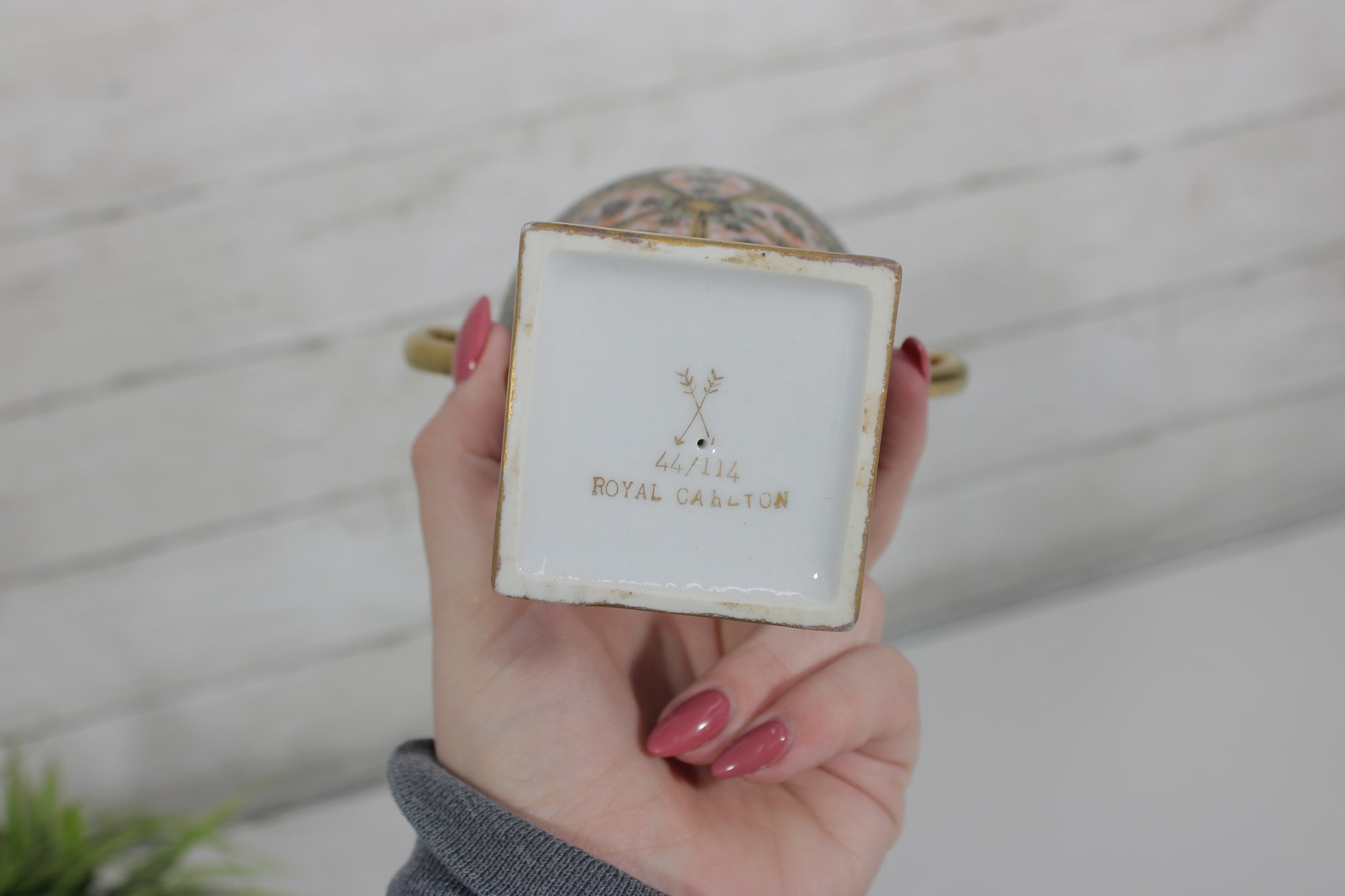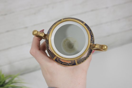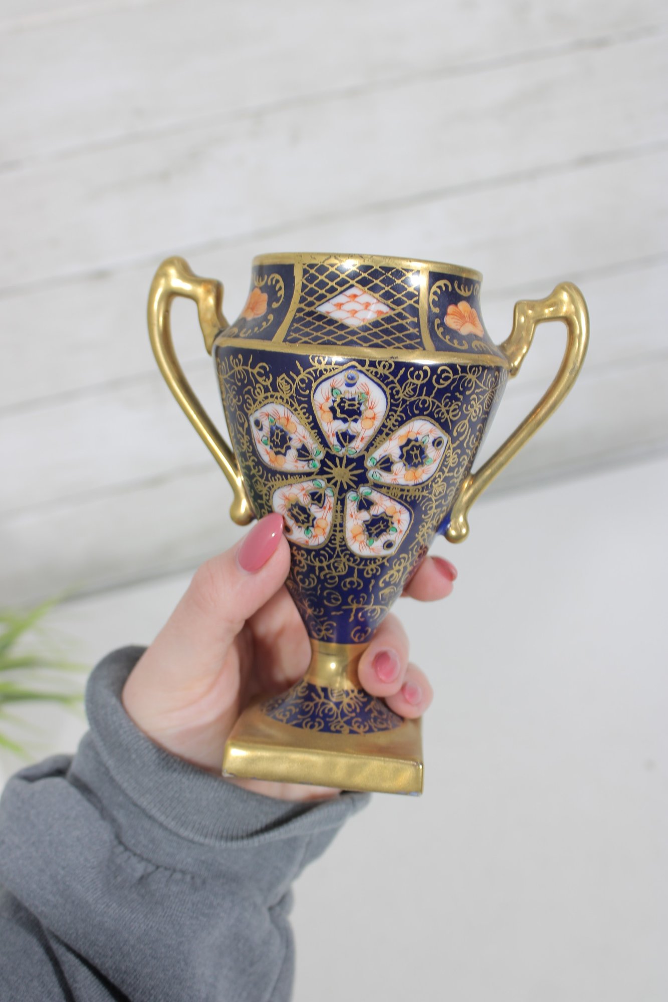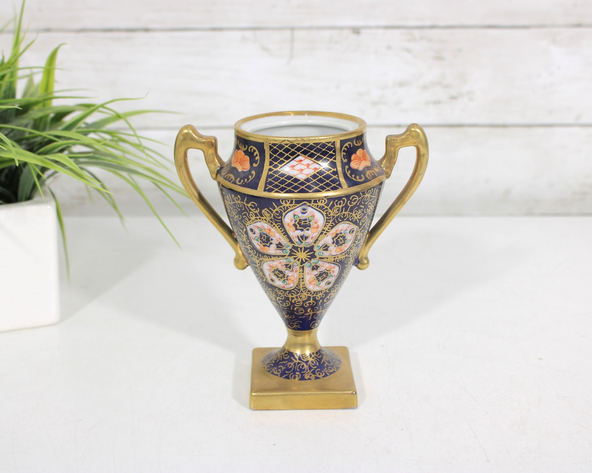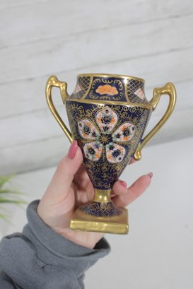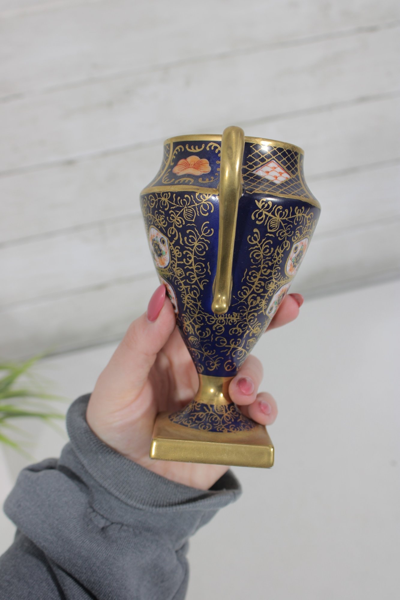Royal Carlton hand-painted urn-shaped vase featuring rich cobalt blue tones, intricate floral medallions, and ornate gold detailing throughout. The piece is beautifully accented with twin gold-tone handles and a classic pedestal base, giving it a timeless, decorative appeal.