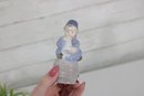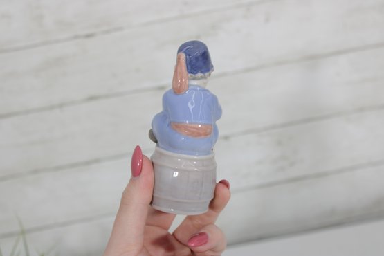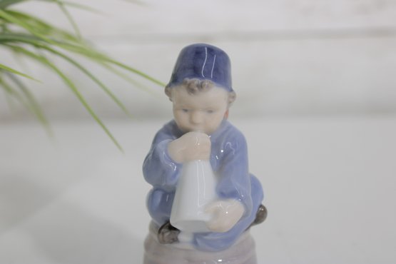 The boy is dressed in a blue outfit and cap, with delicate facial features and a glossy finish. The figure sits atop a barrel base, adding character and storytelling to the design. The underside bears the Royal Copenhagen hallmark along with the model number and Denmark marking.