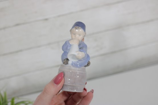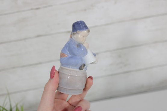 Charming Royal Copenhagen porcelain figurine depicting a young boy seated on a barrel while holding a horn. This classic piece, model number 3689, showcases the fine craftsmanship and soft hand-painted detail that the brand is known for.