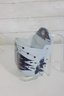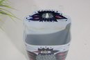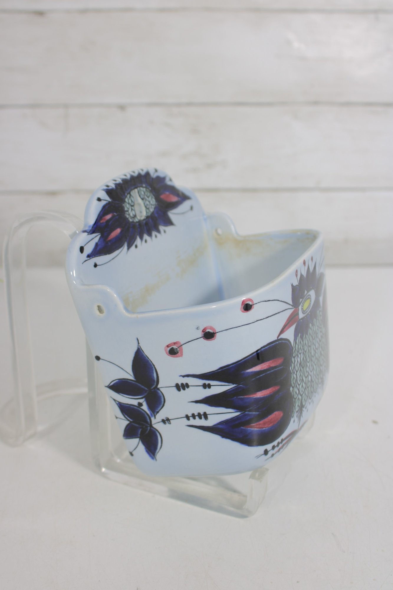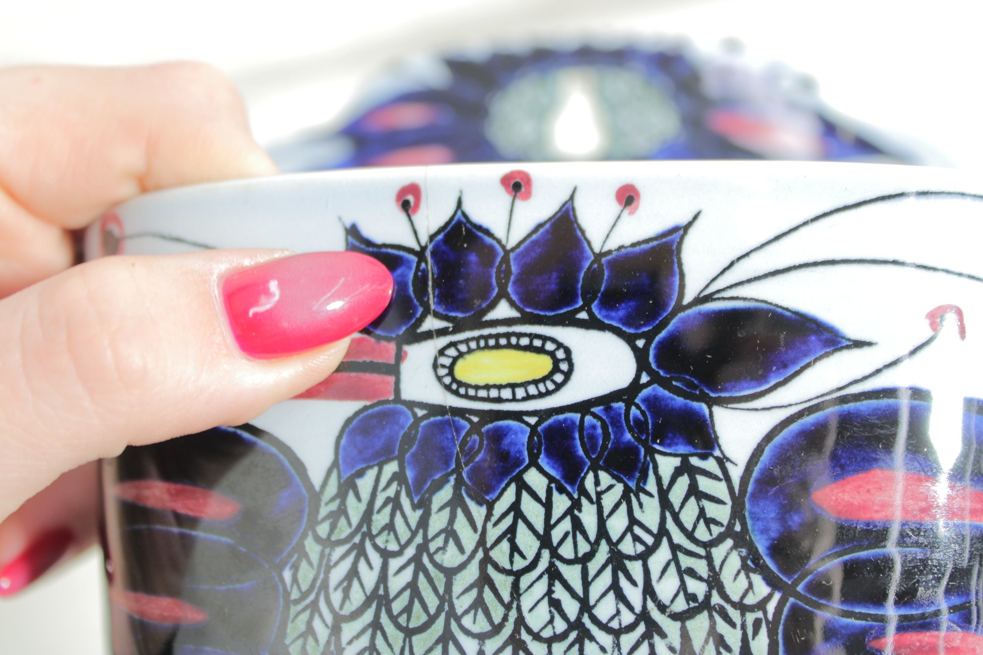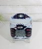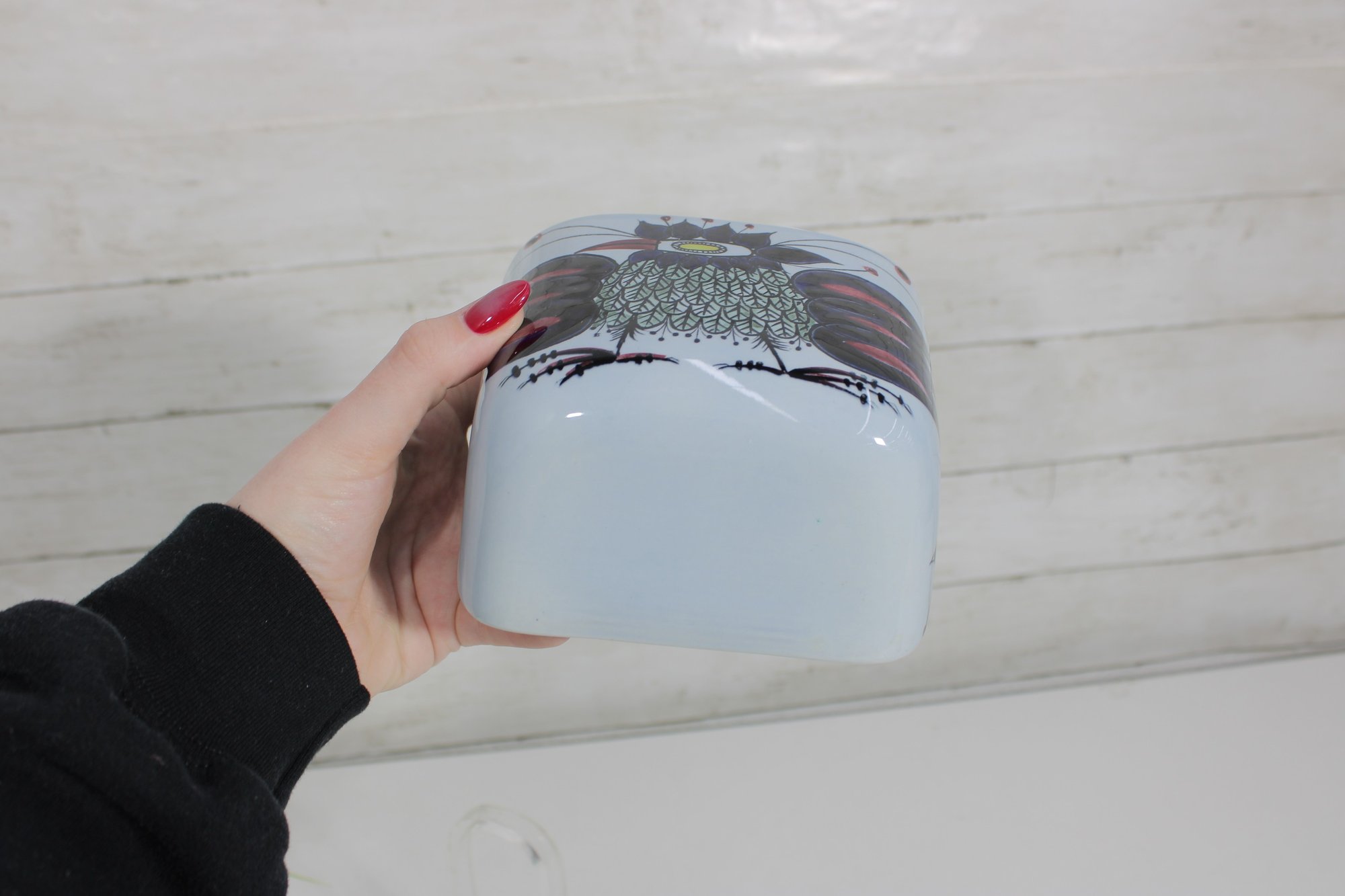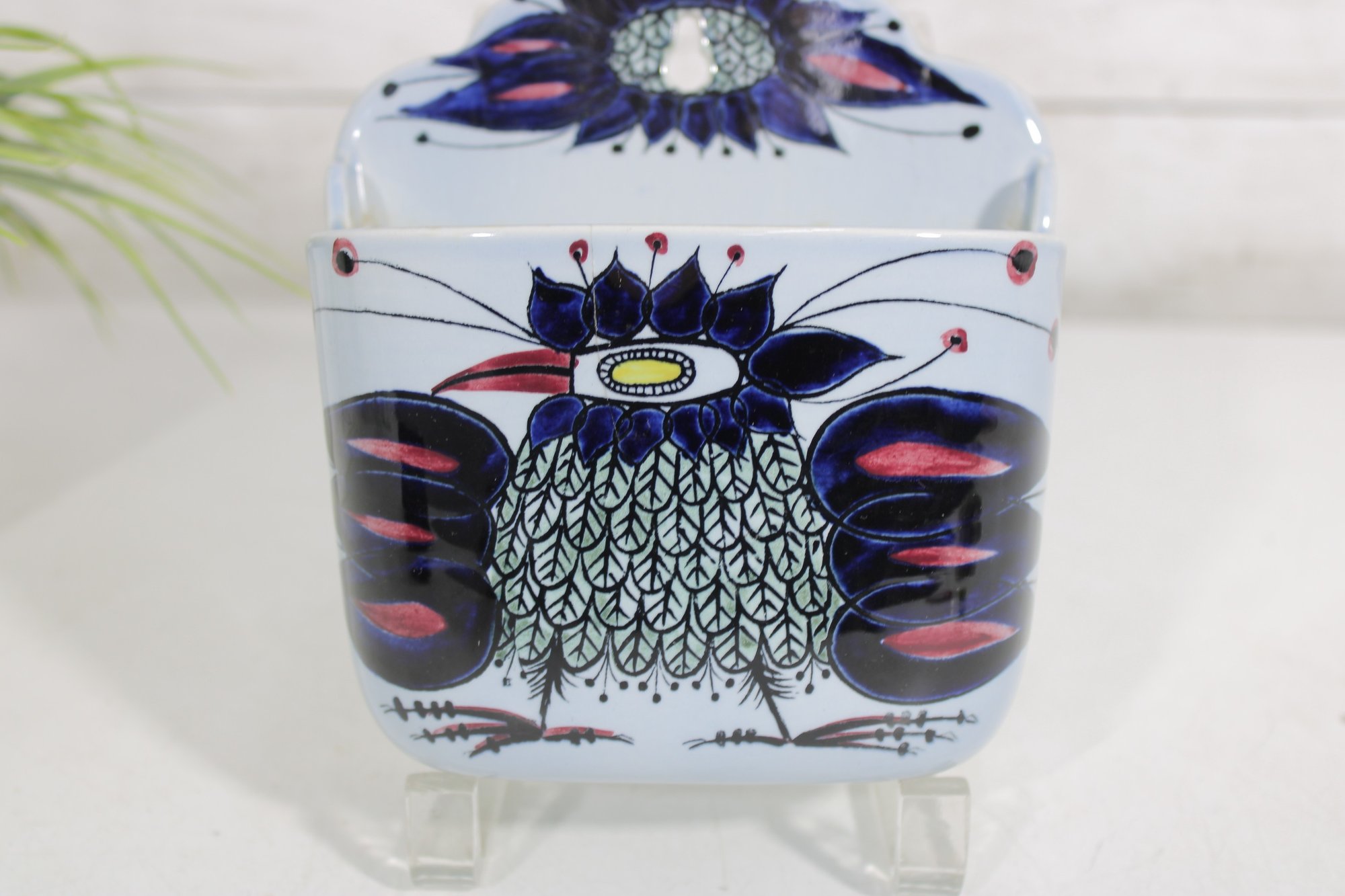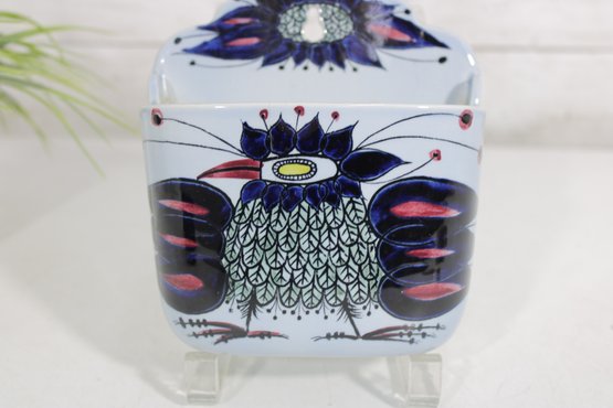 Striking Royal Copenhagen salt box designed by Beth Breyen, featuring bold and colorful Scandinavian modern artwork. This piece showcases a stylized floral motif with rich tones of deep blue, purple, and red set against a crisp white porcelain background—an eye-catching example of mid-century Danish design.