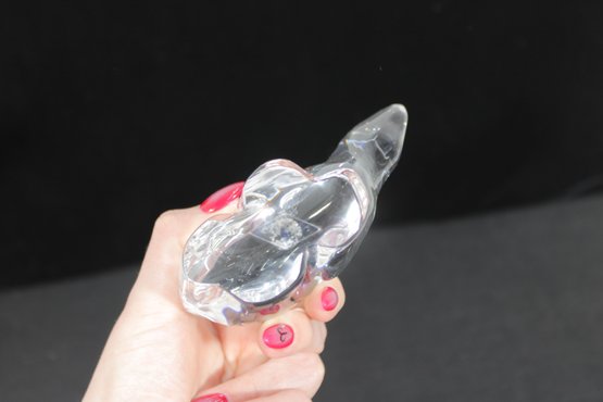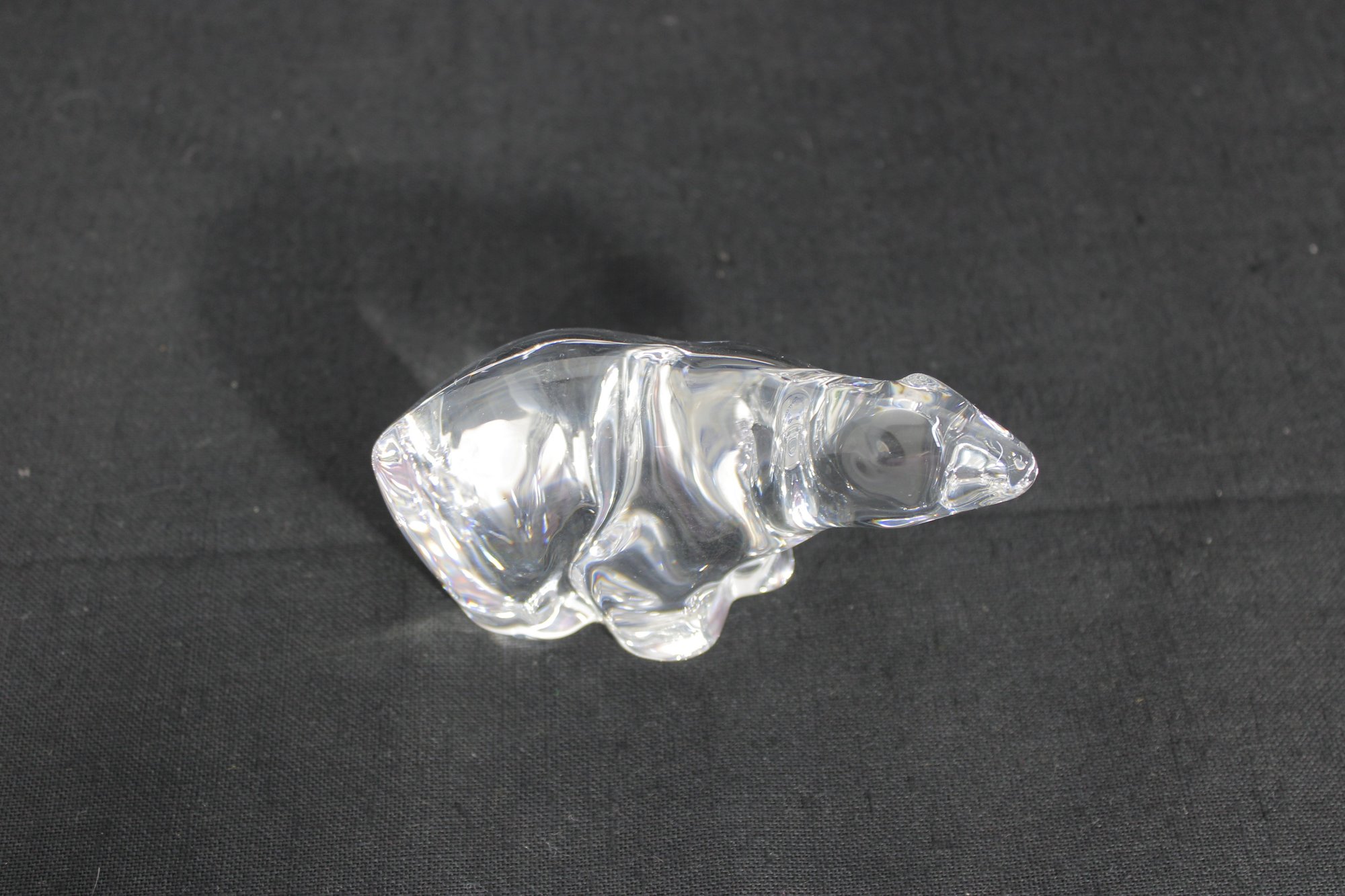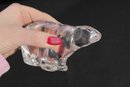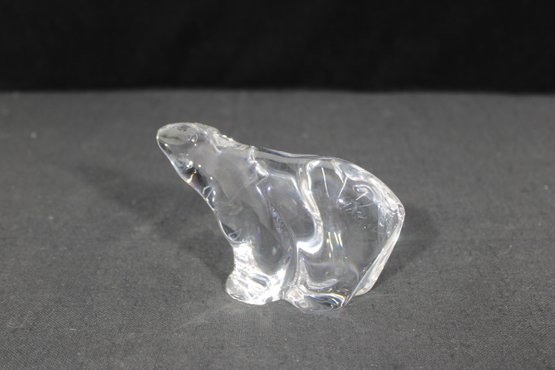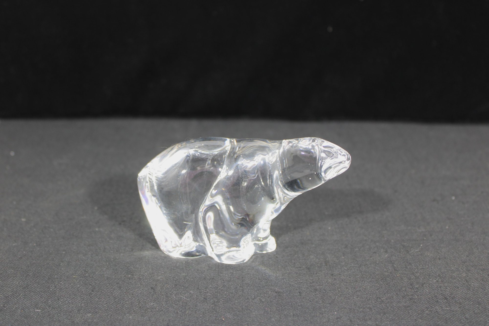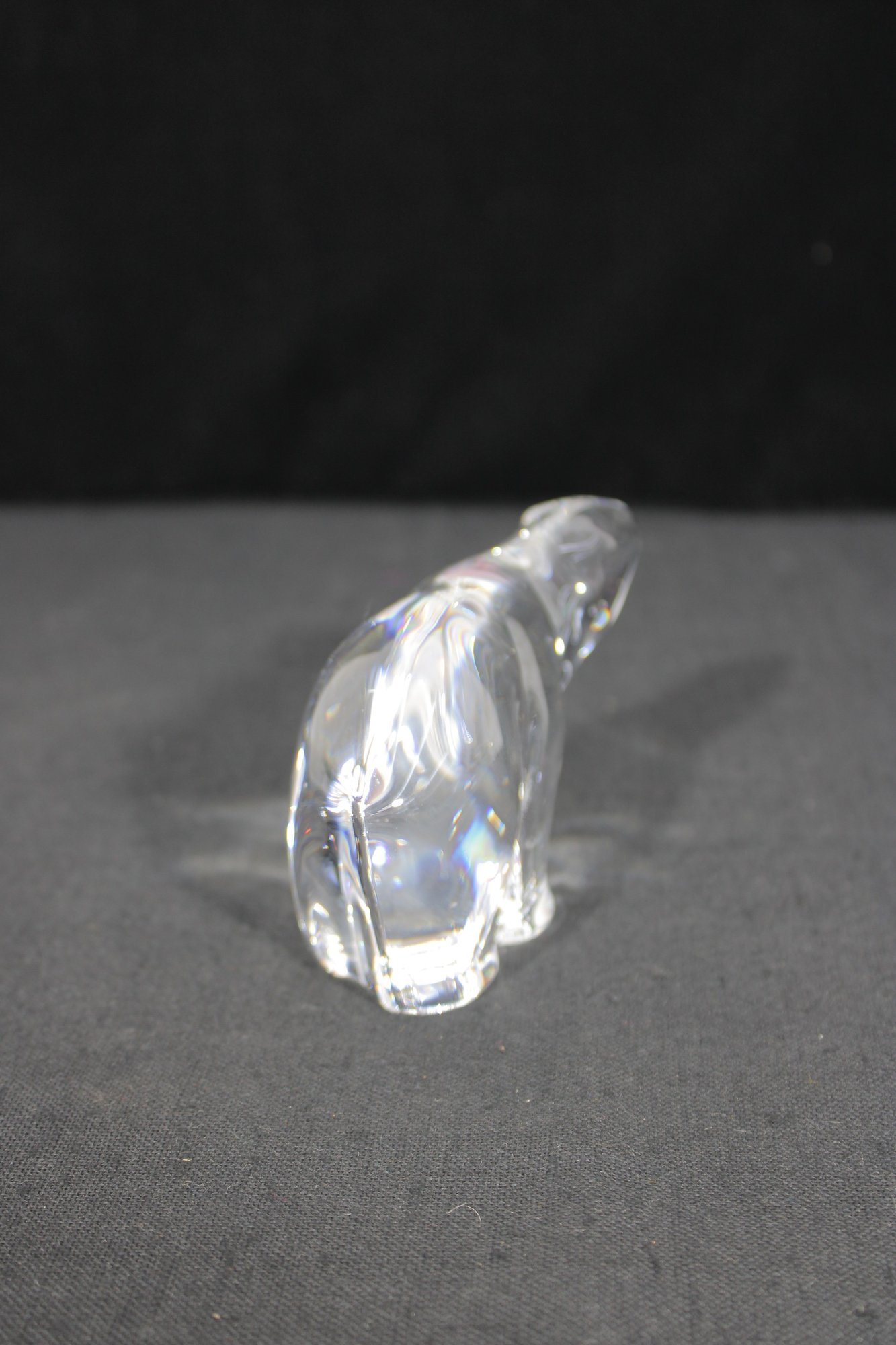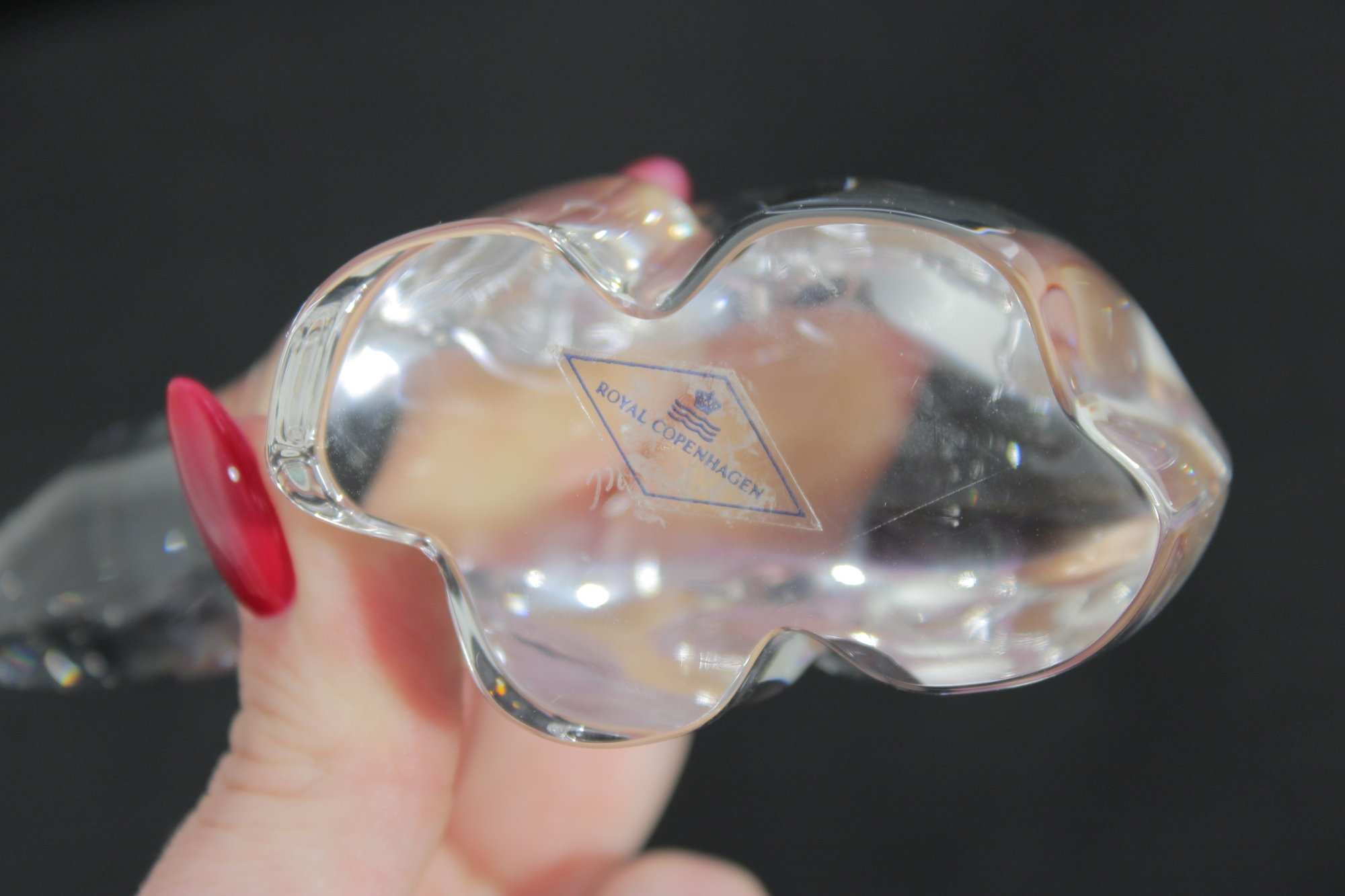 a charming Royal Copenhagen crystal polar bear figurine, beautifully crafted in clear glass. This small yet elegant piece captures the form of a walking bear with smooth, sculptural lines and a polished finish that reflects light beautifully.
