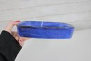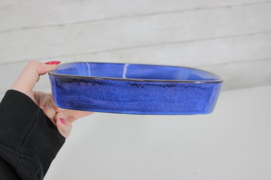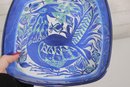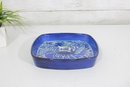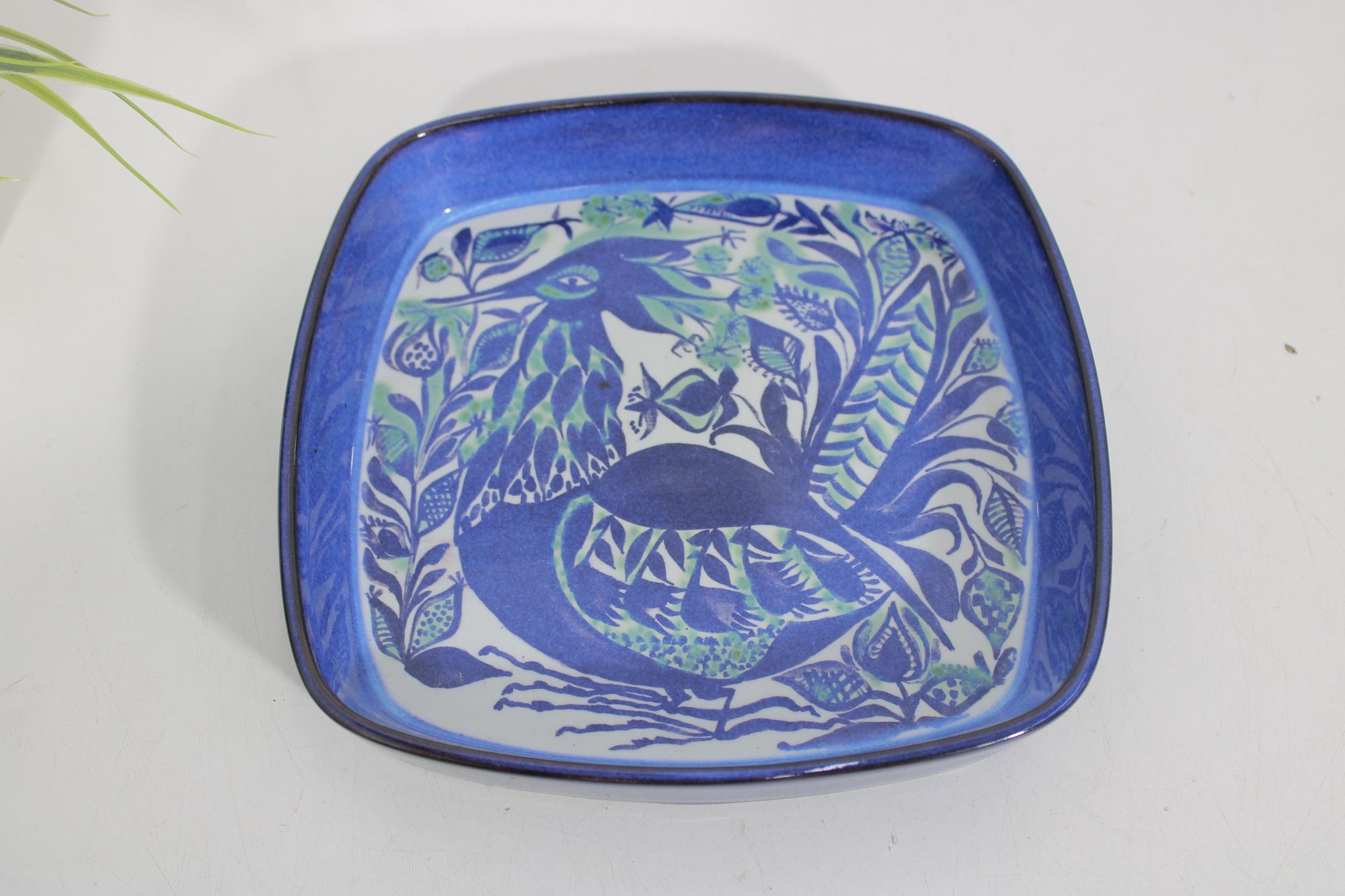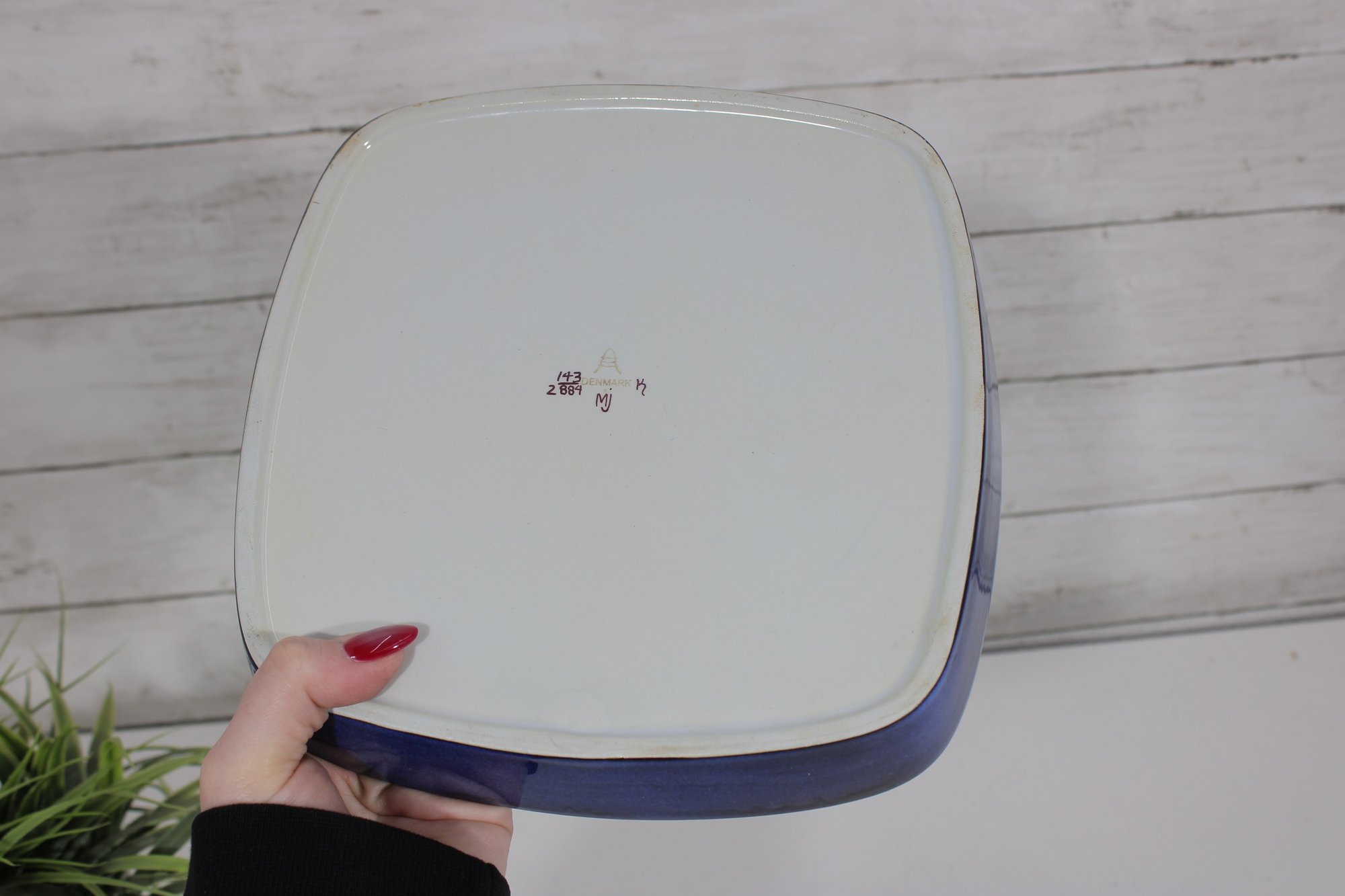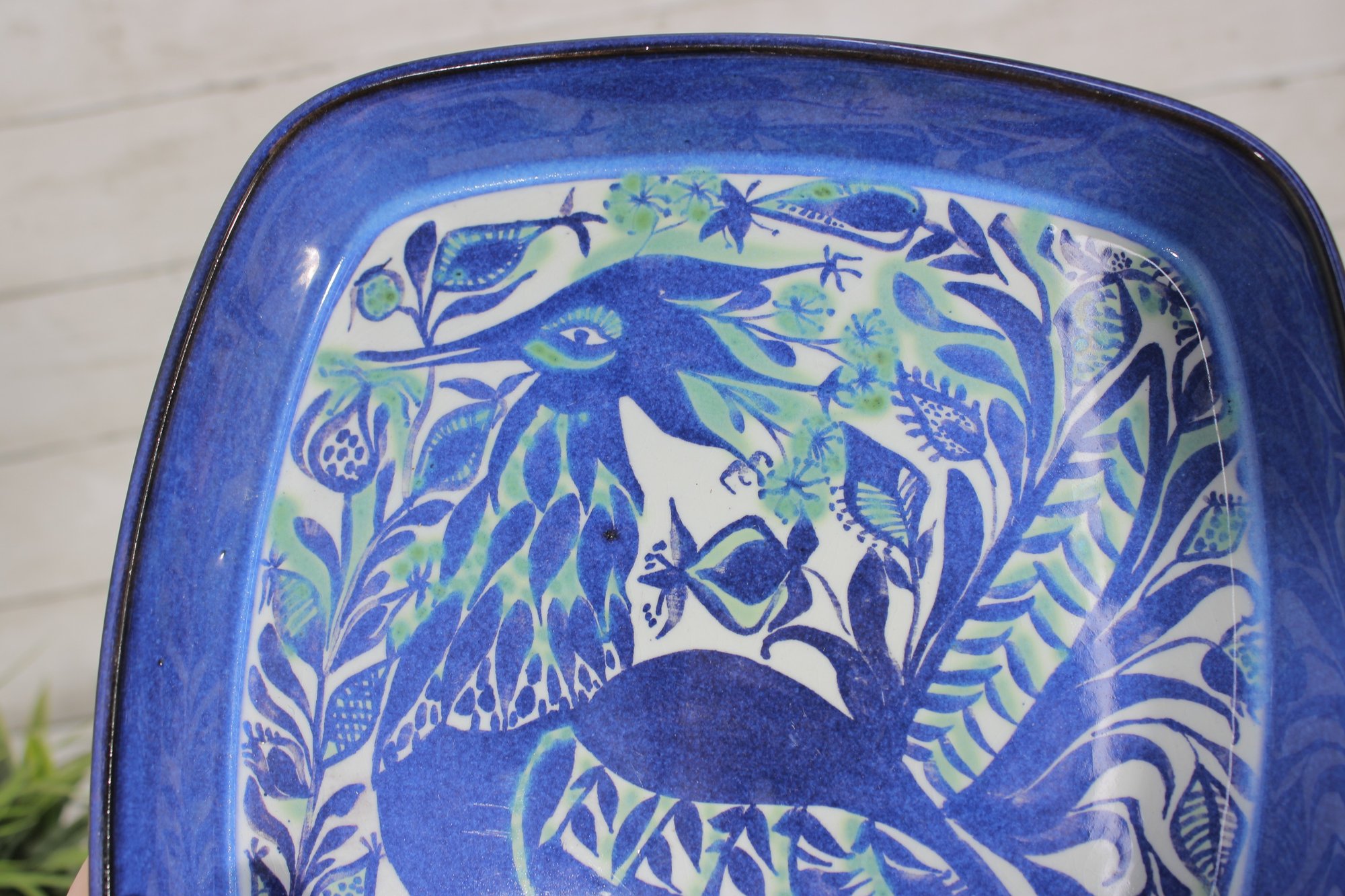 Beautiful vintage Royal Copenhagen Fajance bowl featuring a detailed bird and foliage motif in rich cobalt and soft blue tones. This striking square dish is a wonderful example of classic Danish modern design, blending artistry with functionality.