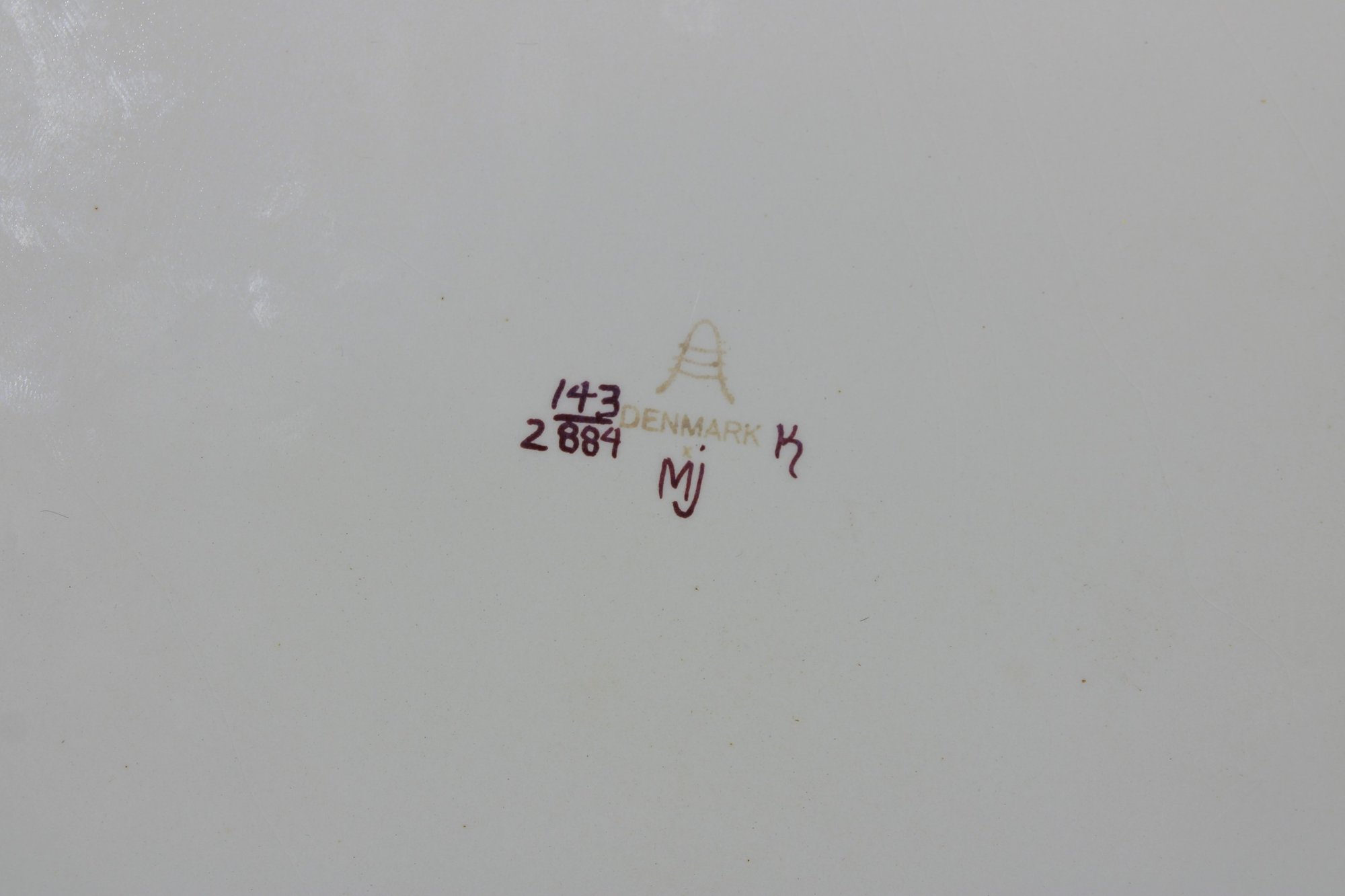 The interior showcases an intricate stylized bird surrounded by botanical elements, while the exterior is finished in a deep blue glaze. The underside bears the Royal Copenhagen mark along with model and artist identifiers, confirming authenticity.