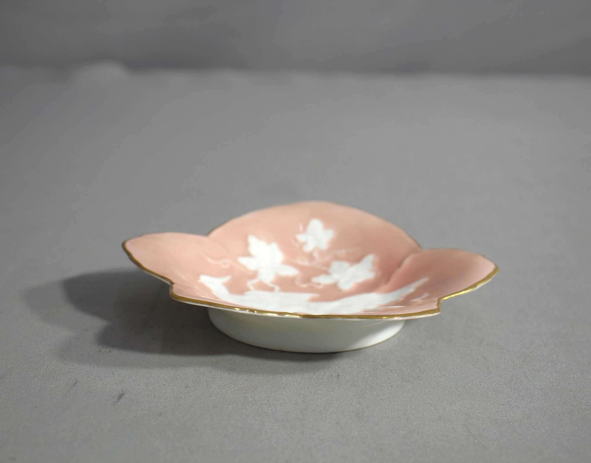 Crafted with a graceful leaf design, the dish showcases a serene scene of birds in flight amongst floral blossoms, a design inspired by the natural world and the Far Eastern influence on English ceramics. The high relief molding adds texture and depth, making the birds appear as if they might take flight from the dish at any moment.