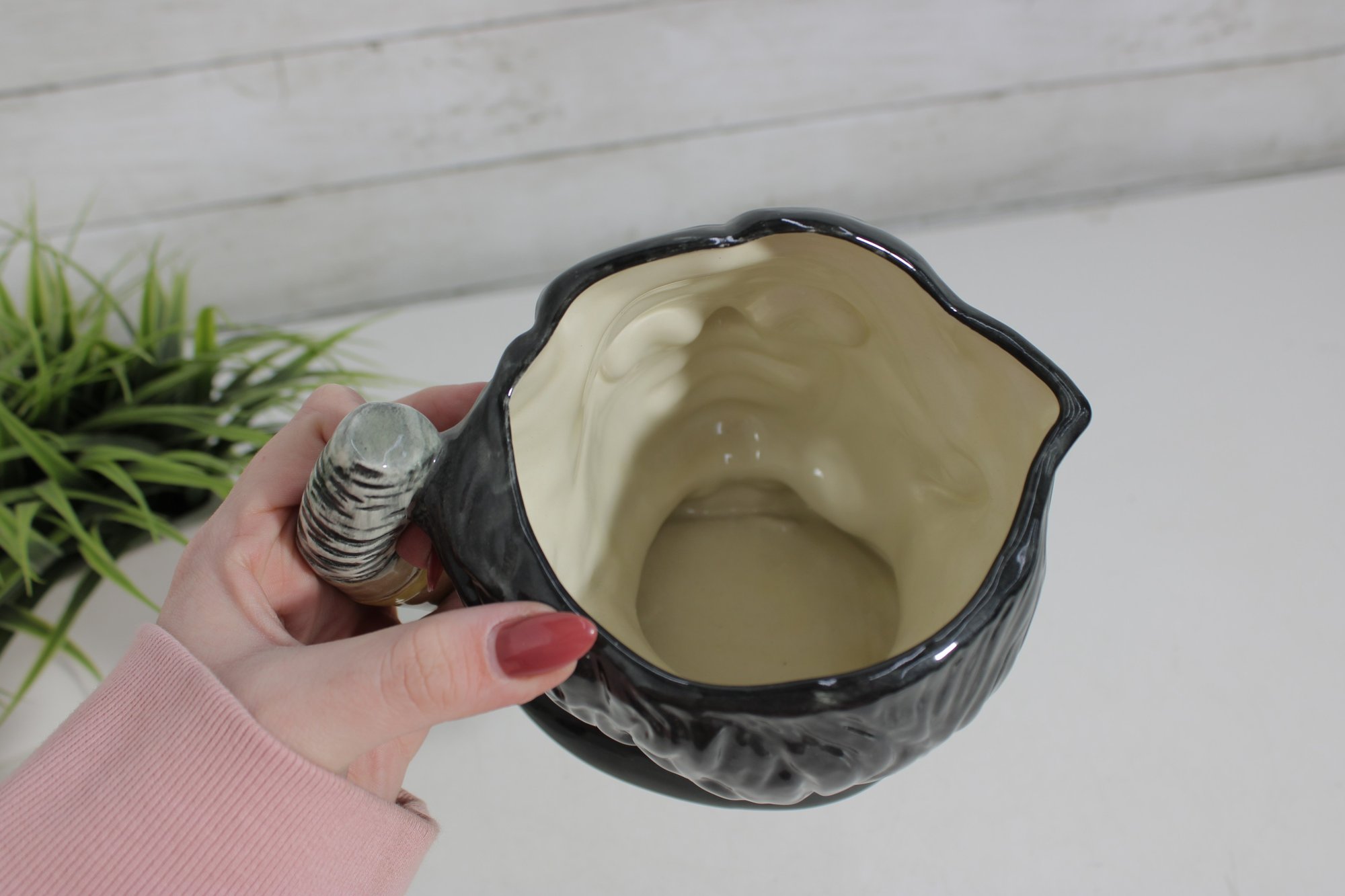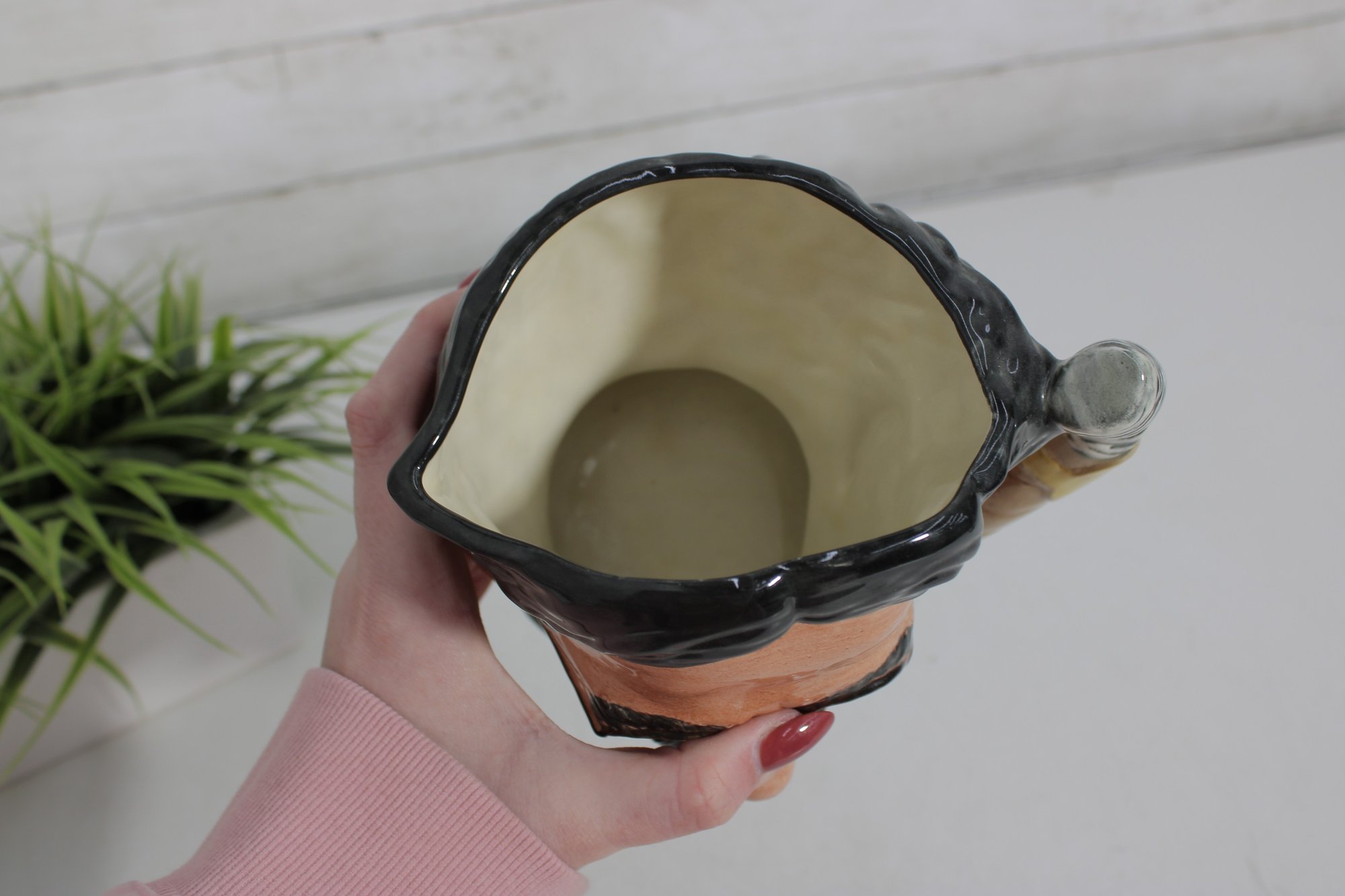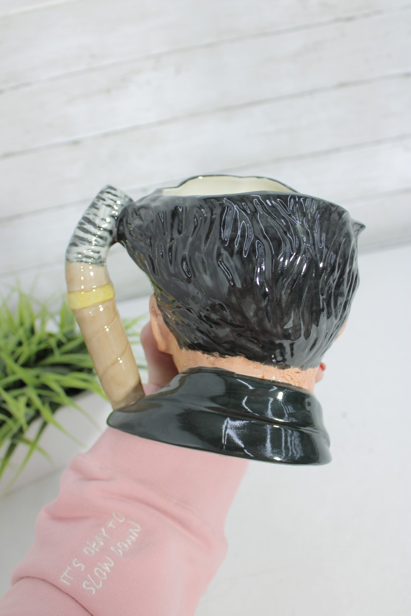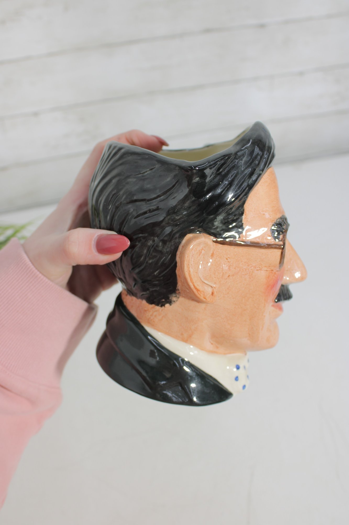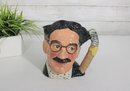 a wonderful Royal Doulton hand-painted character mug depicting Groucho Marx, part of The Comedy Collection. This figural Toby-style jug stands approximately 7 inches tall and captures Groucho’s unmistakable look—round glasses, arched brows, mustache, and bow tie—along with a sculpted handle formed as a cigar.