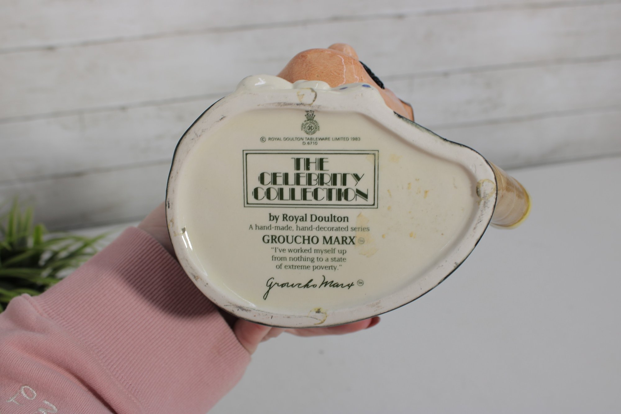 The expressive modeling and rich hand-painted finish bring this iconic comedian to life, making it a standout display piece for collectors of Royal Doulton, classic Hollywood memorabilia, or character ware. The base is clearly marked “The Comedy Collection by Royal Doulton – Groucho Marx – Made in England”, confirming authenticity.