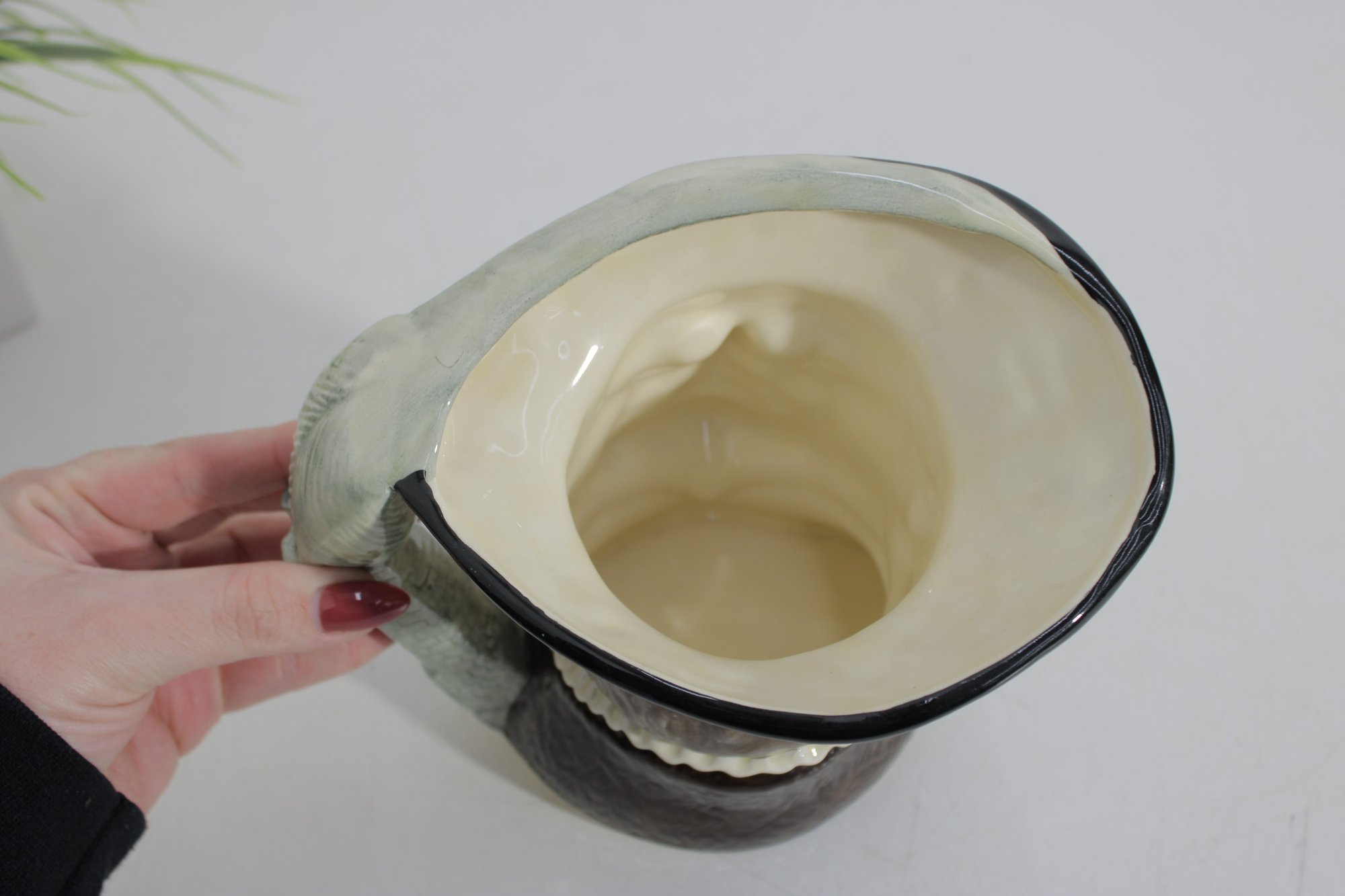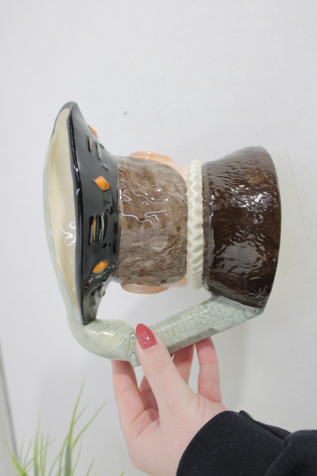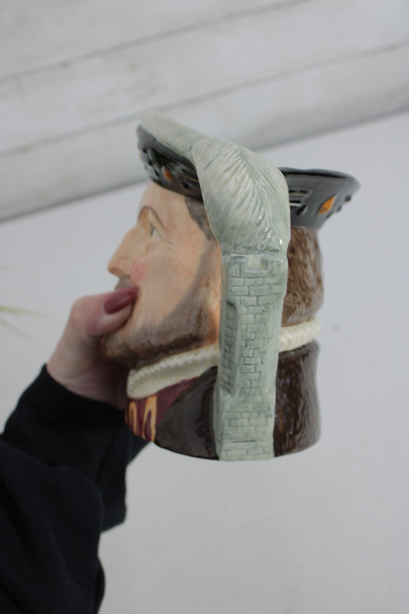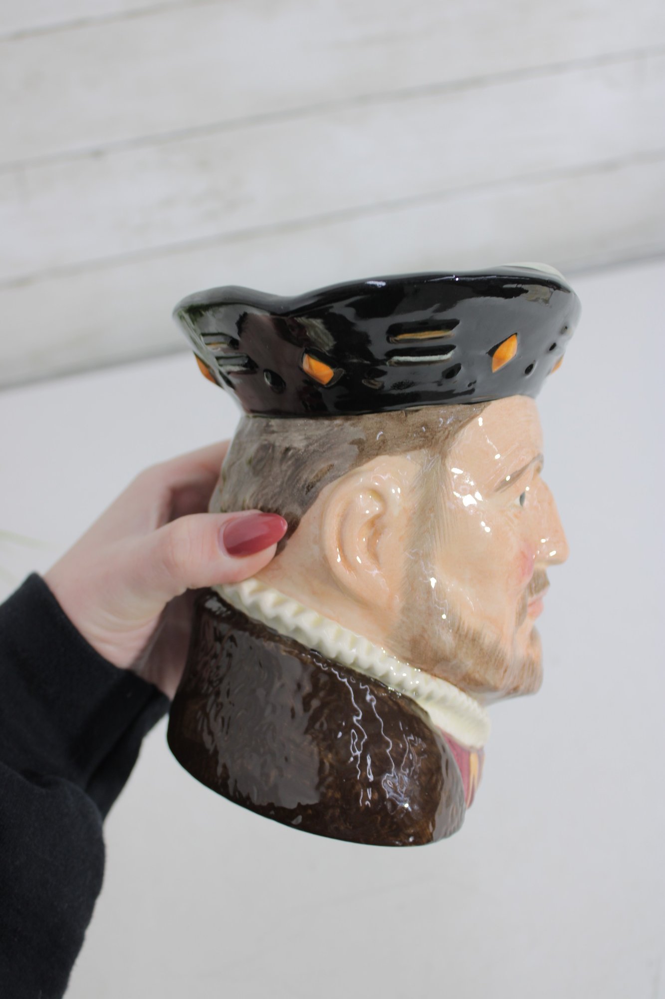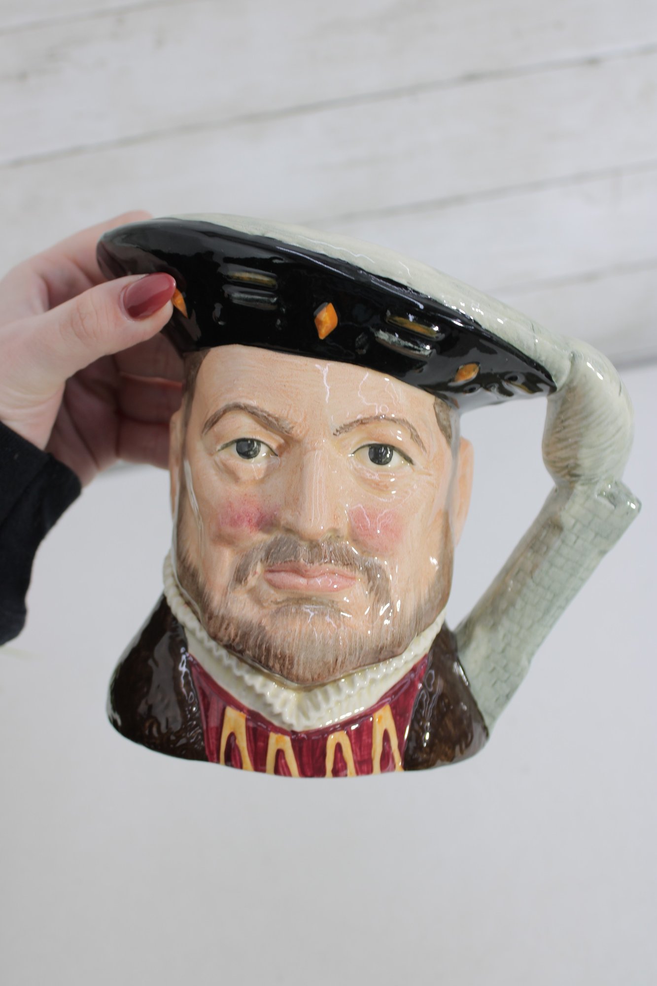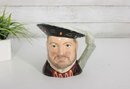 Royal Doulton hand-painted character mug depicting Henry VIII, one of the most recognizable figures in British history. This figural Toby-style jug stands approximately 6.5 inches tall and features Henry in period attire, with a richly detailed face, regal expression, and sculpted handle formed as his raised arm and sleeve.
