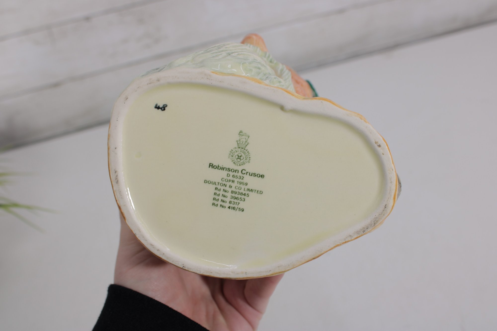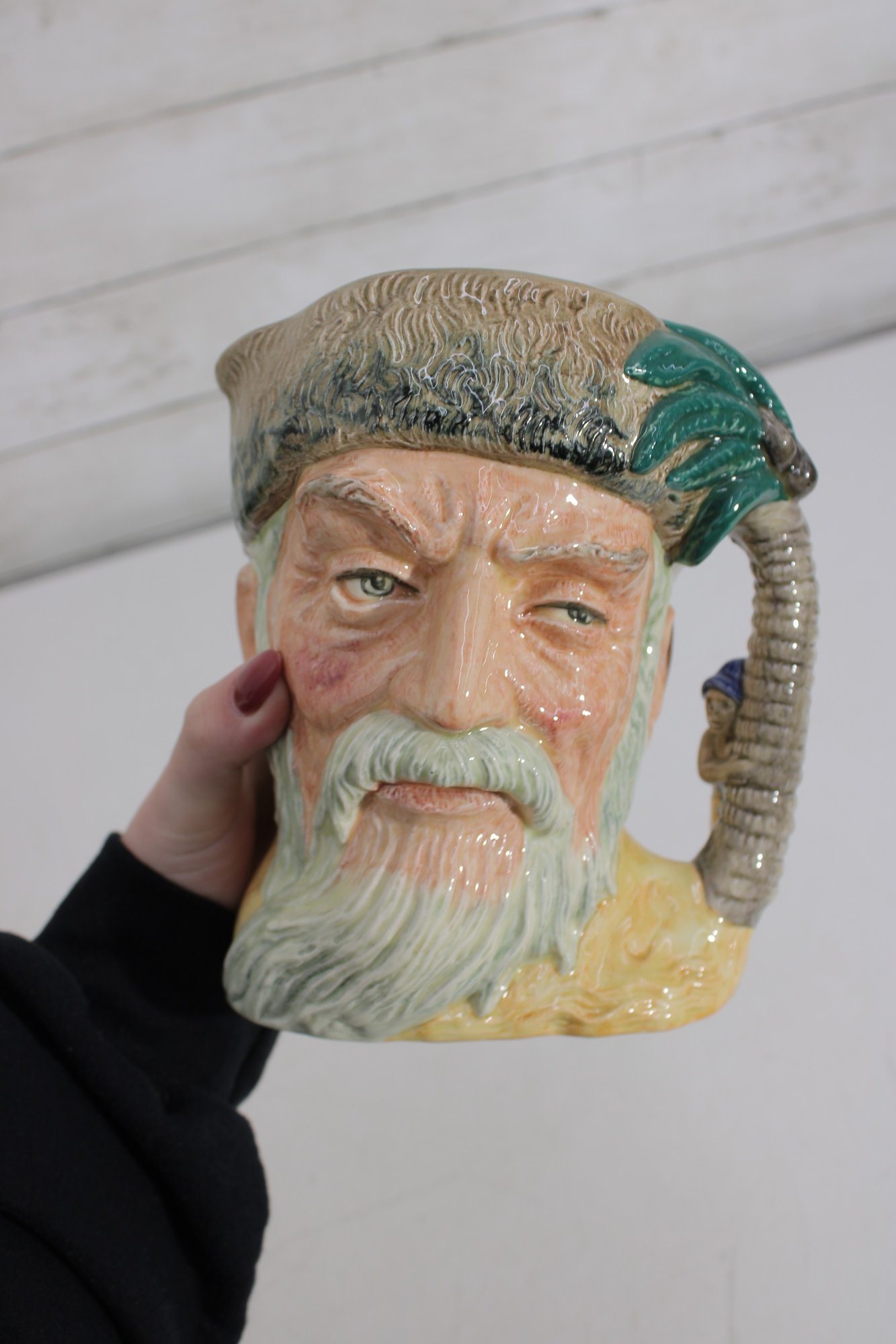 a classic Royal Doulton Large Character Jug titled “Robinson Crusoe,” model D6532, inspired by the legendary castaway from Daniel Defoe’s famous novel.