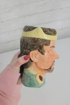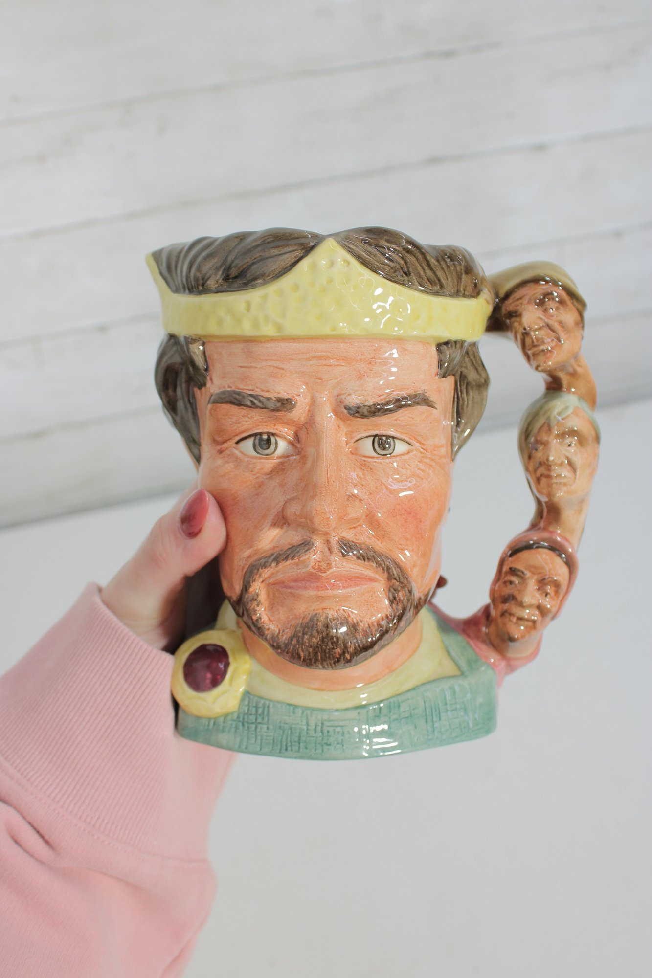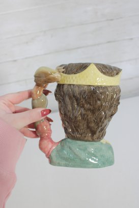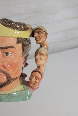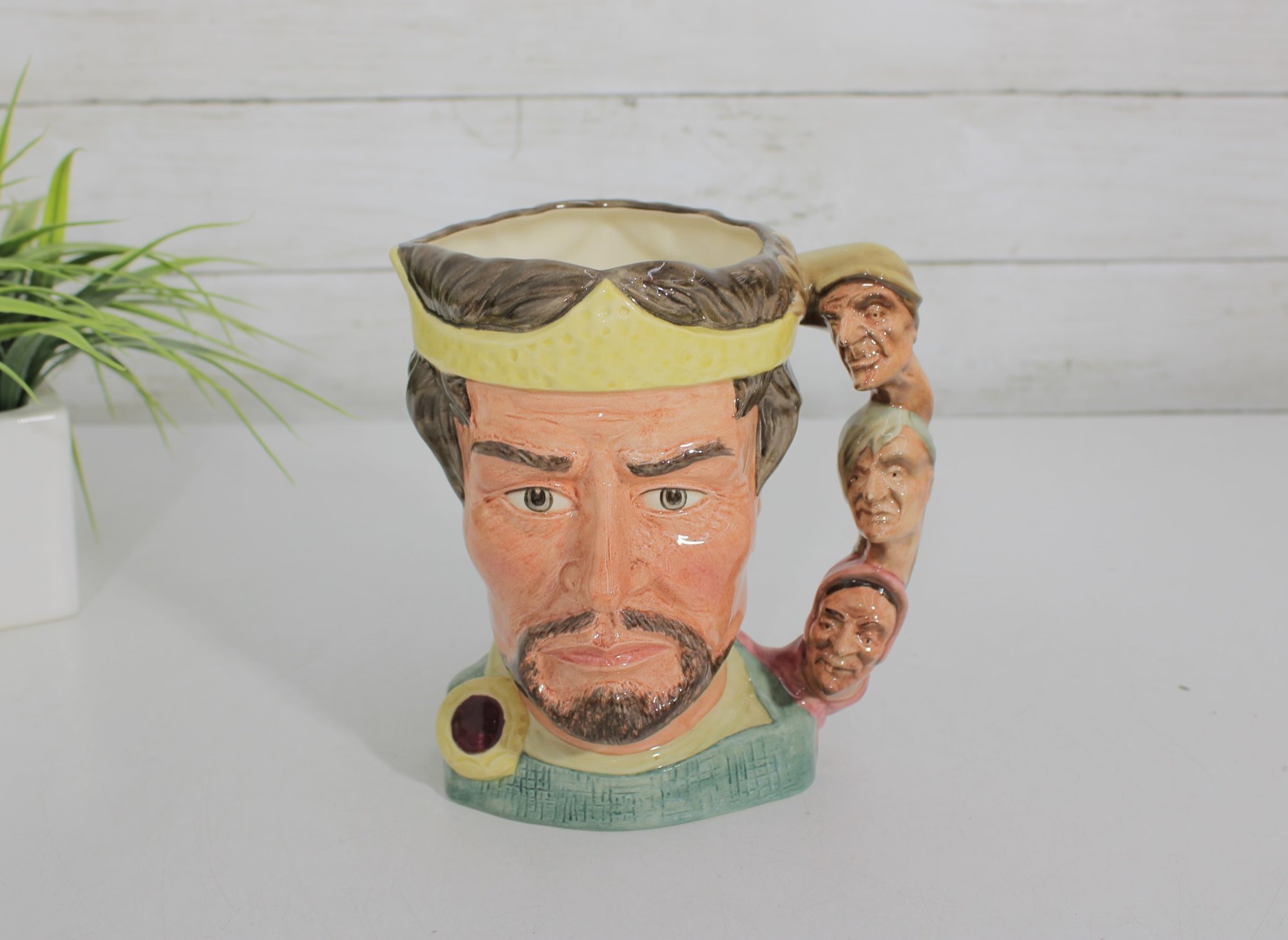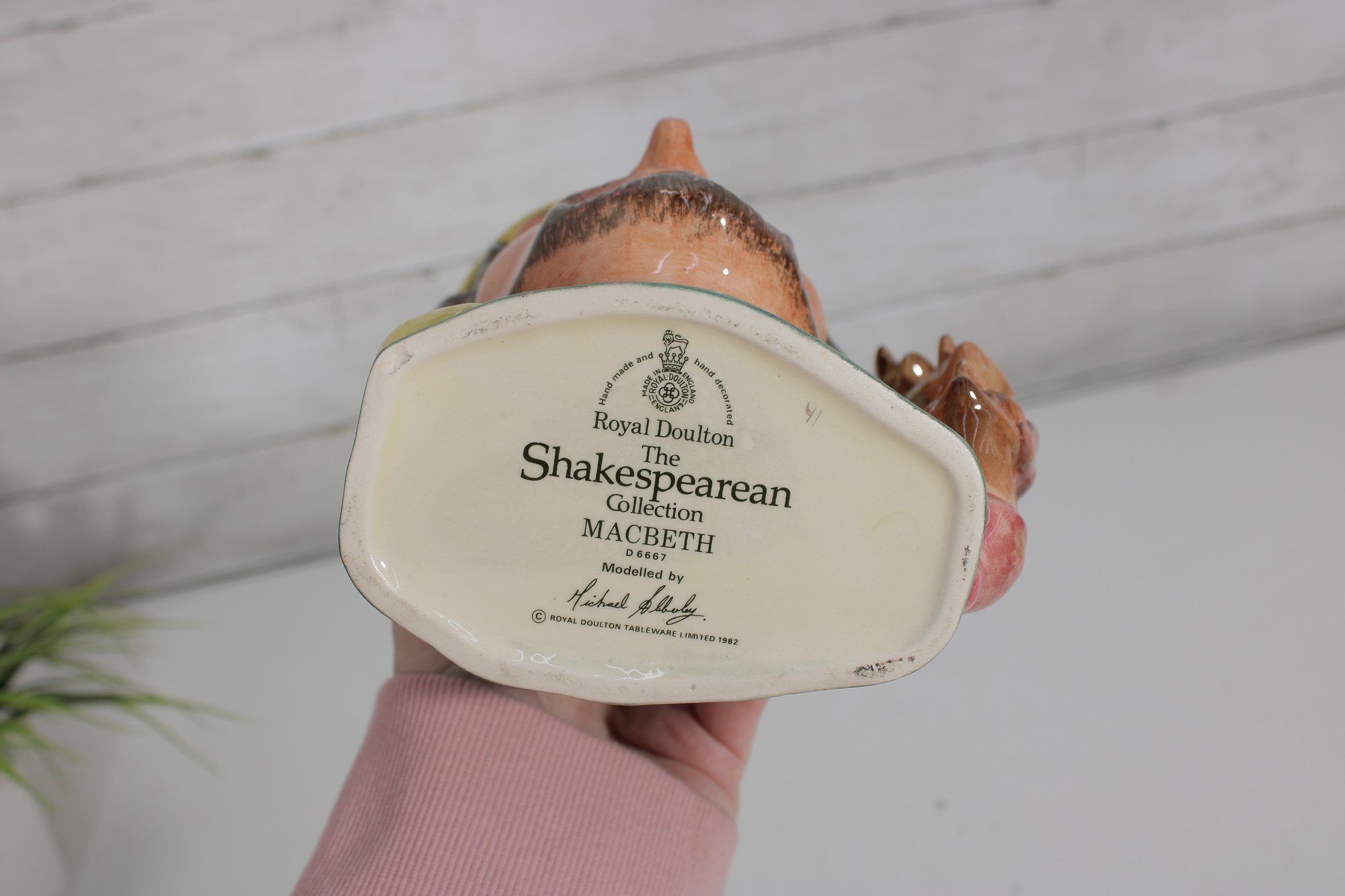 Royal Doulton hand-painted character mug depicting Macbeth, from the highly collectible Shakespearean Series. This figural Toby-style mug stands approximately 7 inches tall and features bold sculptural detail, expressive facial modeling, and a unique multi-figure handle representing additional characters from the play.