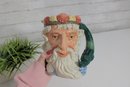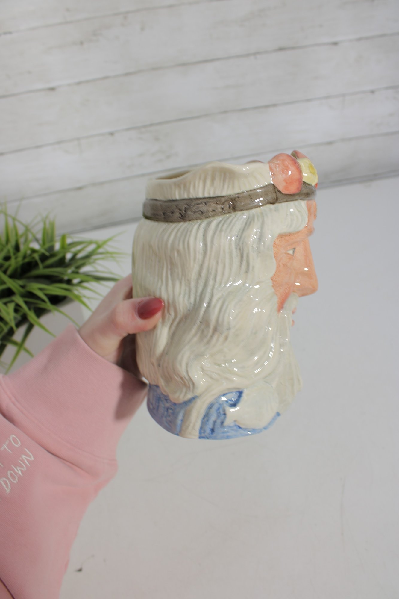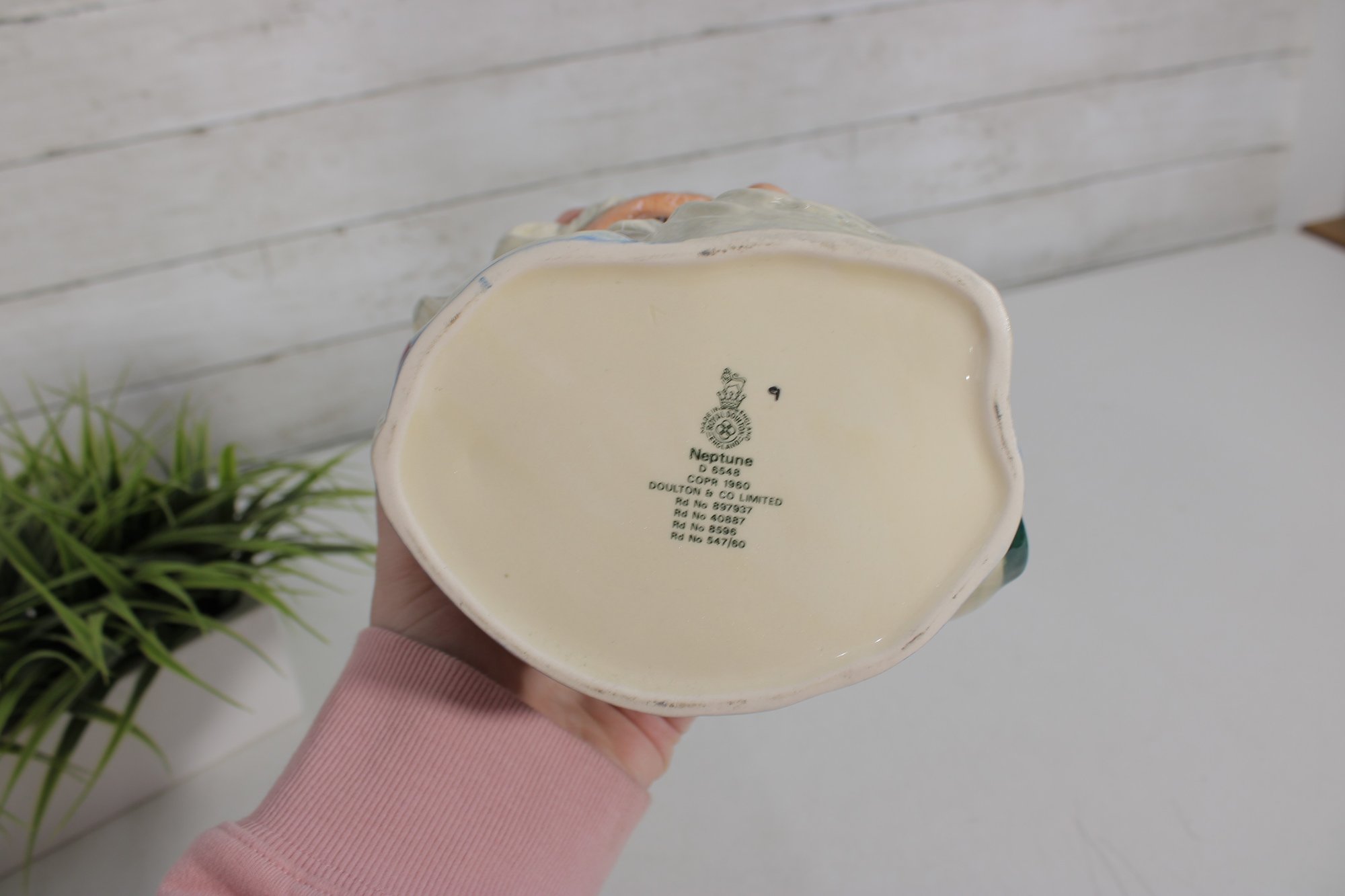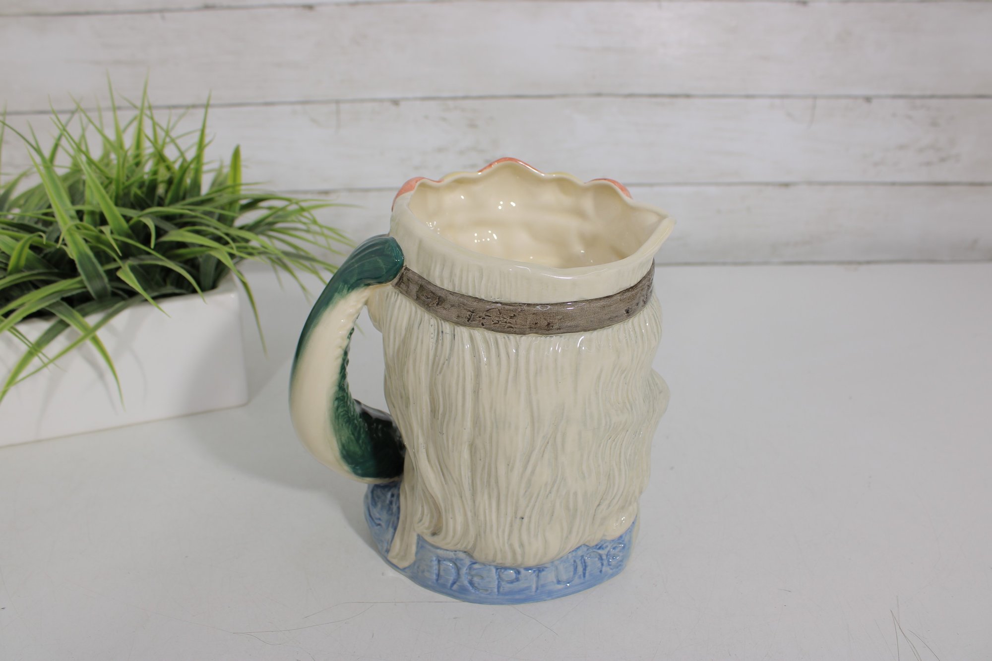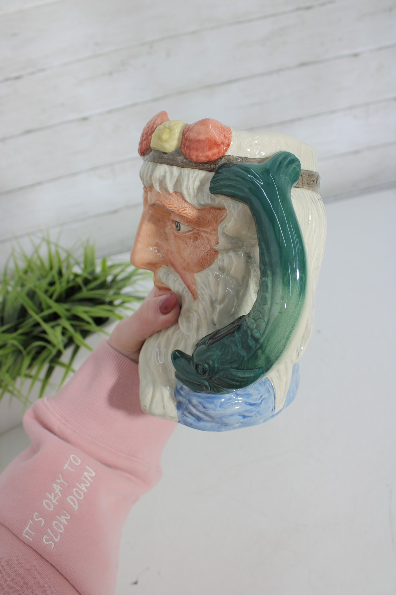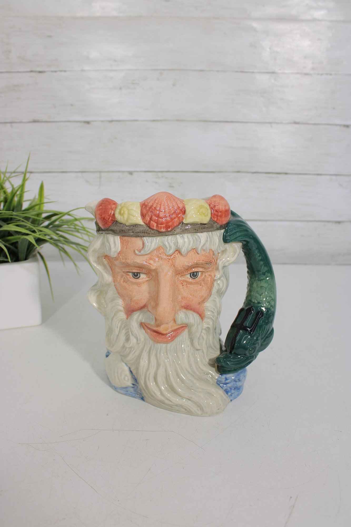 Royal Doulton hand-painted character mug depicting Neptune, the mythical god of the sea. This figural Toby-style jug stands approximately 7 inches tall and features a beautifully modeled bearded face crowned with a wreath of shells, with a sculpted green handle evoking waves and ocean movement.