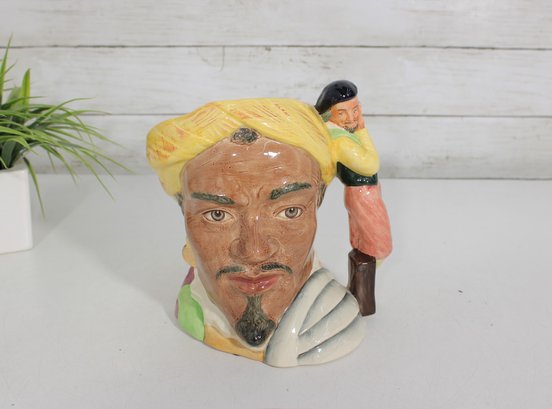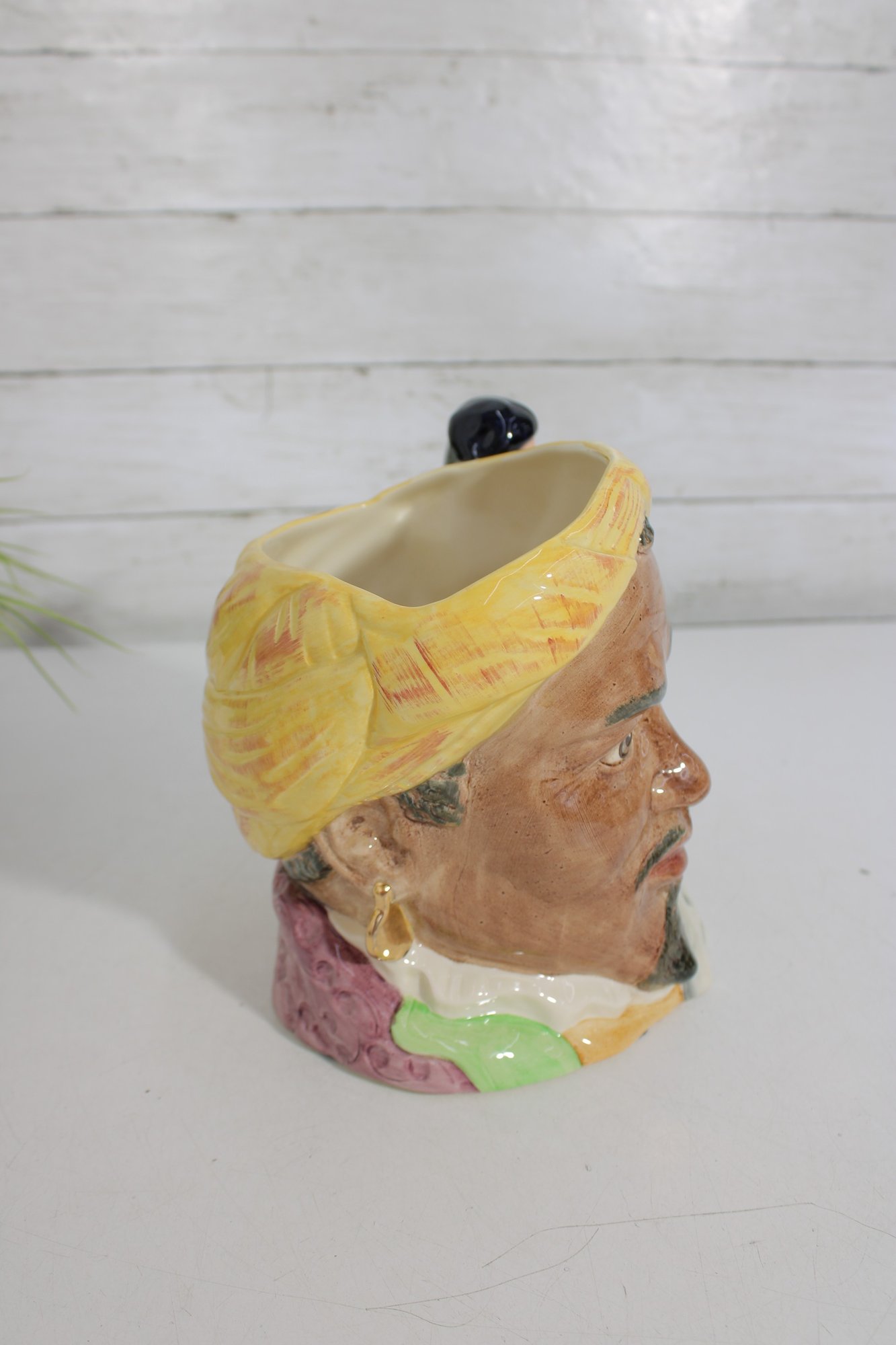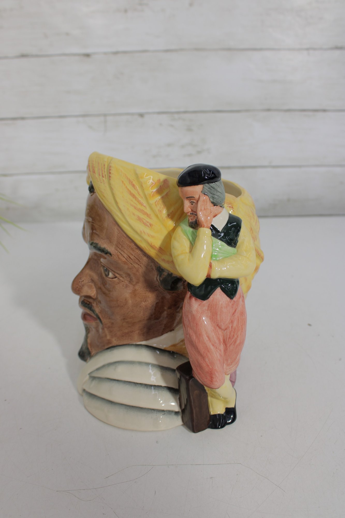 Royal Doulton hand-painted character mug depicting Othello, part of the highly collectible Shakespearean Series. This dramatic figural mug stands approximately 8 inches tall and features bold facial expression, detailed costume elements, and a sculpted handle formed as a standing figure—an exceptional example of Royal Doulton’s artistry.