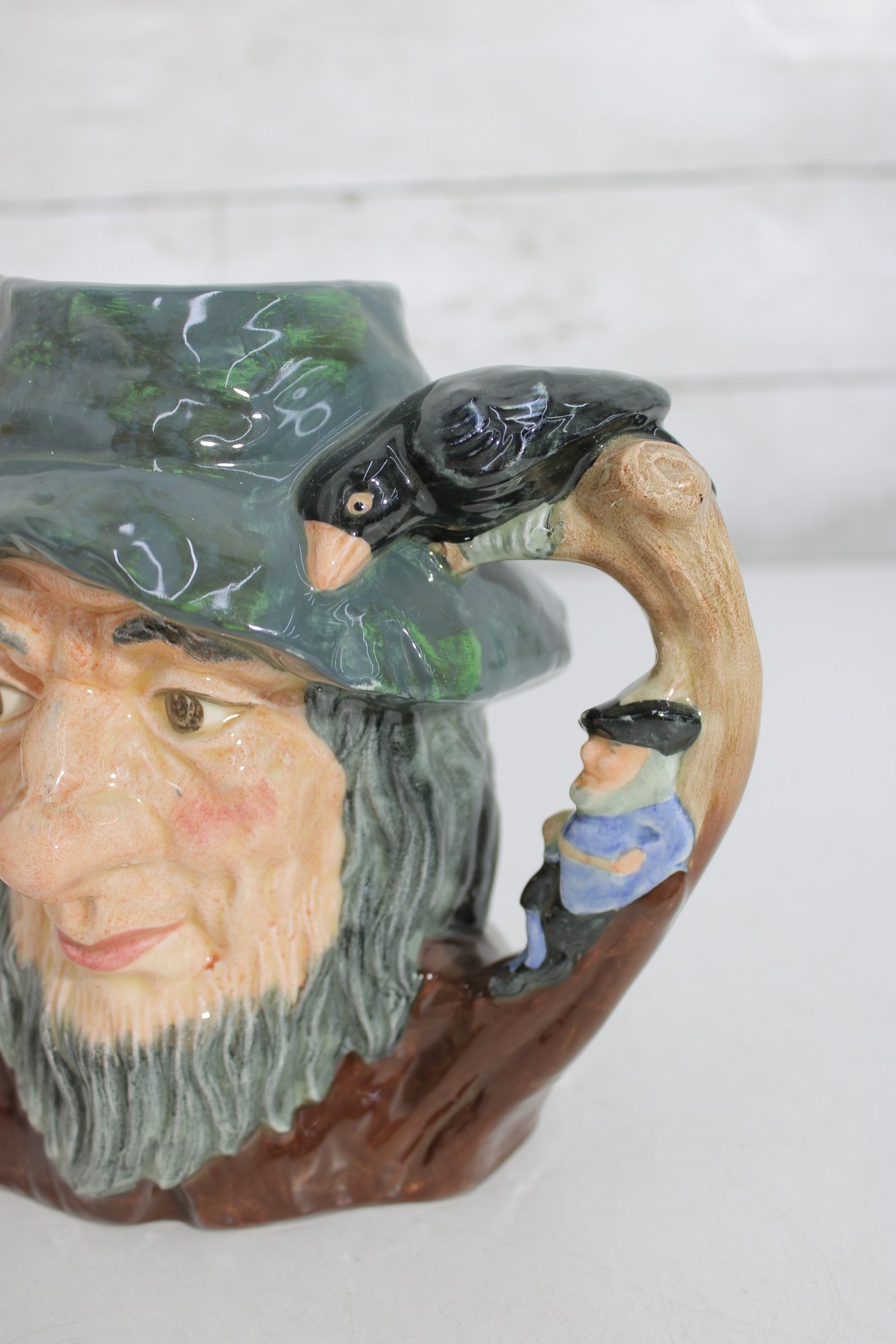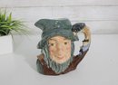 Royal Doulton hand-painted character mug depicting Rip Van Winkle, one of the most beloved figures in the Royal Doulton character ware line. This figural Toby-style mug stands approximately 7 inches tall and features beautifully modeled facial detail, a flowing beard, and his signature cap, with the handle formed as a raised arm holding a flask.