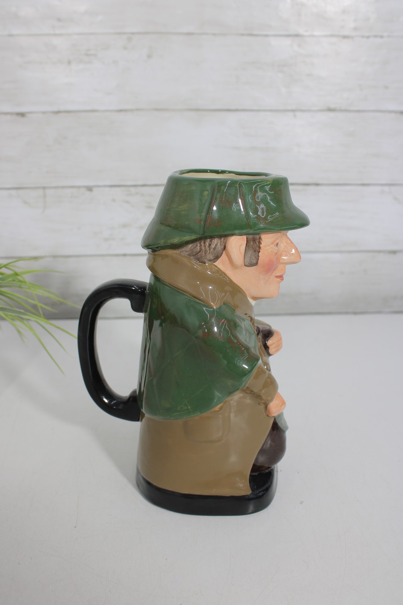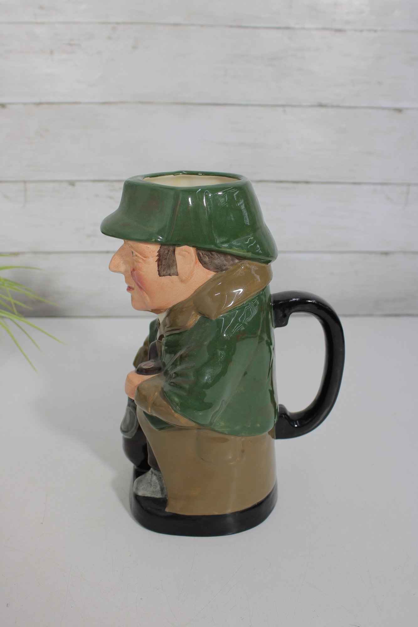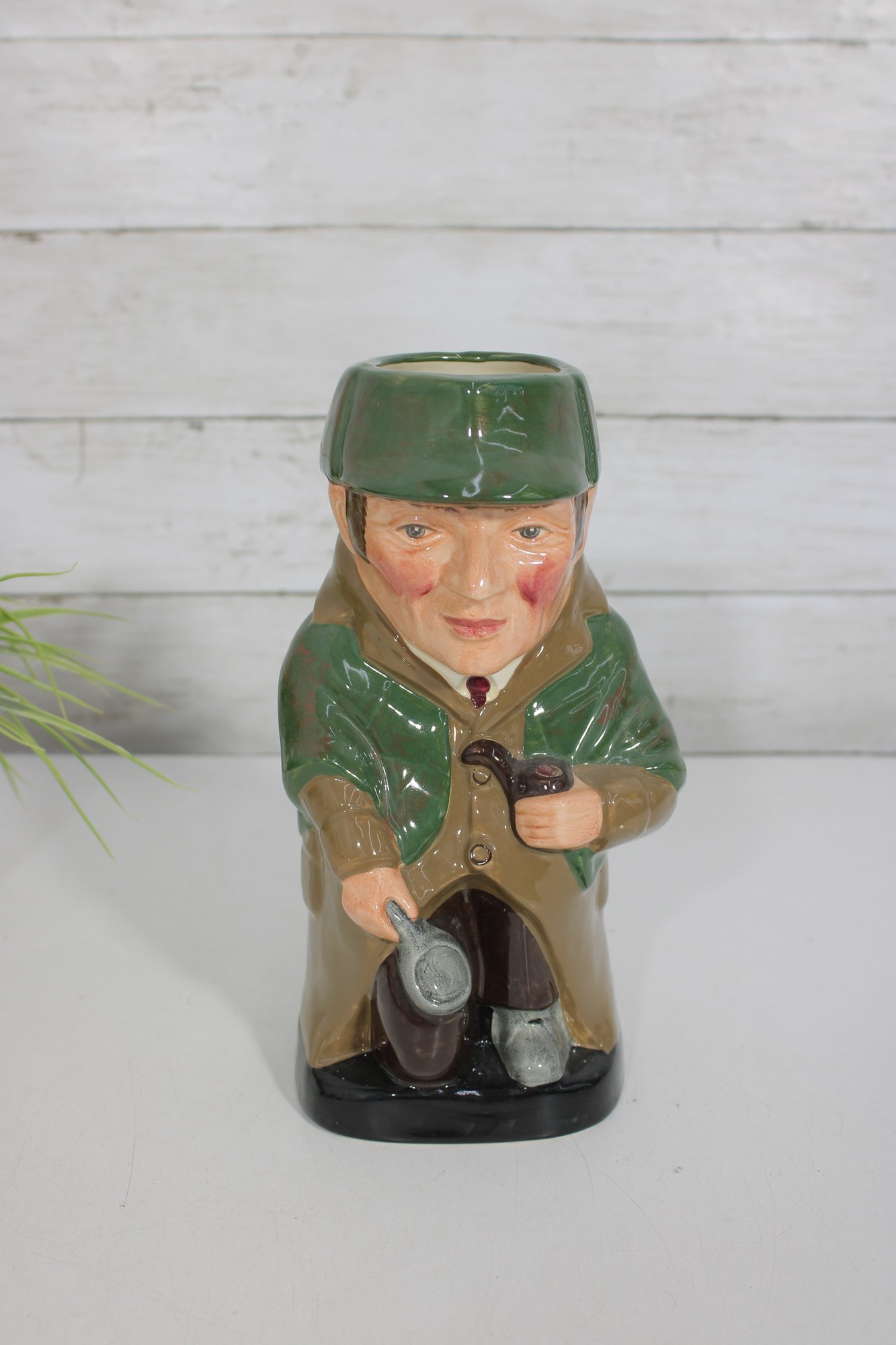 an impressive Royal Doulton hand-painted character jug depicting Sherlock Holmes, one of the most iconic figures in the Royal Doulton lineup. This large figural Toby-style jug stands approximately 9 inches tall and features Holmes in his classic cap and coat, holding his pipe, with excellent sculptural detail and rich glaze work throughout.