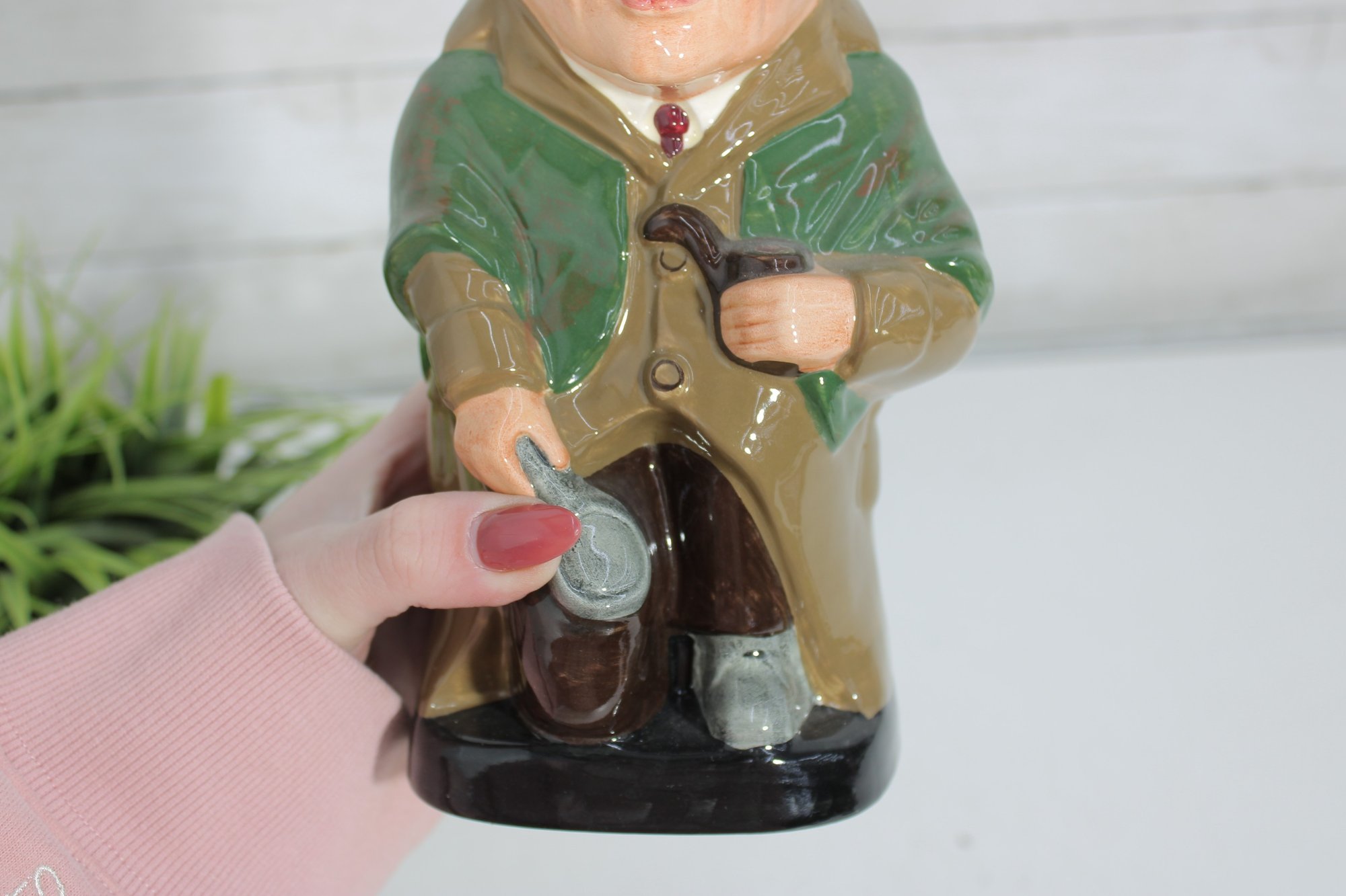 The expressive face, rosy cheeks, and carefully modeled accessories capture the character perfectly, making this a standout display piece. The base is clearly marked “Sherlock Holmes – Royal Doulton – Made in England”