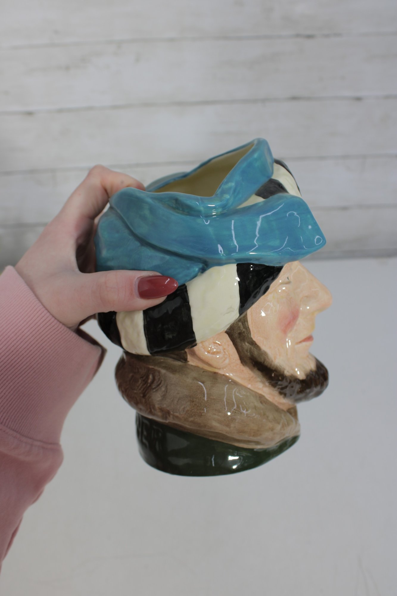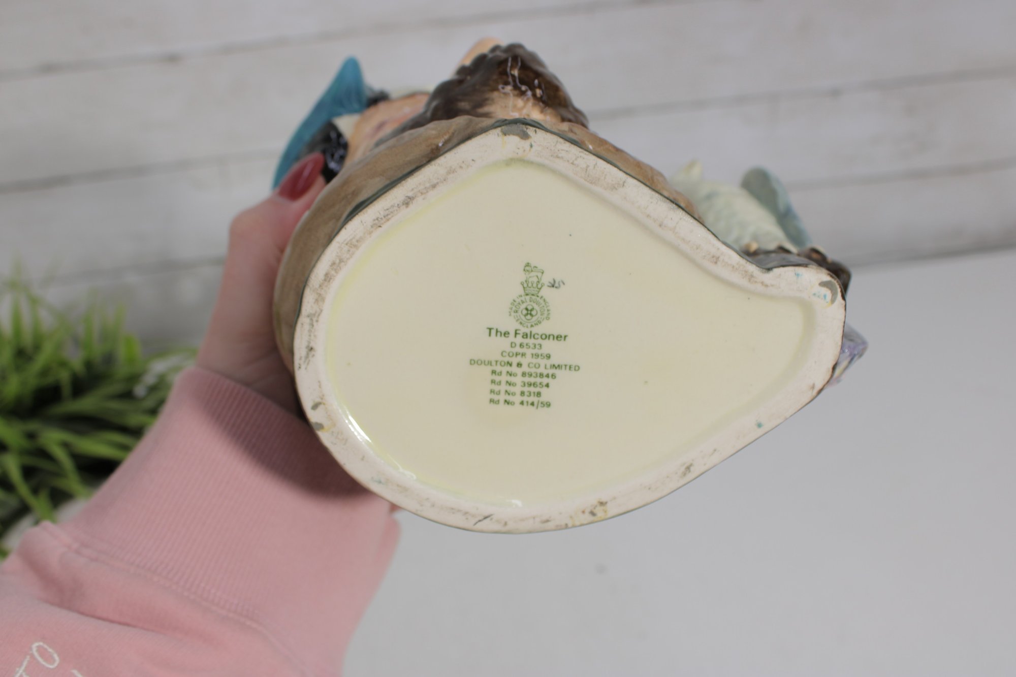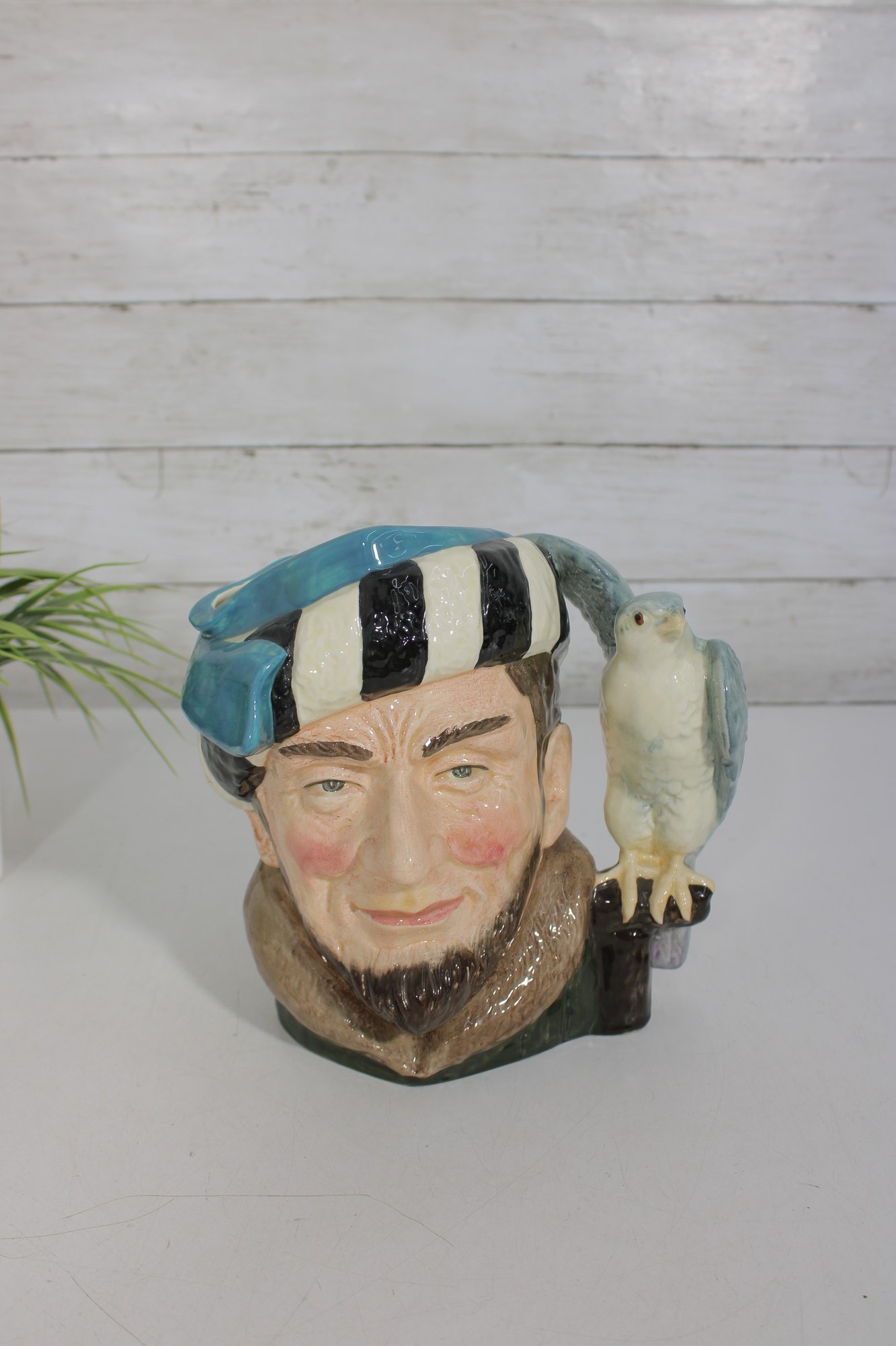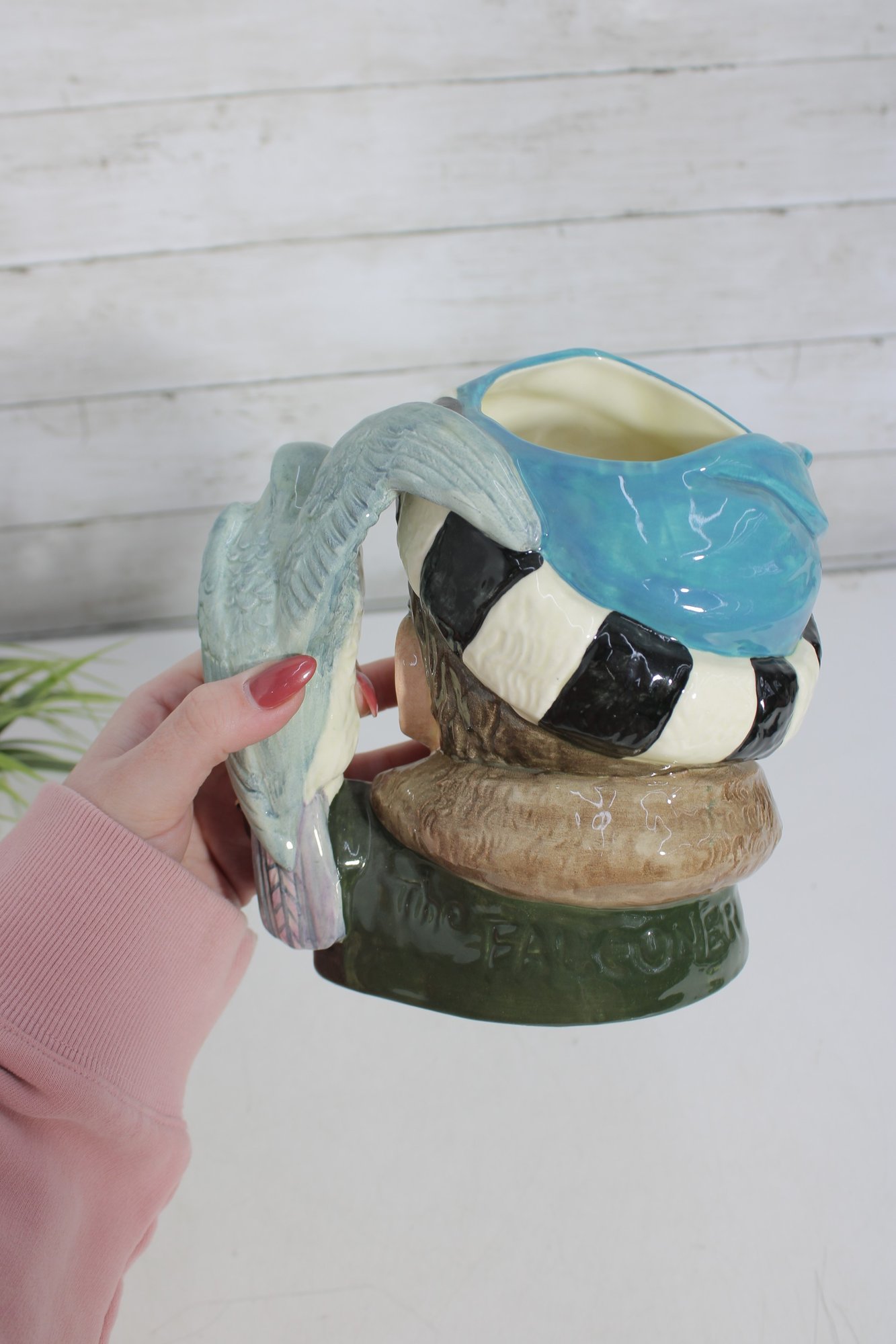 an authentic Royal Doulton large character jug titled “The Falconer,” model D6533. This striking Toby-style jug features a finely modeled falconer with a detailed bird of prey perched along the side, forming a dramatic and sculptural handle.