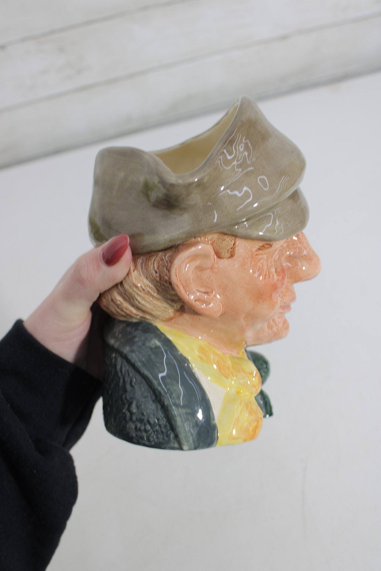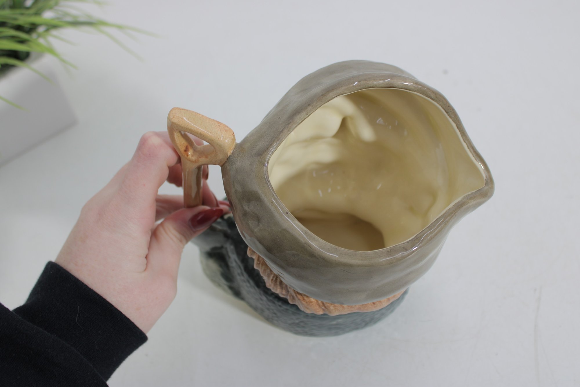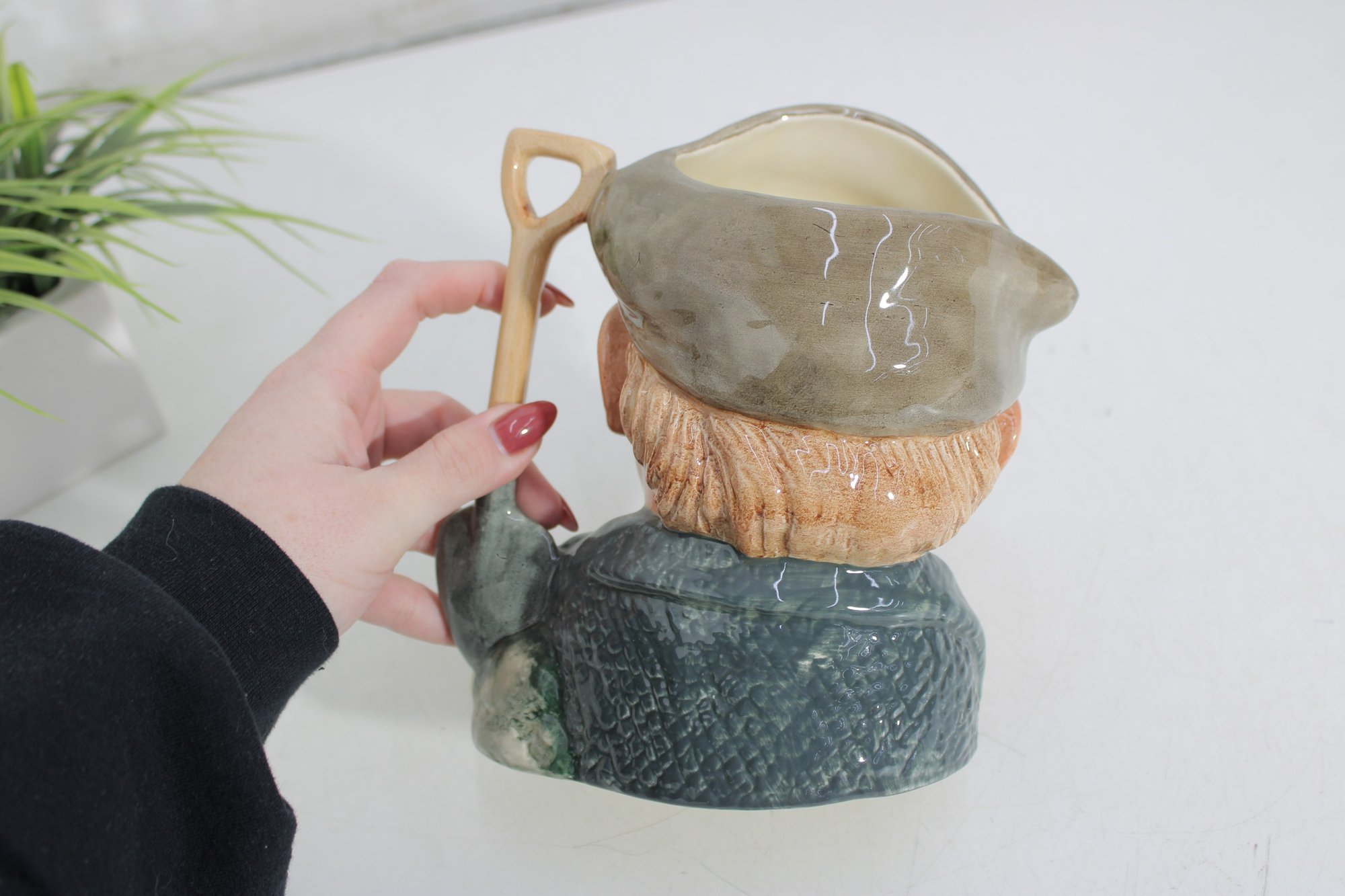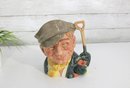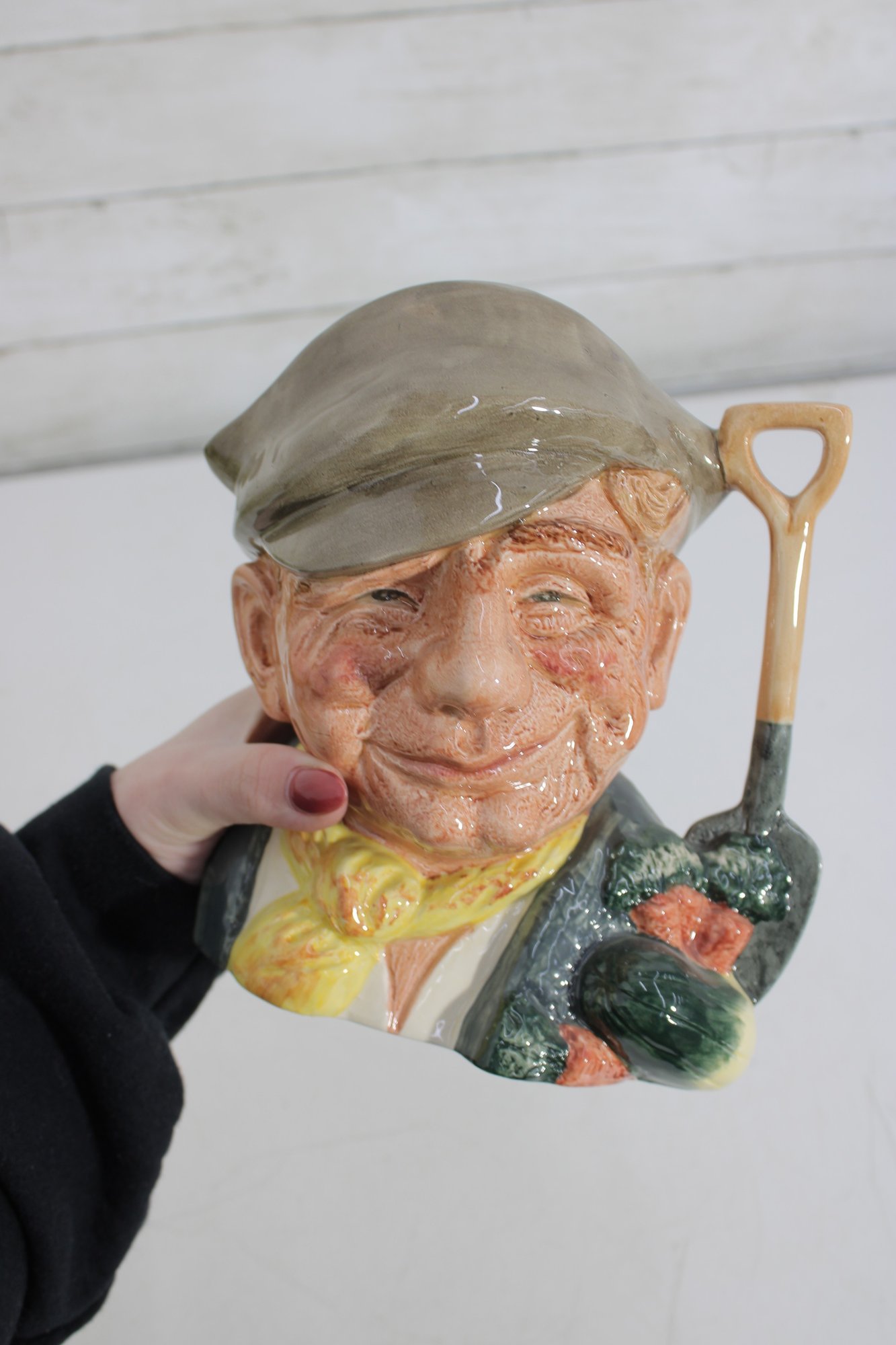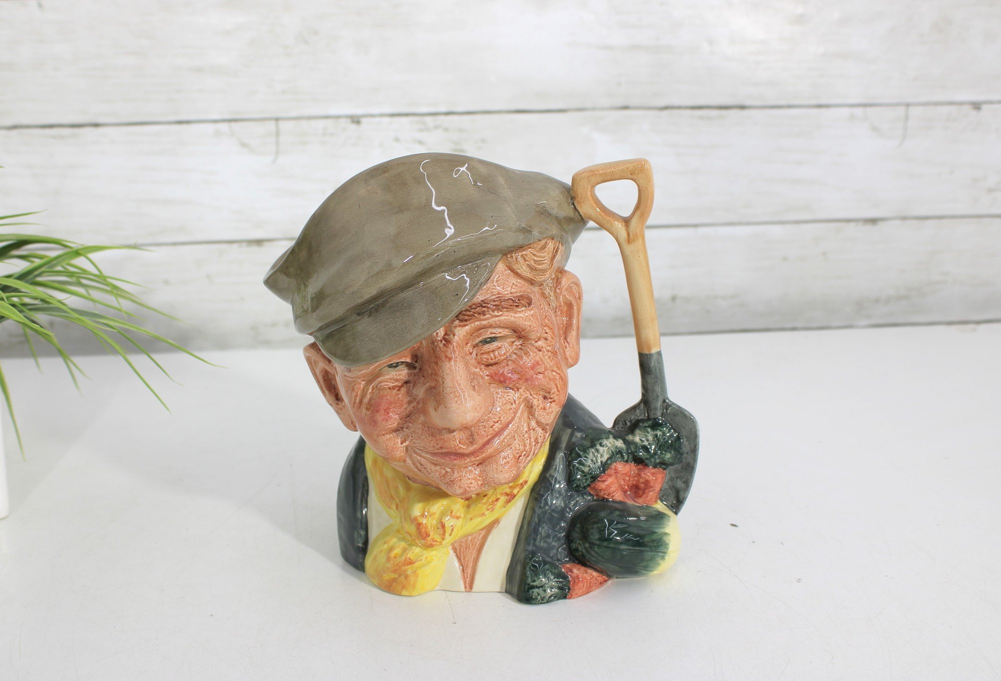 Standing approximately 7.5 inches tall, this large-size jug features a friendly, weathered face under a cap, with a detailed spade/shovel forming the handle — a wonderful sculptural touch that adds depth and personality. The hand-painted features and glossy glaze highlight the fine craftsmanship Royal Doulton is known for.