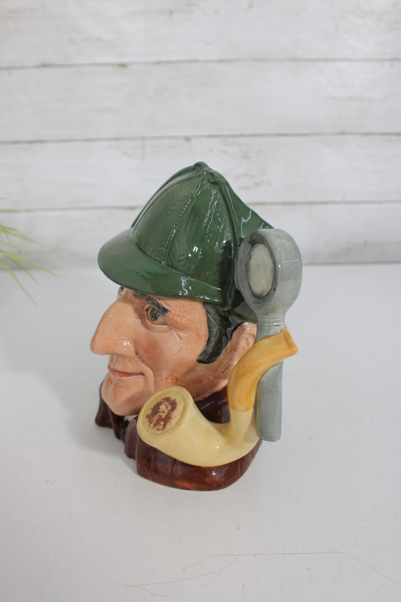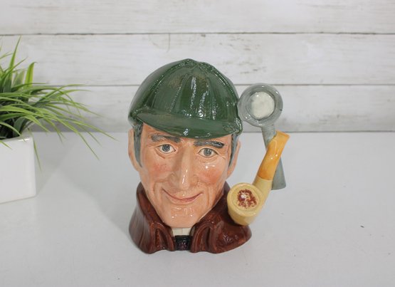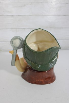 Royal Doulton character jug titled “The Sleuth.” This classic Toby-style piece depicts a detective in traditional attire, complete with cap and pipe, capturing the clever, inquisitive expression that defines this popular character.