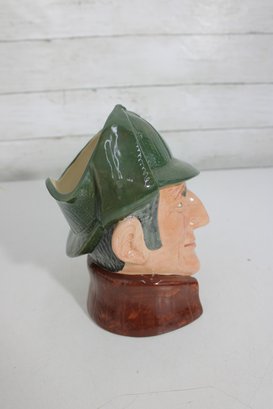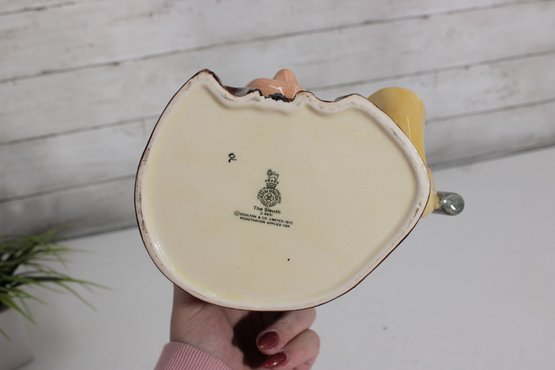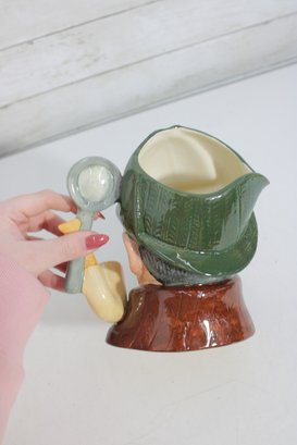 The hand-painted finish highlights the expressive face, textured clothing, and fine sculptural detail that Royal Doulton is renowned for. The figural handle integrates seamlessly into the design, giving the piece strong depth and visual interest. The base is clearly marked with the Royal Doulton backstamp