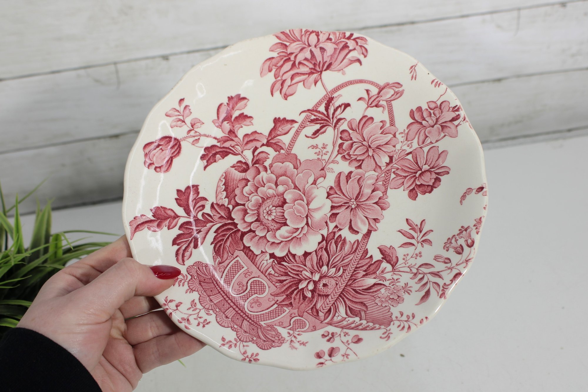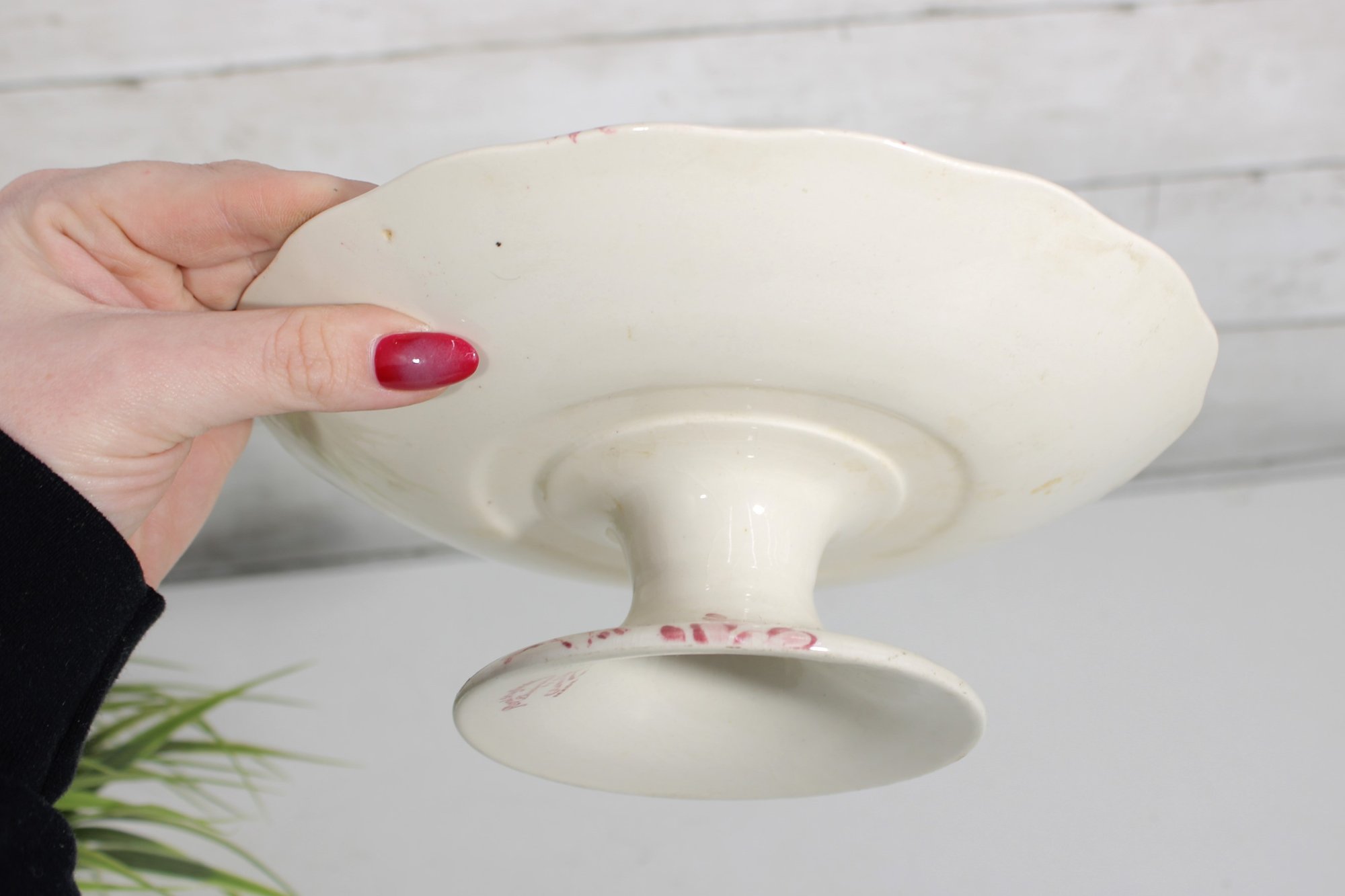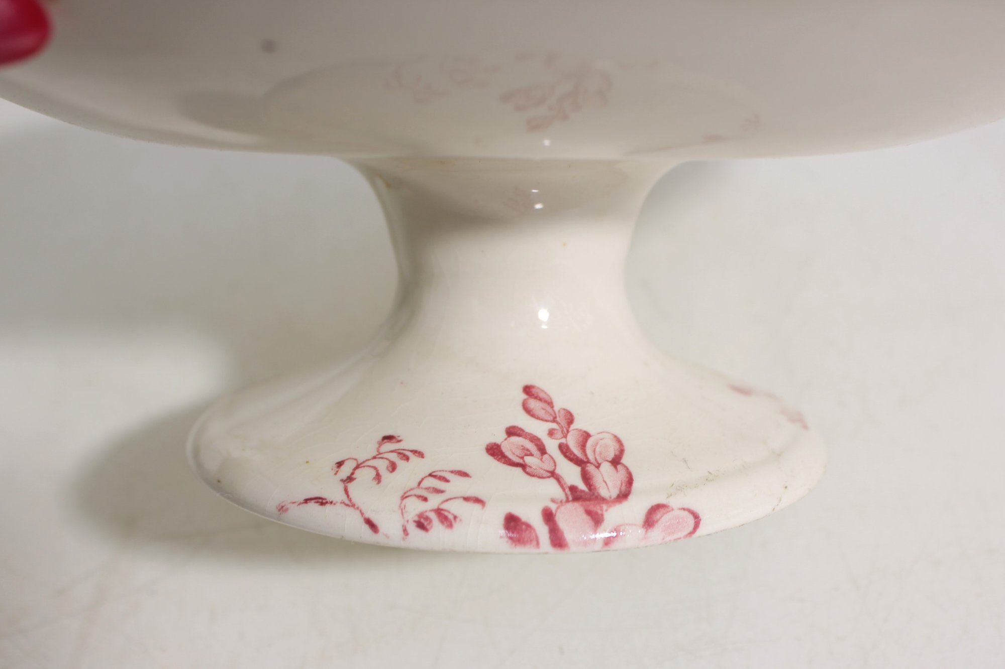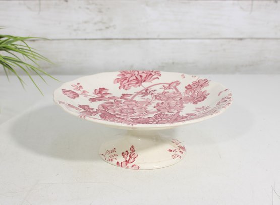 vintage cake plate by Royal Staffordshire, designed by Clarice Cliff, featuring a beautiful pink floral transferware pattern. This charming pedestal stand showcases classic English design with detailed blossoms and foliage set against a soft cream background.
