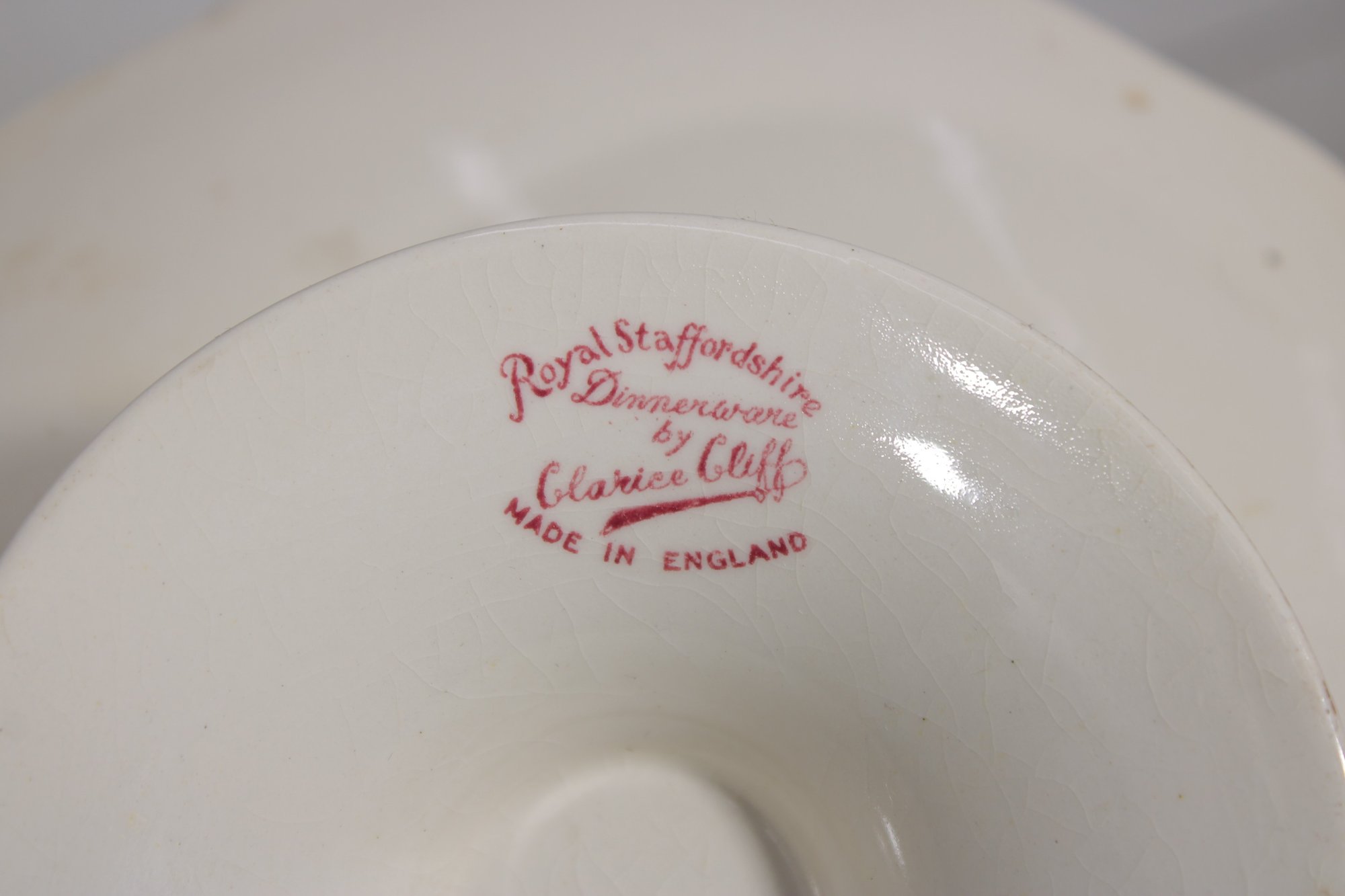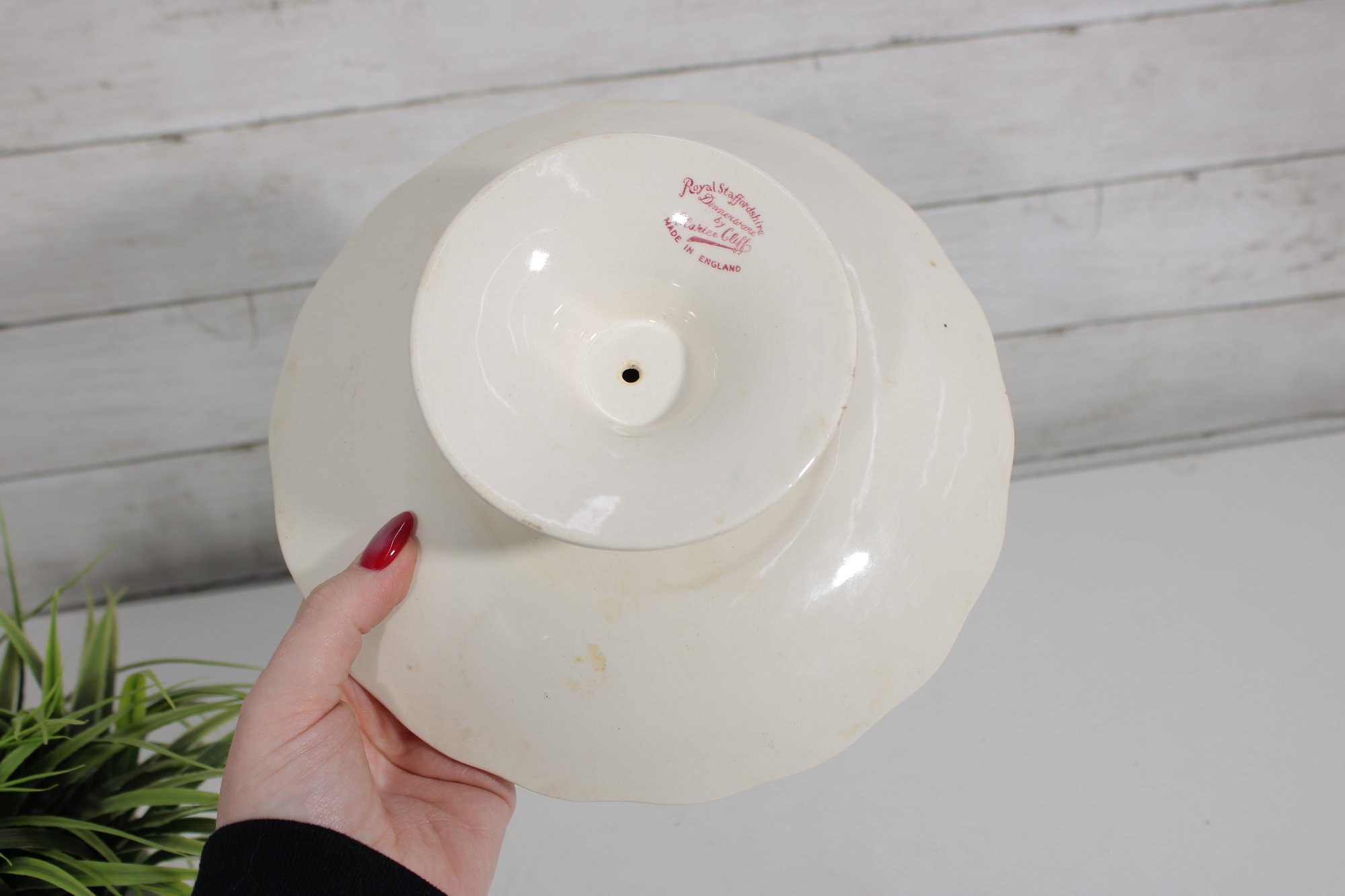 The gently scalloped edge and raised pedestal base add a refined touch, making it perfect for serving cakes, pastries, or displaying desserts in style. The underside is clearly marked “Royal Staffordshire – Clarice Cliff – Made in England.”