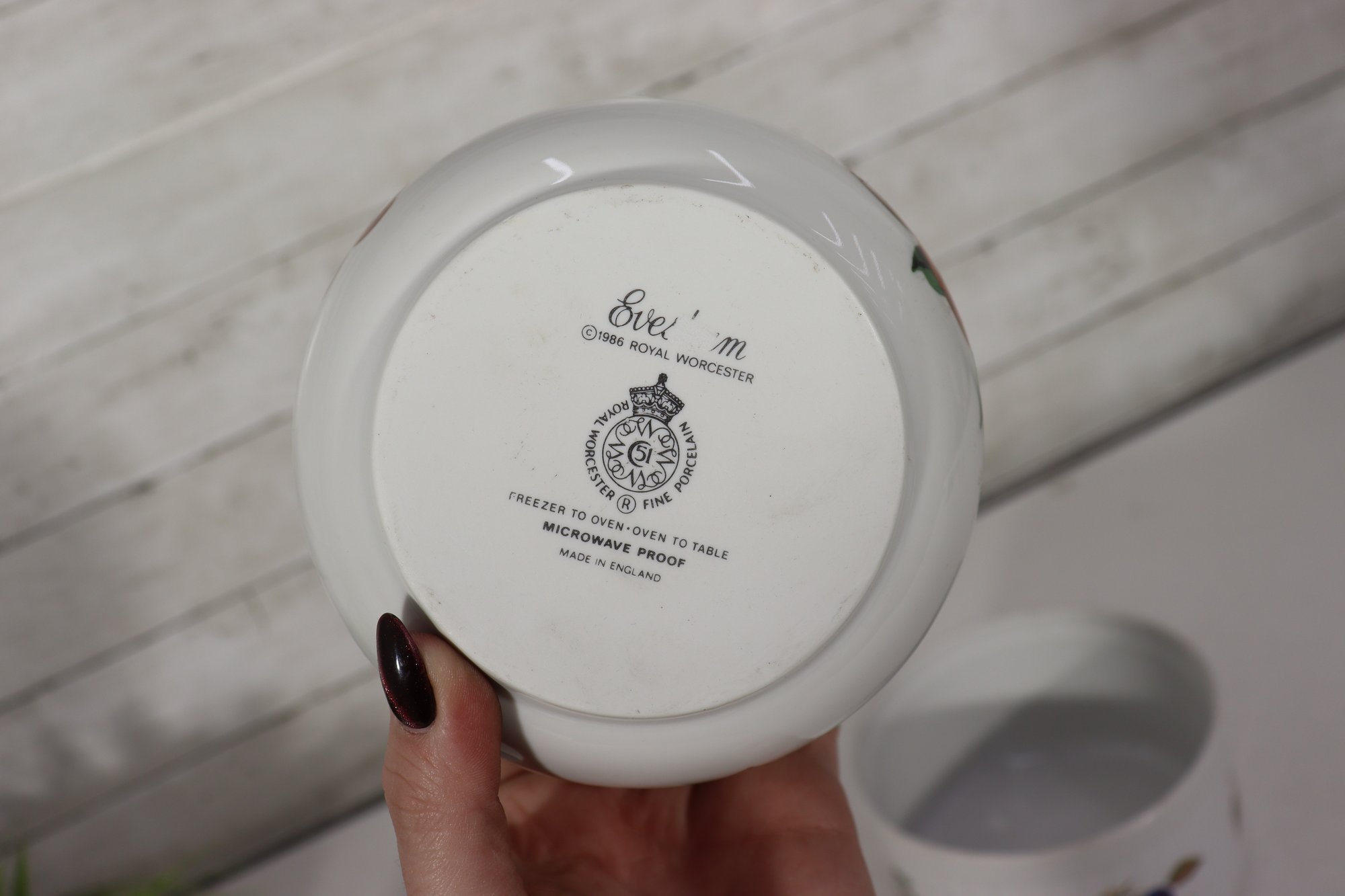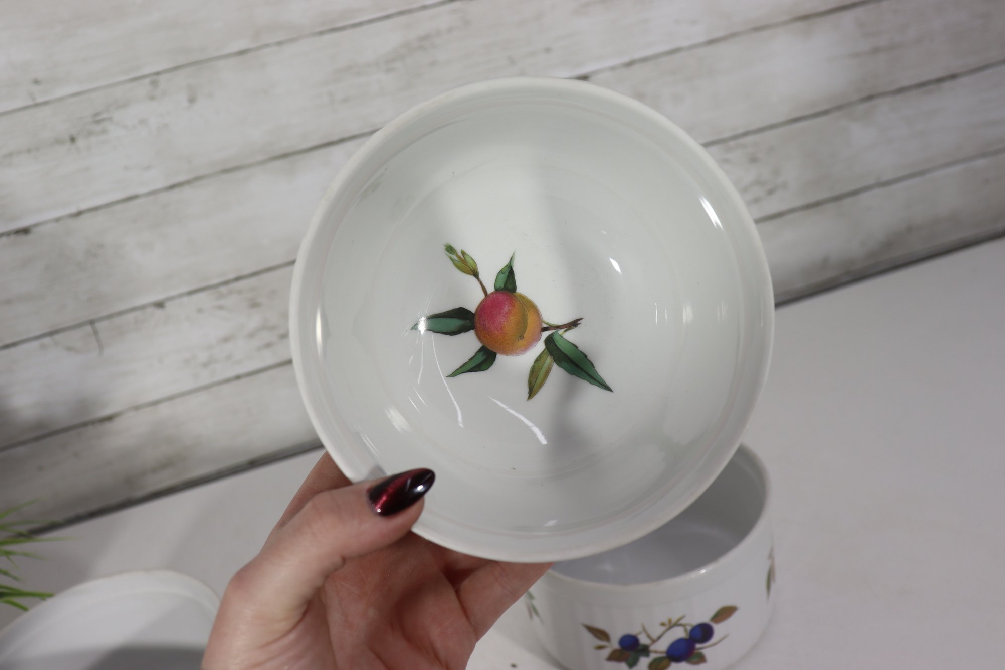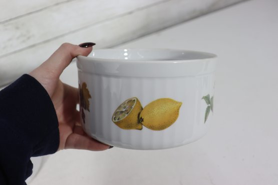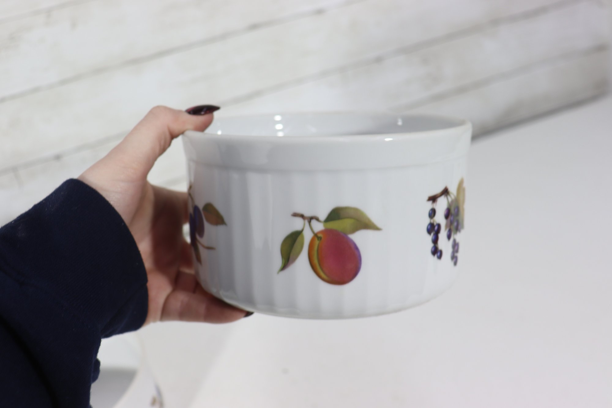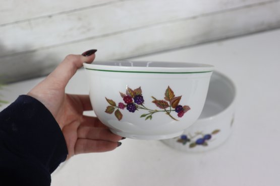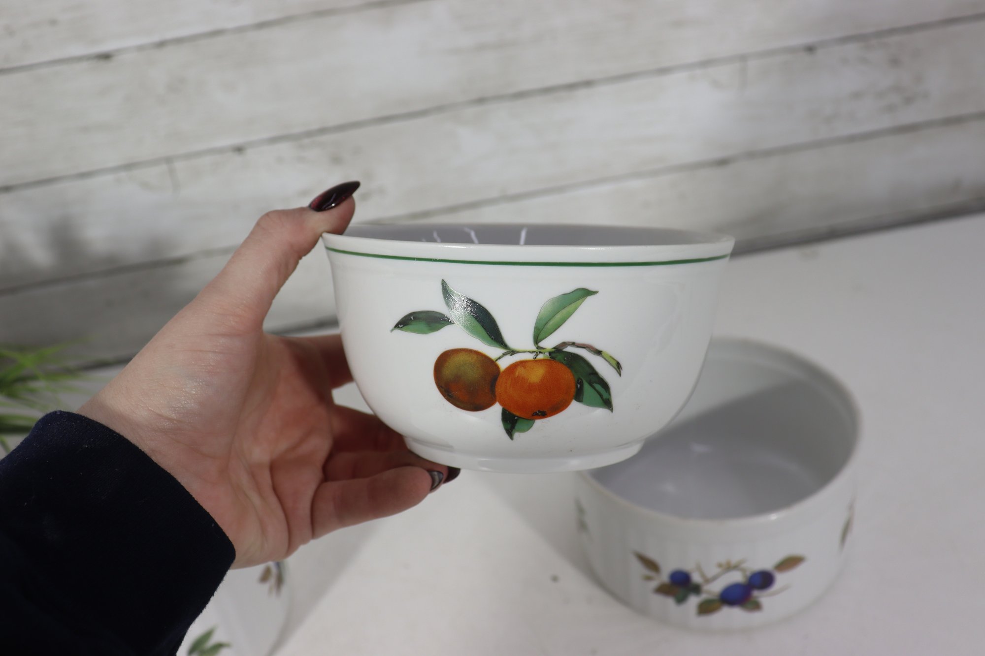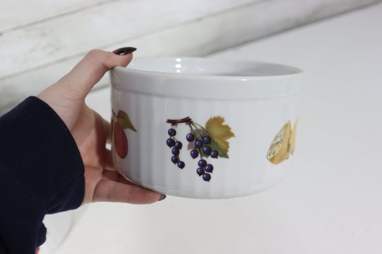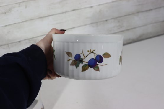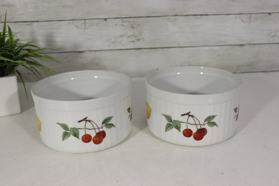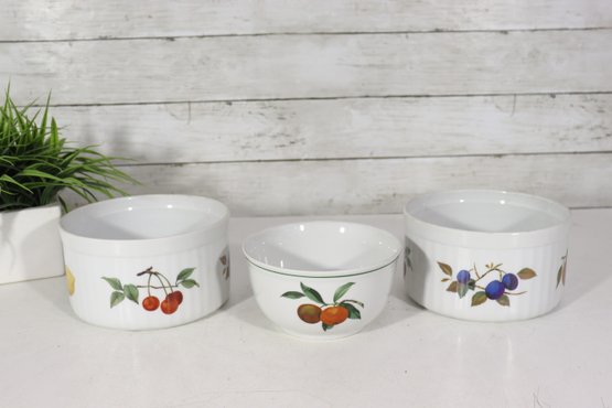 Beautiful set of Royal Worcester Evesham porcelain ramekins, decorated with the classic hand-painted fruit motifs that make this pattern so beloved. The set includes three matching pieces in two sizes, perfect for baking, serving, or display in a traditional or cottage-style kitchen.