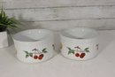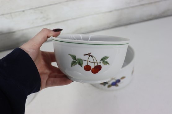 Each bowl features ribbed white porcelain with colorful fruit illustrations including cherries, oranges, plums, and grapes. The bases are marked Royal Worcester – Fine Porcelain, confirming quality English craftsmanship.