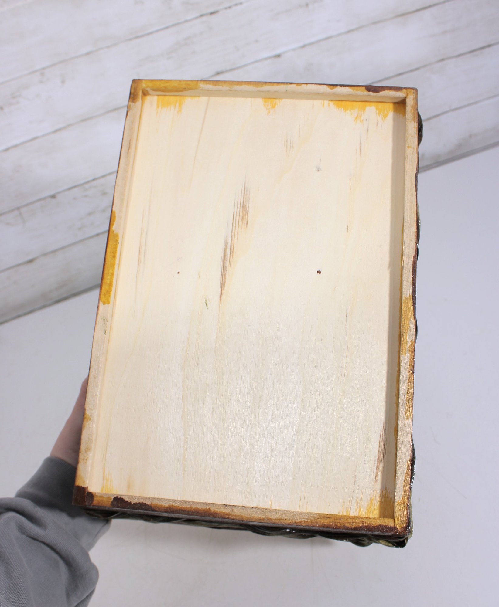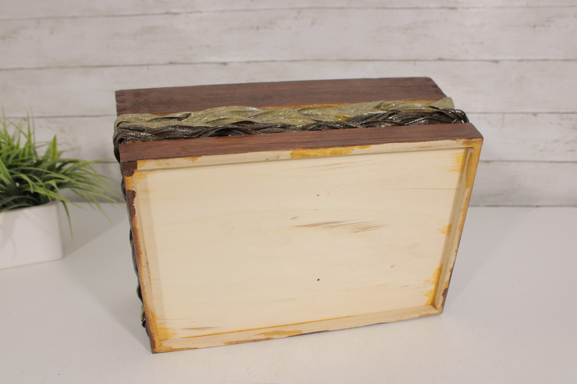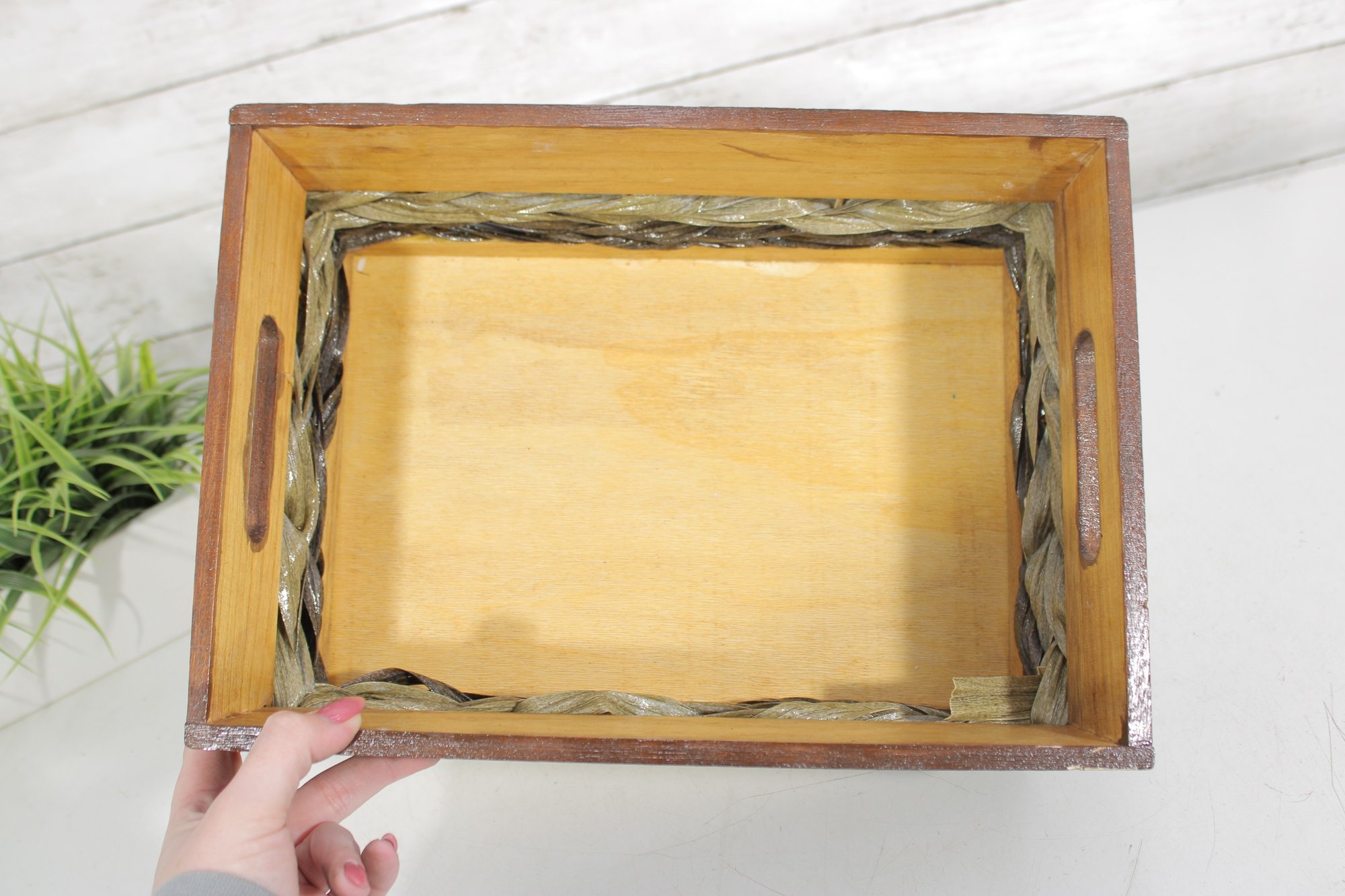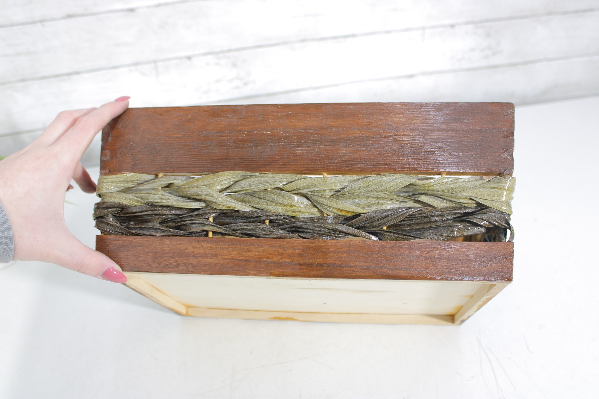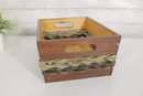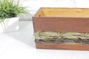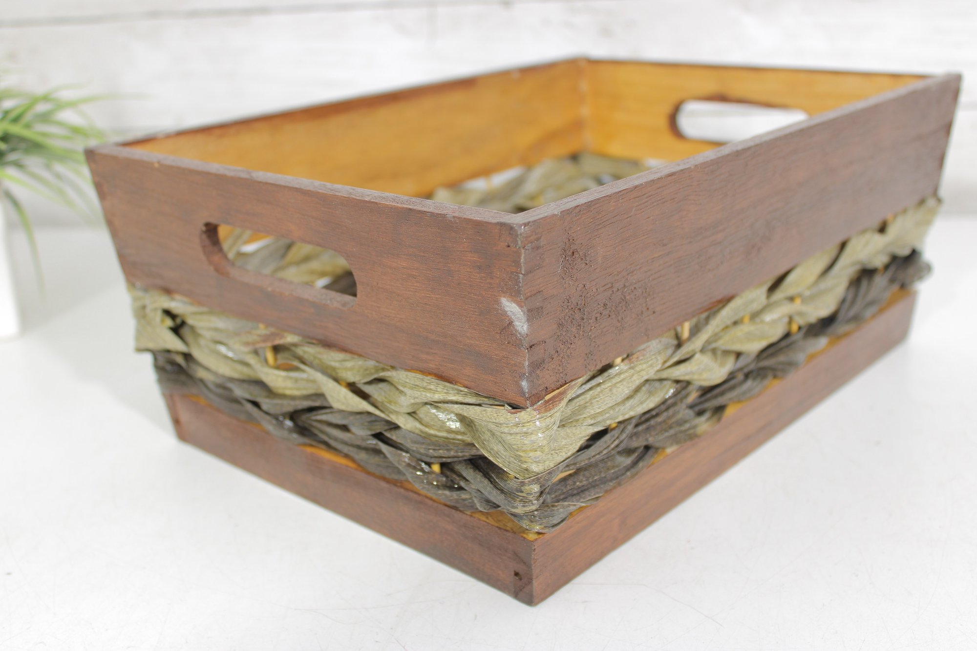 Rustic Wooden Storage Crate Basket W/ Woven Band Handles Farmhouse 13.5