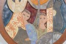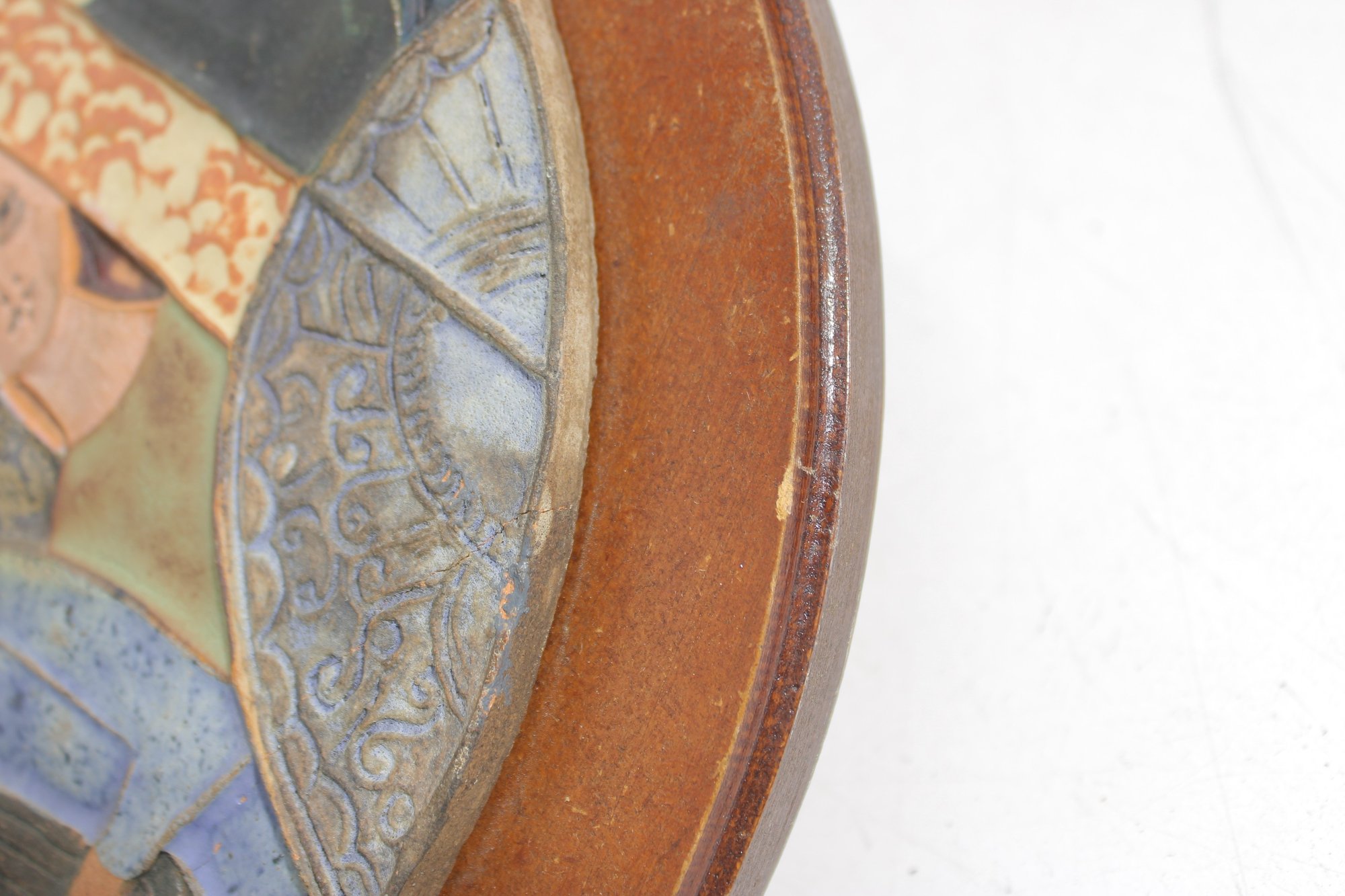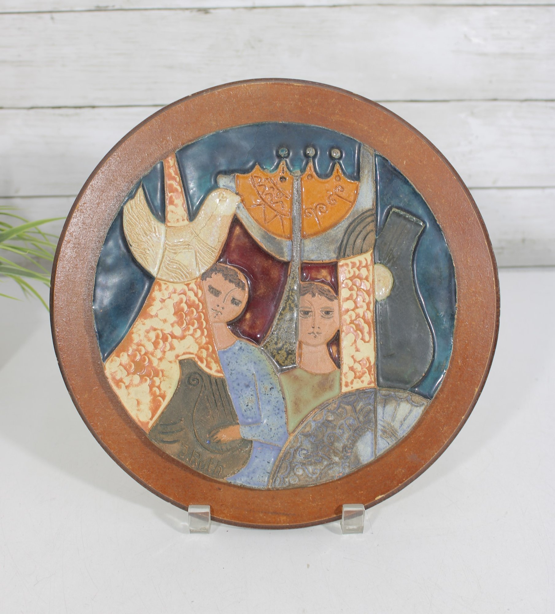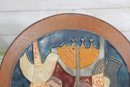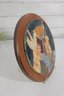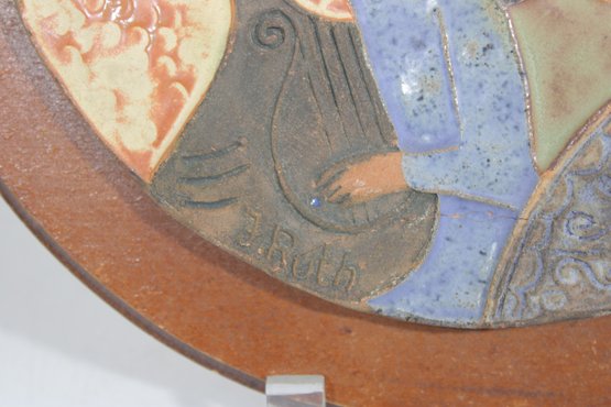 vintage glazed ceramic art tile attributed to Ruth Factor, featuring a beautifully stylized figural scene rendered in rich mid-century tones. The composition depicts two figures alongside symbolic elements including a dove and ornate forms, all framed within a circular wooden border.