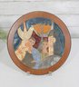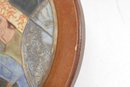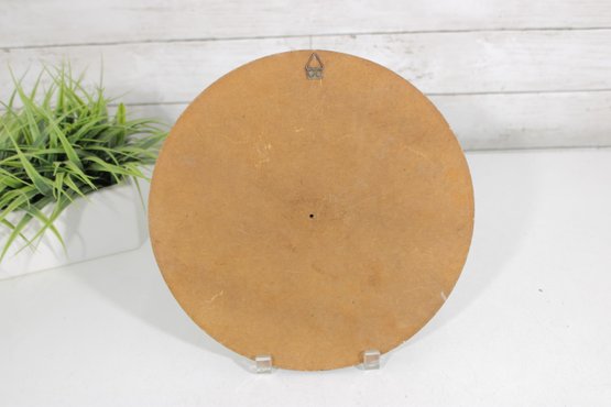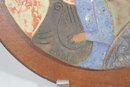 The tile showcases a hand-crafted, dimensional glaze with textured detailing and a warm, earthy color palette of blues, terracotta, gold, and cream. Measuring approximately 11 inches in diameter, this piece is mounted within a round wood frame and includes a hanger on the back for easy wall display.