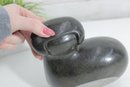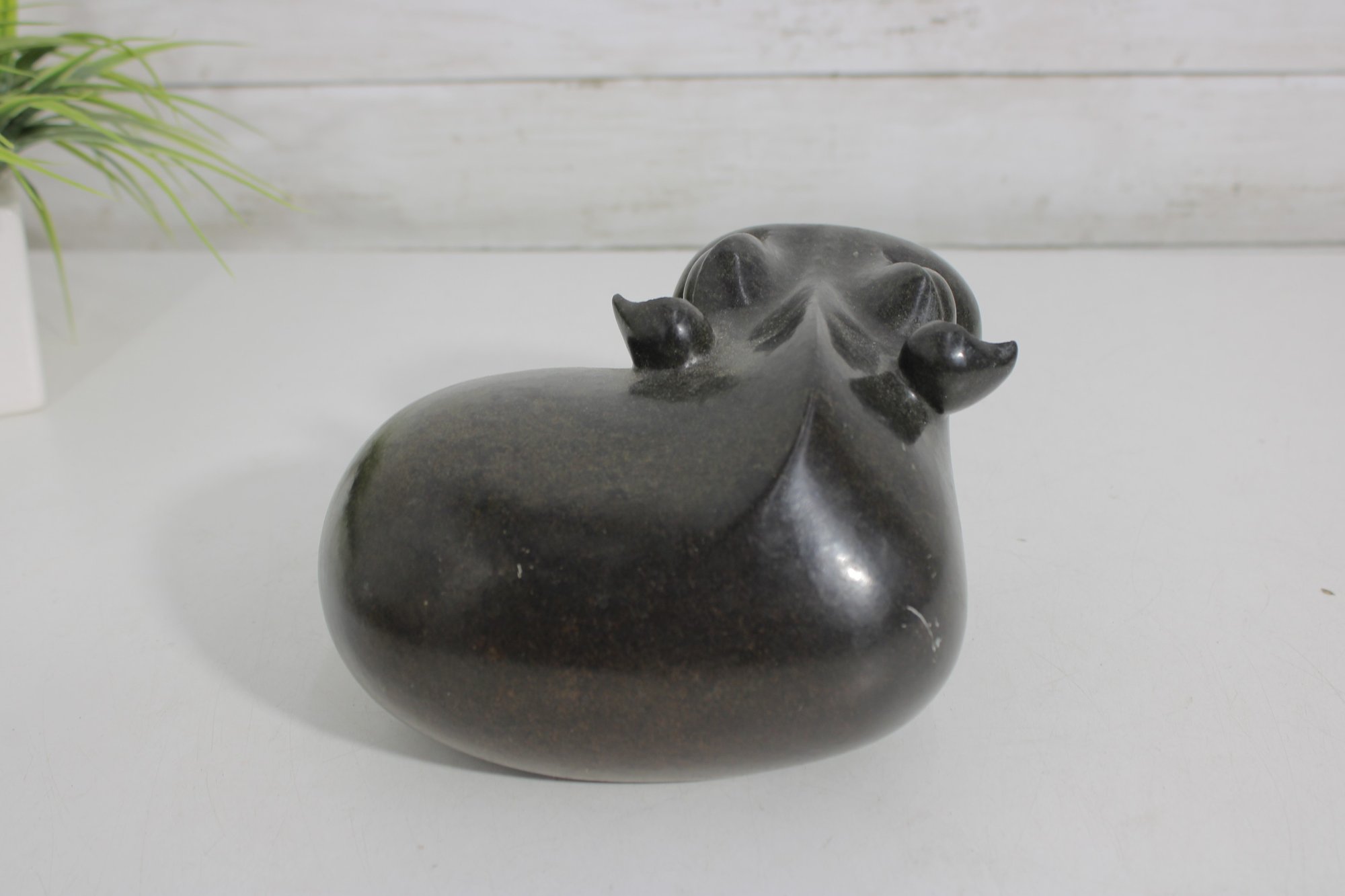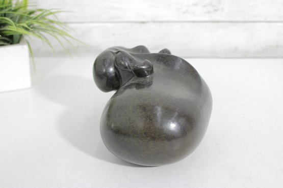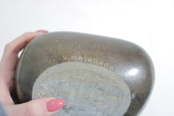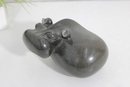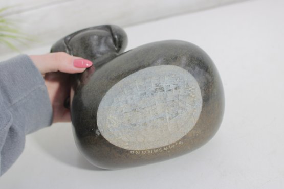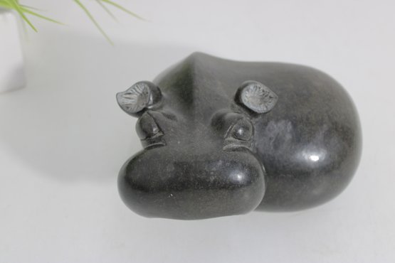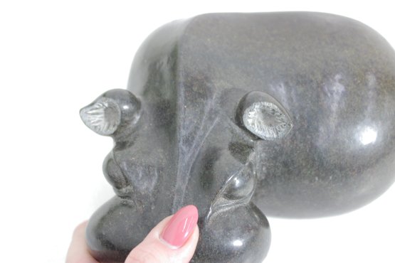 Beautiful hand-carved stone hippopotamus sculpture, signed “S. Masaoka” on the underside. This charming piece features a smooth, rounded form with stylized facial details and a polished dark stone finish that highlights subtle natural variations in the material.