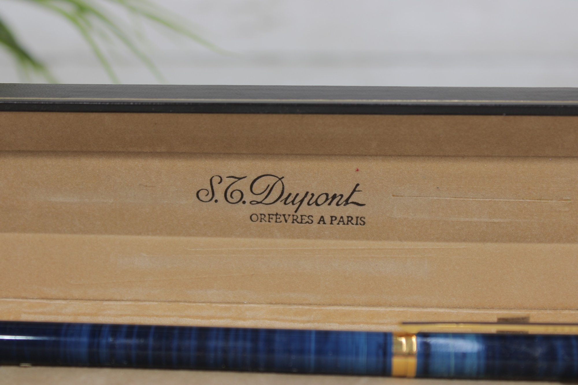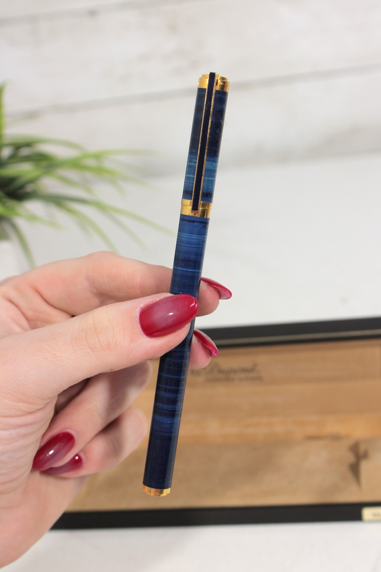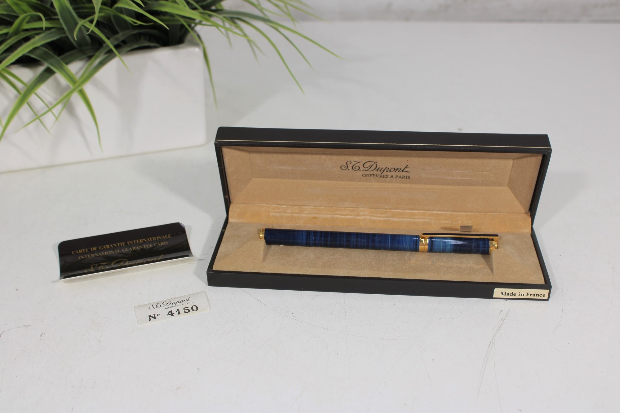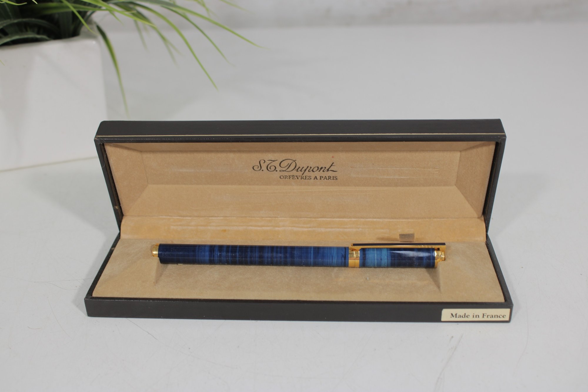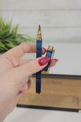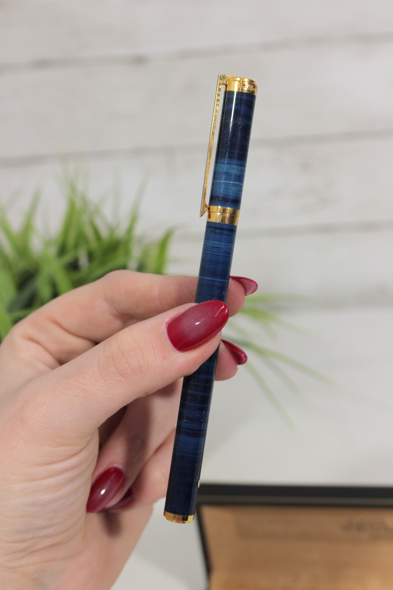 here is a luxurious S.T. Dupont Laque de Chine fountain pen in the elegant Ocean Blue pattern, model #4150. Crafted in France, this fine writing instrument features Dupont’s renowned Chinese lacquer finish with deep blue tones and subtle patterning, complemented by gold-plated trim.