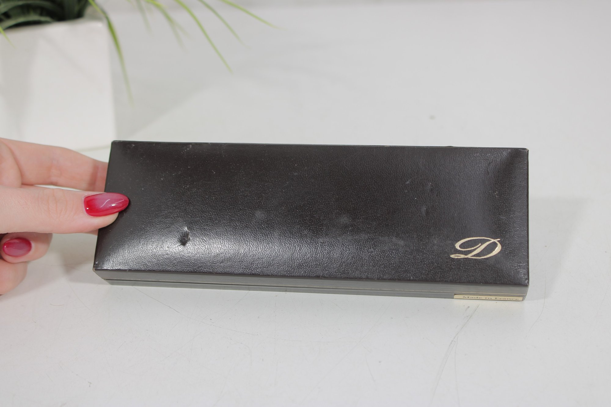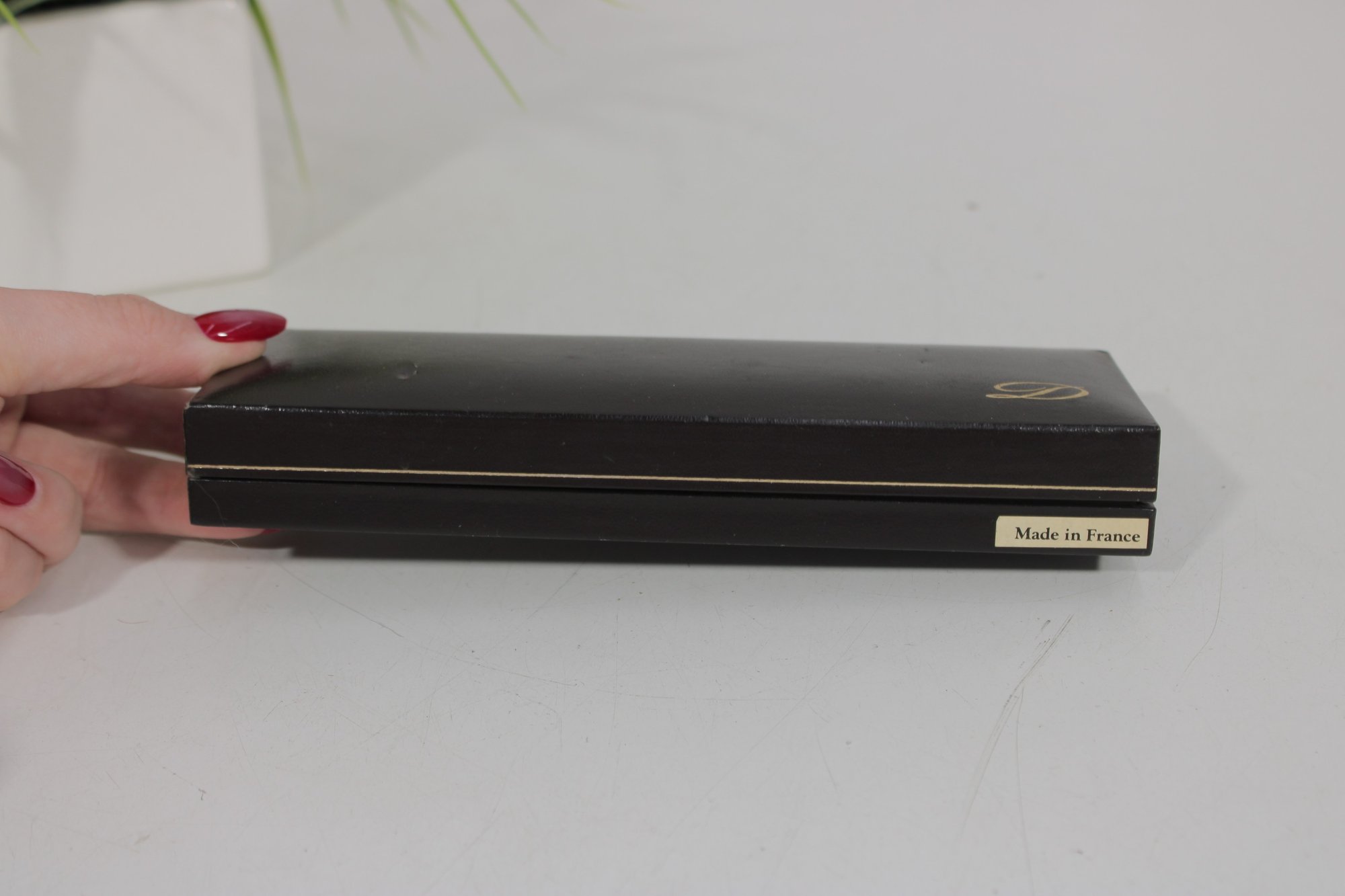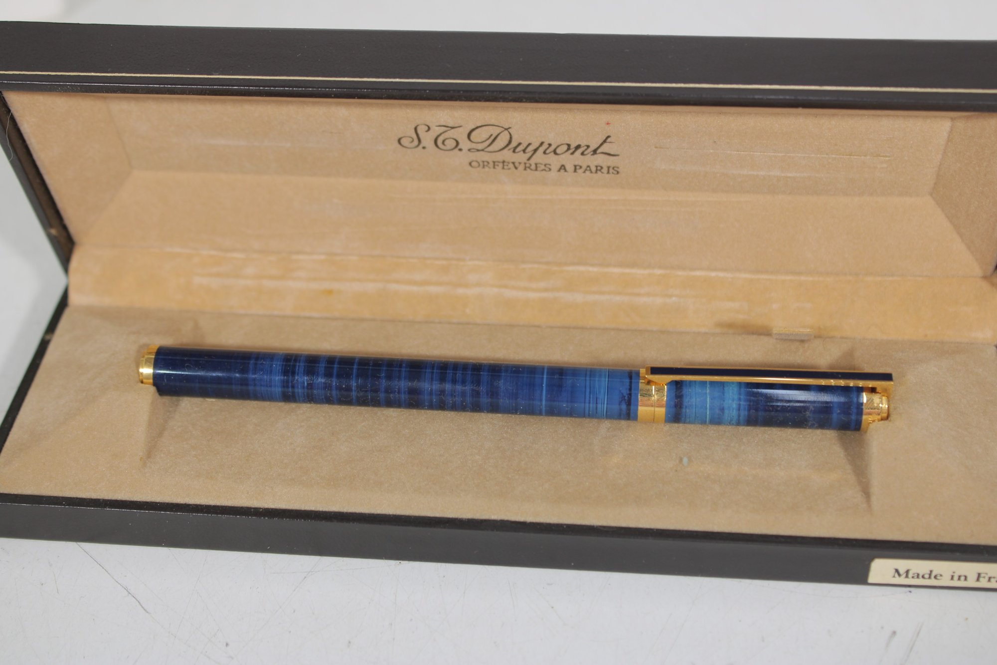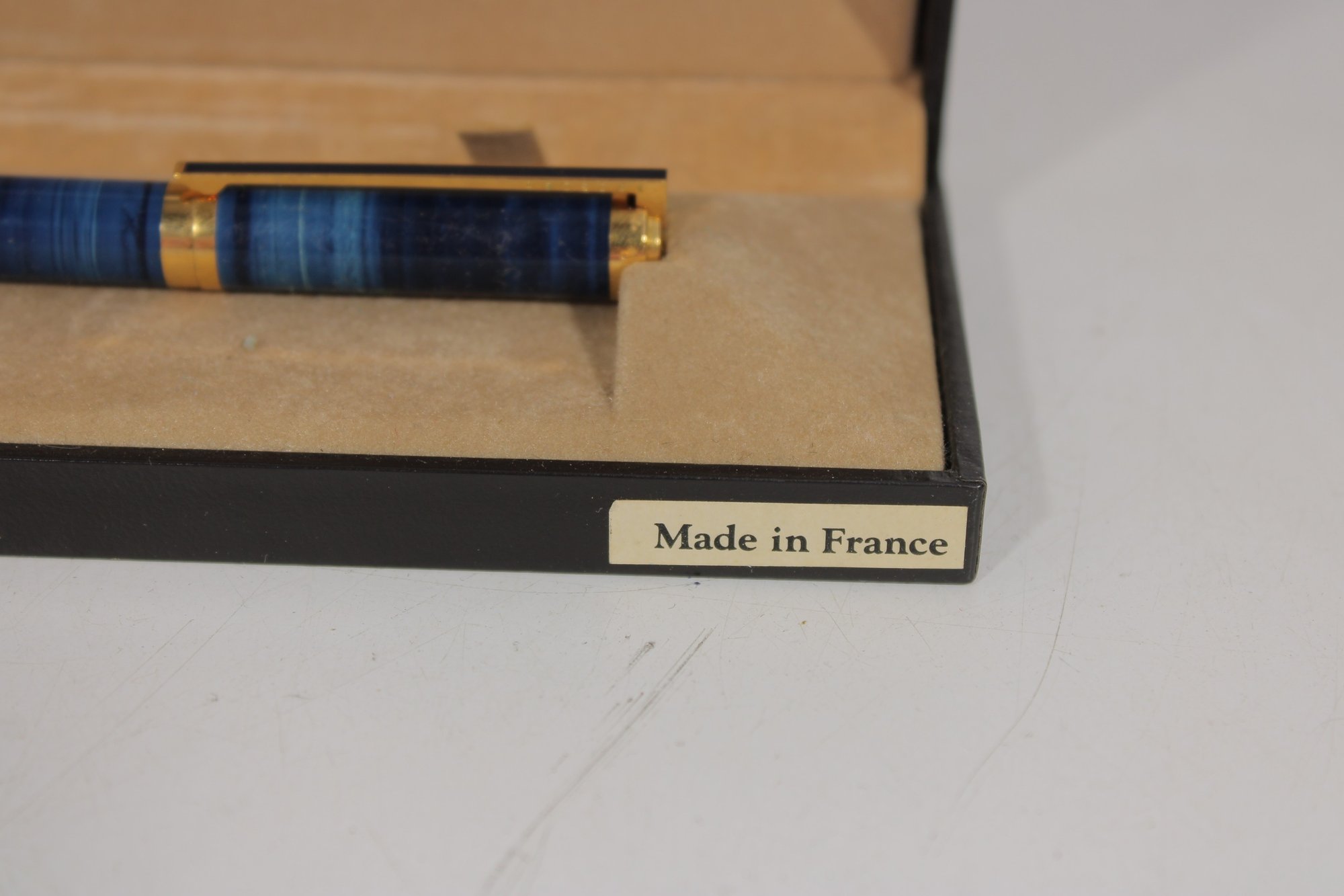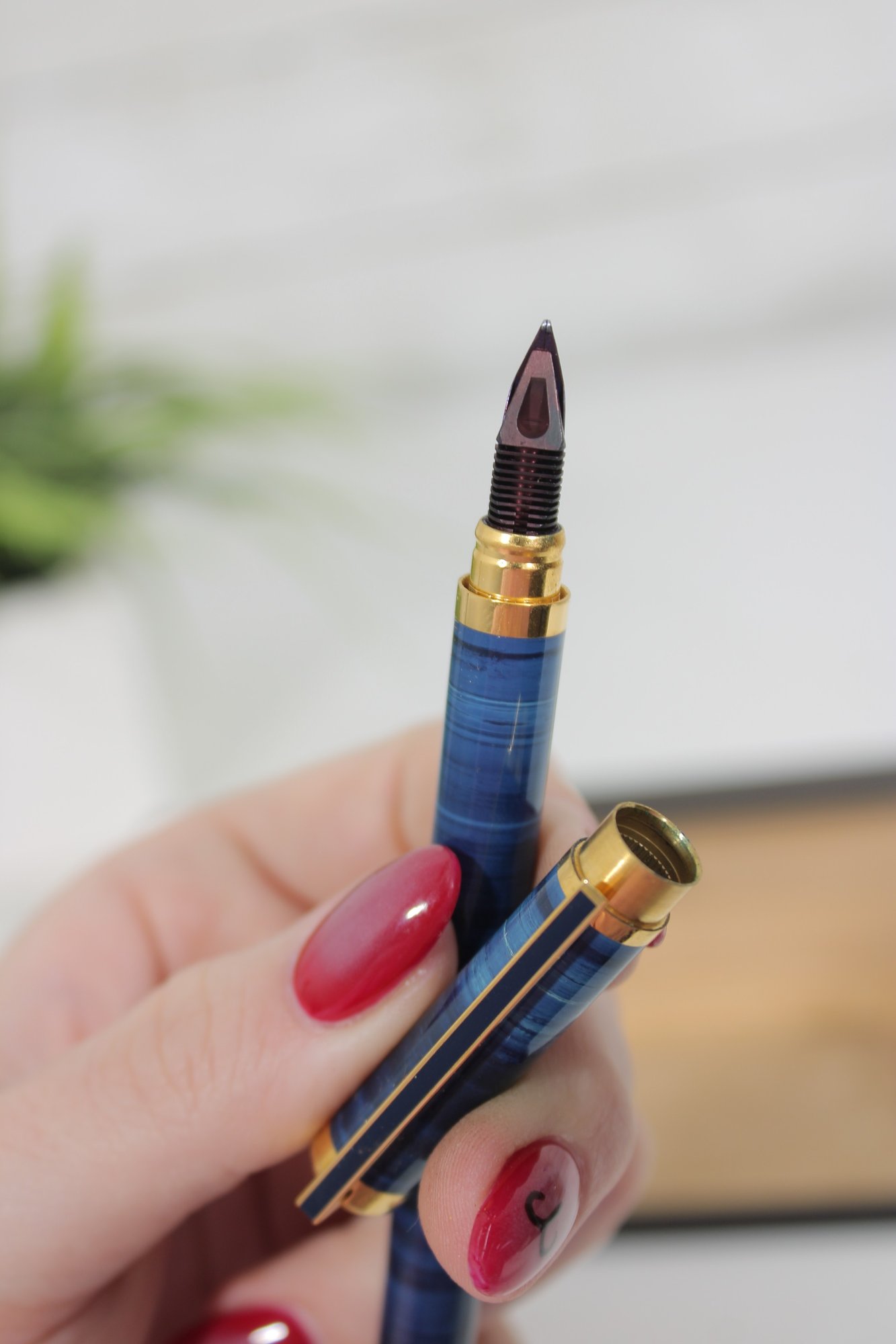 here is a luxurious S.T. Dupont Laque de Chine fountain pen in the elegant Ocean Blue pattern, model #4150. Crafted in France, this fine writing instrument features Dupont’s renowned Chinese lacquer finish with deep blue tones and subtle patterning, complemented by gold-plated trim.