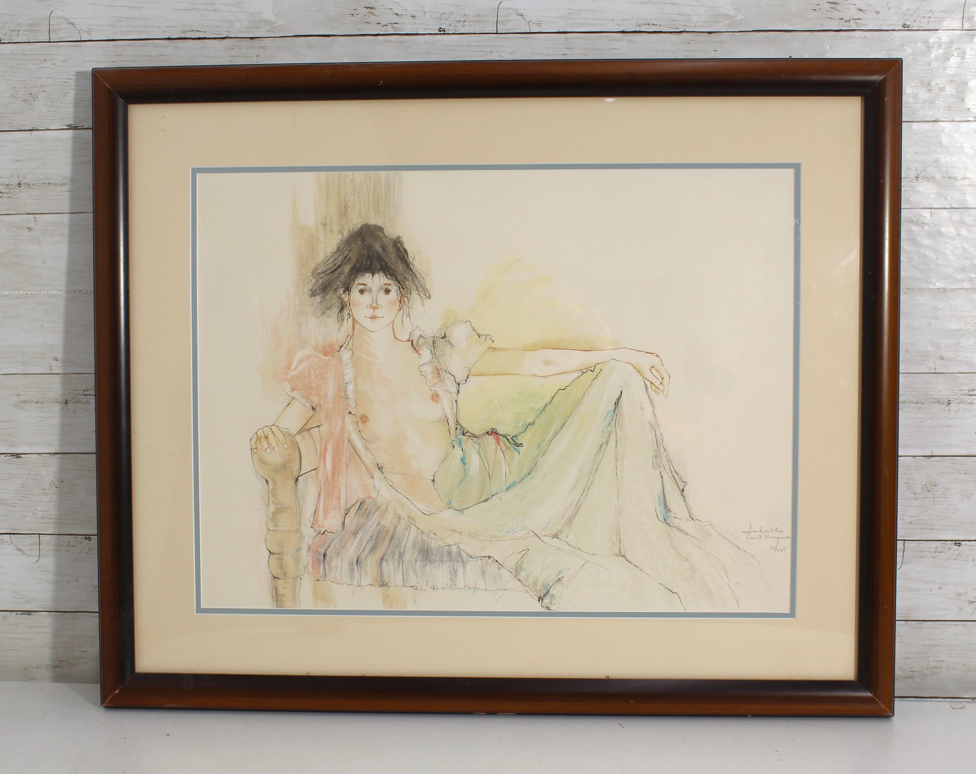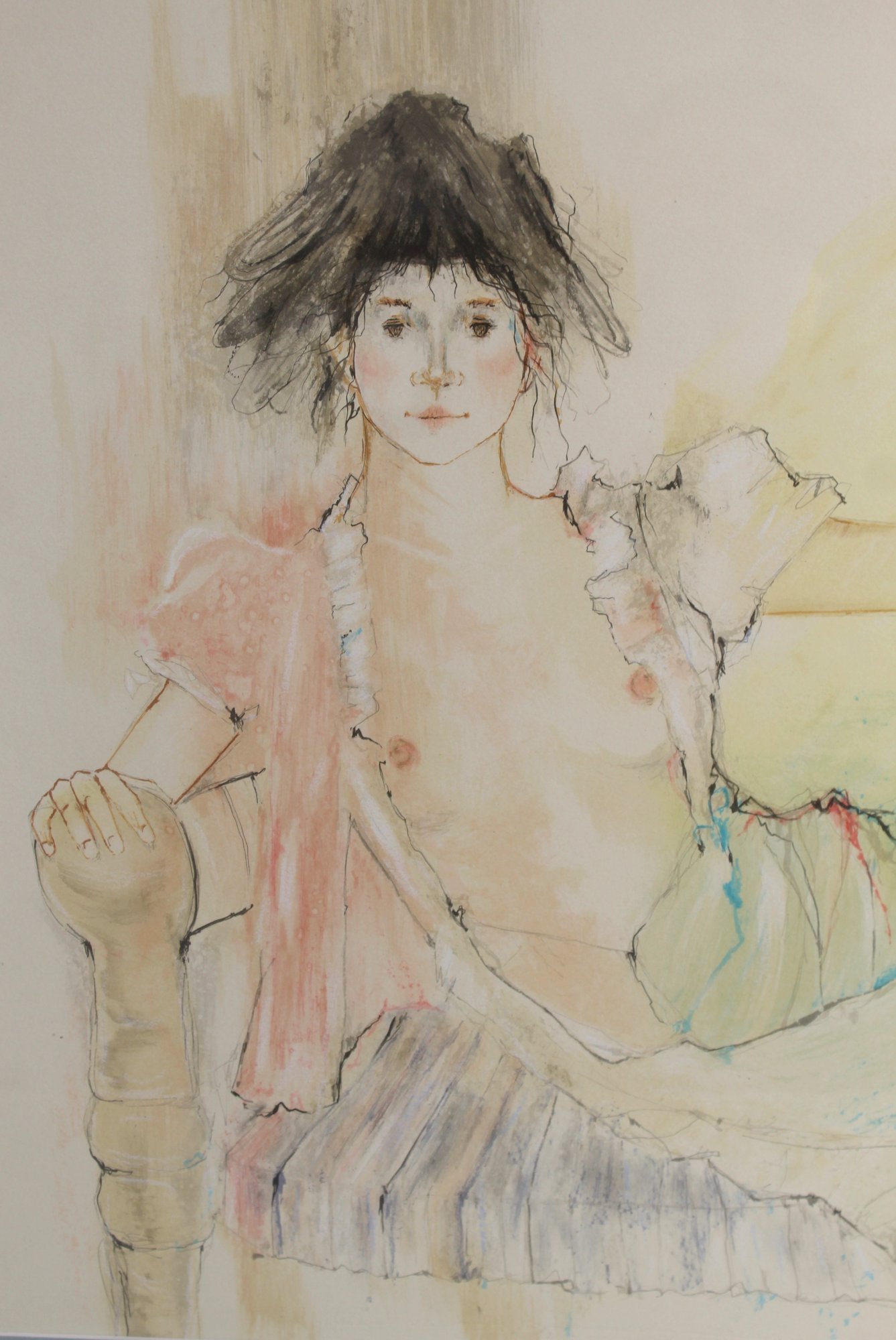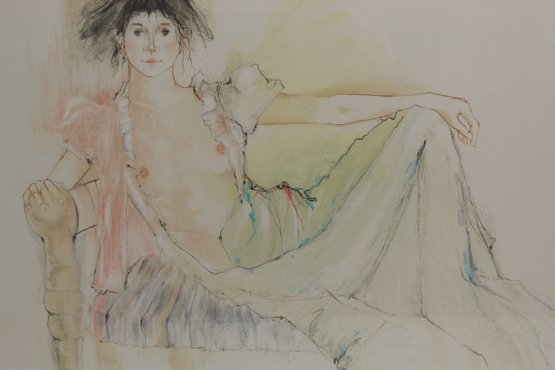 Graceful and intimate, this elegant artwork titled “Debra” by Sabell captures the artist’s refined sensitivity to feminine beauty and emotion. The piece portrays a reclining woman in soft pastel tones, rendered with delicate linework and subtle color washes that create an ethereal, almost dreamlike presence.