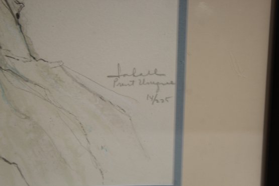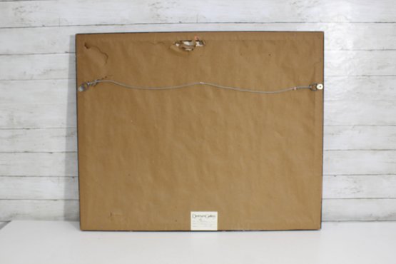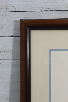 This limited-edition print is signed and numbered by the artist in the lower right corner and bears the Dyansen Gallery label on the reverse, confirming title, artist, and edition details. The print is beautifully presented under glass in a warm walnut wood frame with a cream mat and soft blue accent border.