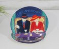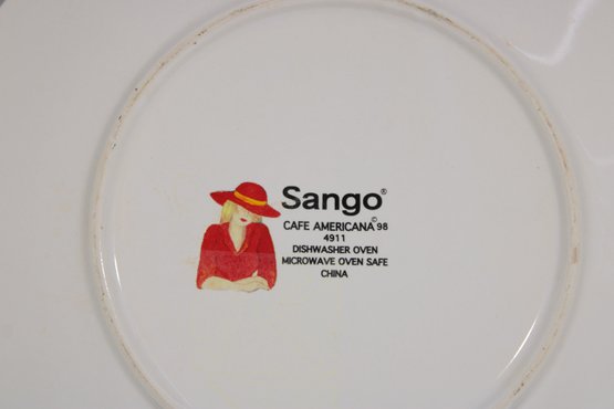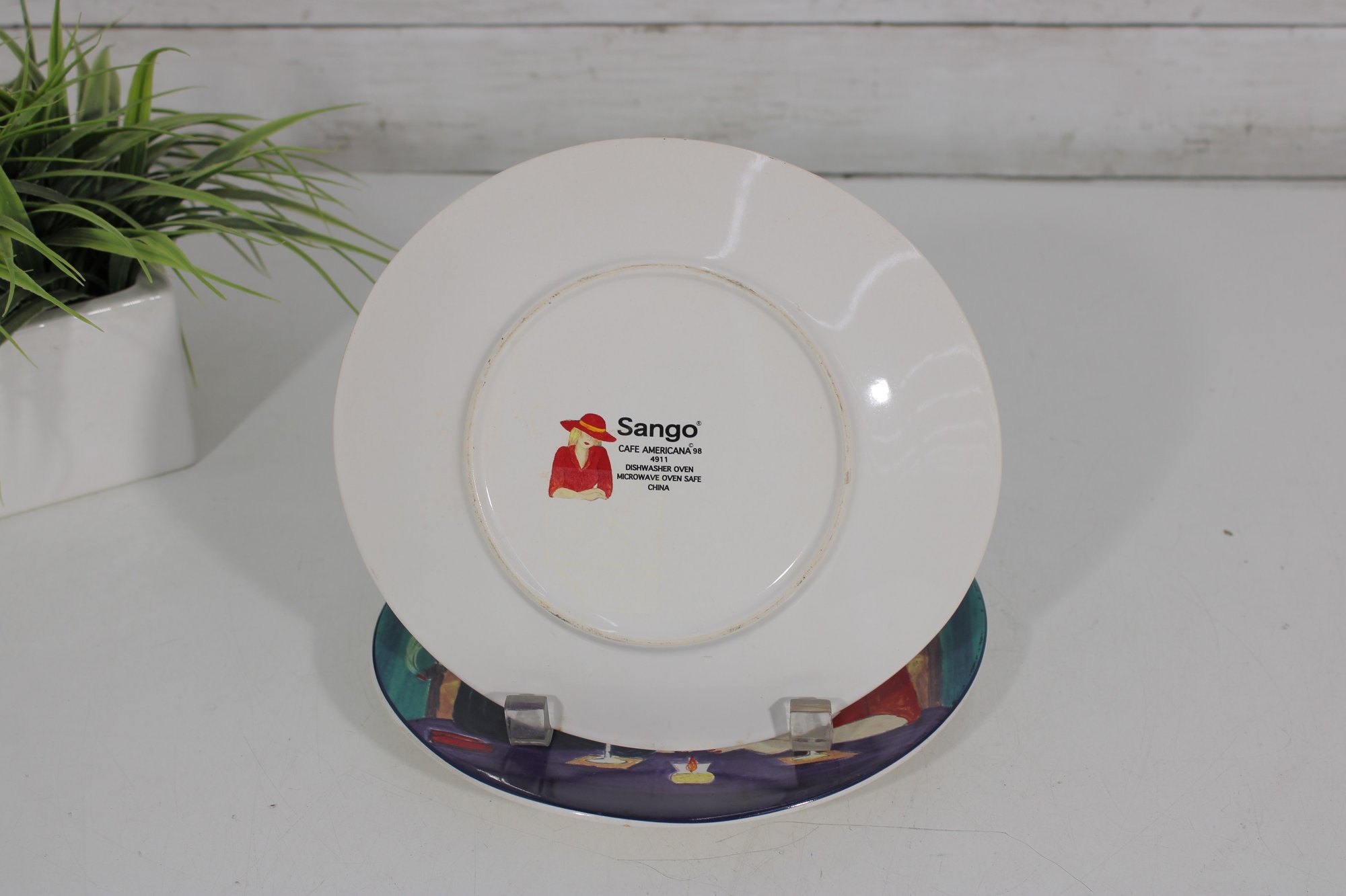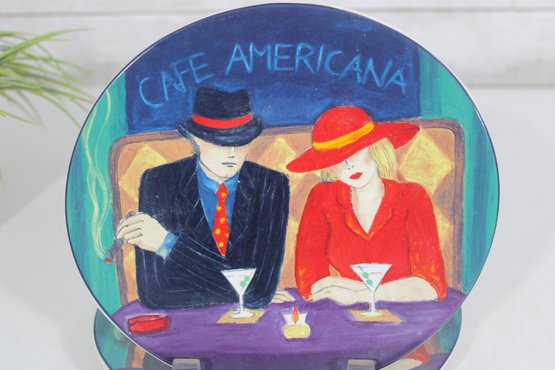 Stylish decorative plate from Sango’s Café Americana collection, featuring a vibrant Art Deco–inspired scene of a fashionable couple enjoying cocktails. The bold colors and elegant figures evoke a classic café atmosphere, with “Café Americana” lettering adding a distinctive touch.